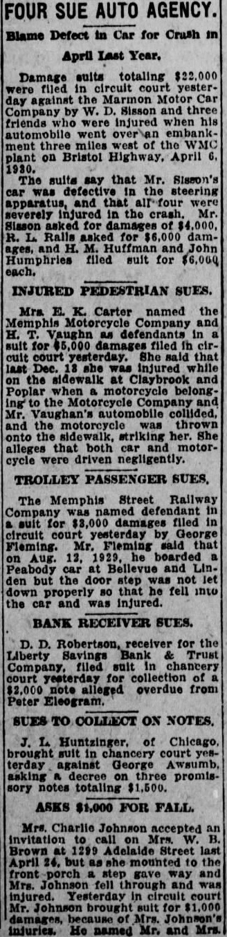 FOUR SUE AUTO AGENCY. Blame Defect in Car for Crush in April Last Year. Damage suits totaling $22,000 were filed in circuit court yesterday against the Marmon Motor Car Company by W. D. Sisson and three friends who were injured when his automobile went over an embankment three miles west of the WMC plant on Bristol Highway, April 6, 1930. The suite say that Mr. Sisson's car was defective in the steering apparatus, and that all four were severely injured in the crash. Mr. Sisson asked for damages of $4,000. R. L. Ralls asked for $6,000 damages, and H. M. and John Humphries filed suit for $6,000 each. INJURED PEDESTRIAN SUES. Mrs. E. K. Carter named the Memphis Motorcycle Company and H. T. Vaughn as defendants in suit for $5,000 damages filed in circuit court yesterday. She said that Dec. 18 she was injured while on the sidewalk at Claybrook and Poplar when otorcycle belongto the Motorcycle Company and Mr. Vaughan's collided. and the motorcycle was thrown onto the sidewalk, striking her. She alleges that both car motorcycle were driven negligently. TROLLEY PASSENGER SUES. The Memphis Street Railway Company named in a suit for $3,000 damages filed in circuit court yesterday by George Fleming. Mr. Fleming said that on Aug. 12, 1929, he boarded a Peabody car at Bellevue and Linden but the door step was not let down properly so that he fell into the car and was injured. BANK RECEIVER SUES. D. D. Robertson, receiver for the Liberty Savings Bank Trust Company, filed suit In chancery court yesterday for collection of a $2,000 note alleged overdue from Peter Eleogram. SUES TO COLLECT ON NOTES. J. L Huntzinger. of Chicago, brought suit in chancery court terday against George Awsumb, asking decree on three promissory notes totaling $1,500. ASKS $1,000 FOR FALL. Mrs. Charlie Johnson accepted an invitation to call on Mrs. W. B. Brown at 1299 Adelaide Street last April 24. but as she mounted to the front porch a step gave way and Mrs. Johnson fell through and was injured. Yesterday in court Mr. Johnson brought suit for $1,000 damages, because of Mrs. Johnson's injuries. He named Mr. and Mrs.