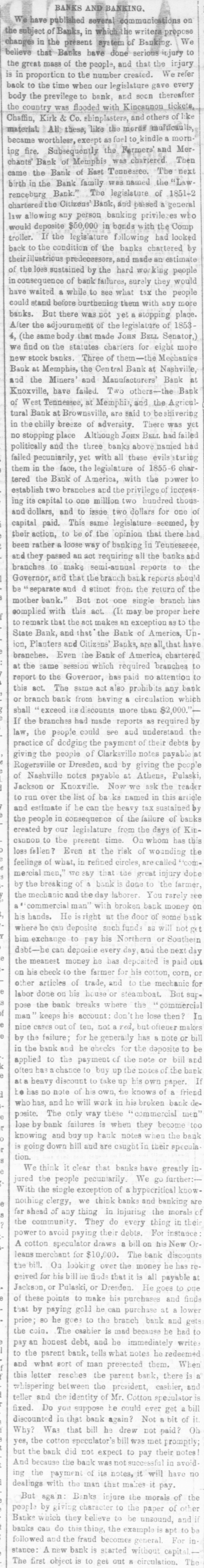 # BANKS AND BANKING. We have published several communications on the subject of Banks, in which the writers propose changes in the present system of Banking. We believe that Barks have done serious injury to the great mass of the people, and that the injury is in proportion to the number created. We refer back to the time when our legislature gave every body the previlege to bank, and soon thereafter the country was flooded with Kincannon tickets, Chaffin, Kirk & Co. shinplasters, and others of like material. All these, like the moras multicaulis, became worthless, except as fuel to kindle a morning fire. Subsequently the Fermers' and Merchants Bank of Memphis was chartered. Then came the Bank of East Tennessee. The next birth in the Bank family was named the "Lawrenceburg Bank." The legislature of 1851-2 chartered the Citizens' Bank, and passed a general law allowing any person banking privilezes who would deposite $50,000 in bonds with the Comptroller. If the legislature following had looked back to the condition of the banks chartered by their illustrious predecessors, and made an estimate of the loss sustained by the hard working people in consequence of bank failures, surely they would have waited a while to see what tax the people could stand before burthening them with any more banks. But there was not yet a stopping place. After the adjournment of the legislature of 1853-4, (the same body that made JOHN BELL Senator,) we find on the statutes charters for eight more new stock banks. Three of them the Mechanics Bauk at Memphis, the Central Bank at Nashville, and the Miners' and Manufacturers' Bank at Knoxville, have failed. Two others the Bank of West Tennessee, at Memphis, and the Agricultural Bank at Brownsville, are said to be shivering in the chilly breeze of adversity. There was yet no stopping place Although JOHN BELL had failed politically and the three banks above named had failed pecuniarily, yet with all these evils staring them in the face, the legislature of 1855-6 chartered the Bank of America, with the power to establish two branches and the privilege of incressing its capital to one million two hundred thousand dollars, and to issue two dollars for one of capital paid. This same legislature seemed, by their action, to be of the opinion that there had been rather a loose way of banking in Tennesseee, and they passed an act requiring all the banks and branches to make semi-annual reports to the Governor, and that the branch bark reports should be "separate and d stinct from the return of the mother bank." But not one single branch has complied with this act. (It may be proper here to remark that the act makes an exception as to the State Bank, and that the Bank of America, Union, Planters and Citizens' Banks, are all that have branches. Even the Bank of America, chartered at the same session which required branches to report to the Governor, has paid no attention to this act. The same act also prohibits any bank or branch bank from having a circulation which shall "exceed its discounts more than $2,000." If the branches had made reports as required by law, the people could see and understand the practice of dodging the payment of their debts by giving the people of Clarksville notes payable at Rogersville or Dresden, and by giving the people of Nashville notes payable at Athens, Pulaski, Jackson or Knoxville. Now we ask the reader to run over the list of baks named in this article and estimate if he can the heavy tax sustained by the people in consequence of the failure of banks ereated by our legislature from the days of Kincannon to the present time. On whom has this loss fallen? Even at the risk of wounding the feelings of what, in refined circles, are called "commercial men," we say that the great injury dote by the breaking of a bank is done to the farmer, the mechanic and the day laborer. You rarely see a "commercial man" with broken bank money on his hands. He is right at the door of some bank where he can deposite such funds as will not get him exchange to pay his Northern or Southern debt he can deposite every day, and the next day the meanest money he has deposited is paid out on his check to the farmer for his cotton, corn, or other articles of trade, and to the mechanic for labor done on his house or steamboat. But suppose the bank breaks where the "commercial man" keeps his account: don't he lose then? In nine cases out of ten, not a red, but oftener makes by the failure; for he generally has a note or bill in the bank and he checks for the deposite to be applied to the payment of the note or bill ard often has a chance to buy up the notes of the bank at a heavy discount to take up his own paper. If he has no note of his own, he knows of a friend who has, and he will work in his broken bank deposite. The only way these "commercial men" lose by bank failures is when they become too knowing and buy up tank notes when the bank is going down hill and are caught in their speculation. We think it clear that banks have greatly injured the people pecuniarily. We go further:- With the single exception of a hypocritical know-nothing clergy, we think banks and banking are far shead of any thing in injuring the morals of the community. They do every thing in their power to avoid paying their debts. For instance: A cotton speculator draws a bill on his New Orleans merchant for $10,000. The bank discounts the bill. On looking over the money he has received for his bill he finds that it is all payable at Jackson, or Pulaski, or Dresden. He goes to one of these points to make his purchases and finds that by paying gold he can purchase at a lower price; so he goes to the branch bank and gets the coin. The cashier is mad because he had to pay an honest debt, and he immediately writes to the parent bank, tells what notes he redeemed fand what sort of man presented them. When this letter reaches the parent bank, there is a whispering between the president, cashier, and teller