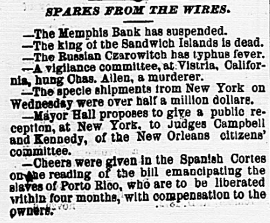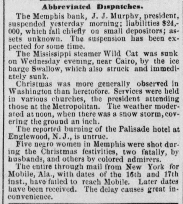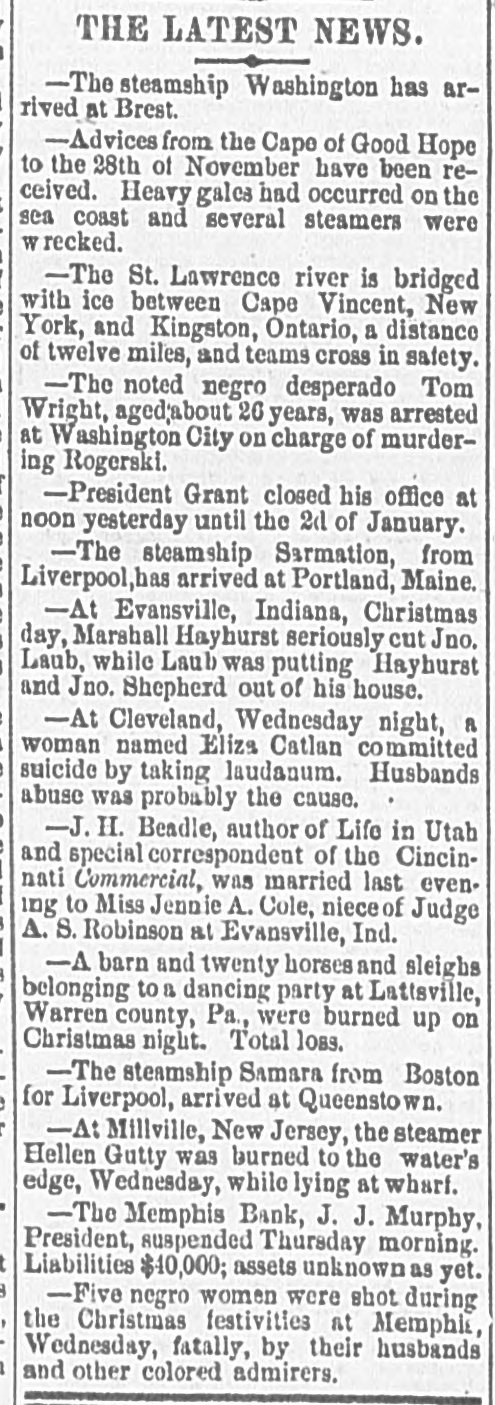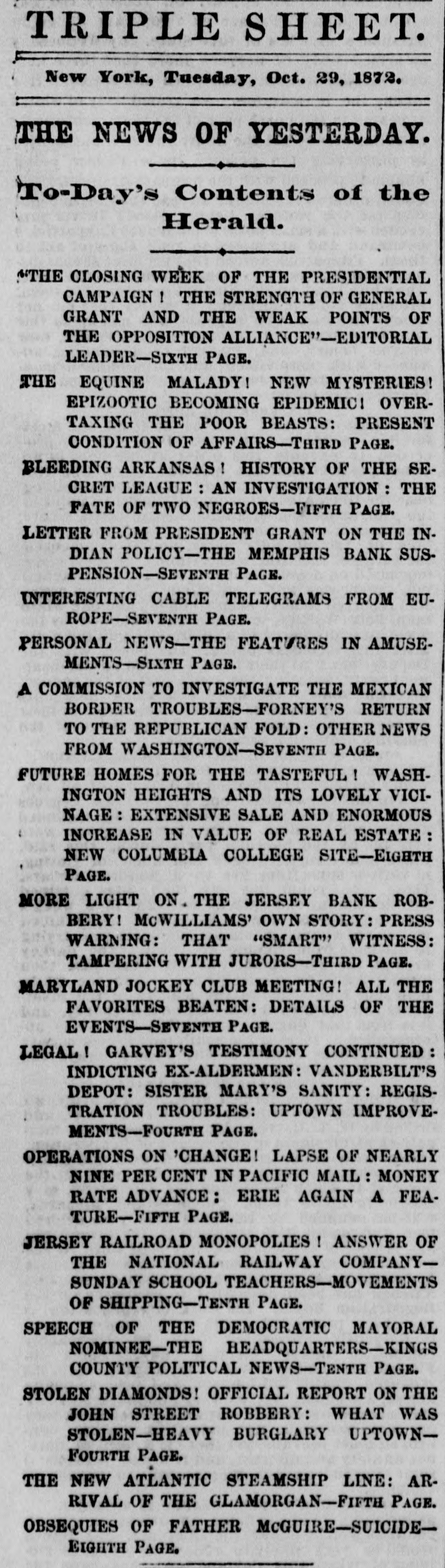 TRIPLE SHEET. New York, Tuesday, Oct. 29, 1872. THE NEWS OF YESTERDAY. To-Day's Contents of the Herald. ."THE CLOSING WEEK OF THE PRESIDENTIAL CAMPAIGN ! THE STRENGTH OF GENERAL GRANT AND THE WEAK POINTS OF THE OPPOSITION ALLIANCE"-EDITORIAL LEADER-SIXTH PAGE. THE EQUINE MALADY! NEW MYSTERIES! EPIZOOTIC BECOMING EPIDEMIC: OVERTAXING THE POOR BEASTS: PRESENT CONDITION OF AFFAIRS-THIRD PAGE. BLEEDING ARKANSAS ! HISTORY OF THE SECRET LEAGUE : AN INVESTIGATION THE FATE OF TWO NEGROES-FIFTH PAGE. LETTER FROM PRESIDENT GRANT ON THE INDIAN POLICY-THE MEMPHIS BANK SUSPENSION-SEVENTH PAGE. INTERESTING CABLE TELEGRAMS FROM EUROPE-SEVENTH PAGE. PERSONAL NEWS-THE FEATURES IN AMUSEMENTS-SIXTH PAGE. A COMMISSION TO INVESTIGATE THE MEXICAN BORDER TROUBLES-FORNEY'S RETURN TO THE REPUBLICAN FOLD: OTHER NEWS FROM WASHINGTON-SEVENTH PAGE. FUTURE HOMES FOR THE TASTEFUL! WASHINGTON HEIGHTS AND ITS LOVELY VICINAGE: EXTENSIVE SALE AND ENORMOUS INCREASE IN VALUE OF REAL ESTATE: NEW COLUMBIA COLLEGE SITE-EIGHTH PAGE. MORE LIGHT ON. THE JERSEY BANK ROBBERY! McWILLIAMS' OWN STORY: PRESS WARNING: THAT "SMART" WITNESS: TAMPERING WITH JURORS-THIRD PAGE. MARYLAND JOCKEY CLUB MEETING! ALL THE FAVORITES BEATEN: DETAILS OF THE EVENTS-SEVENTH PAGE. LEGAL GARVEY'S TESTIMONY CONTINUED: INDICTING EX-ALDERMEN: VANDERBILT'S DEPOT: SISTER MARY'S SANITY: REGISTRATION TROUBLES: UPTOWN IMPROVEMENTS-FOURTH PAGE. OPERATIONS ON 'CHANGE! LAPSE OF NEARLY NINE PER CENT IN PACIFIC MAIL : MONEY RATE ADVANCE: ERIE AGAIN A FEATURE-FIFTH PAGE. JERSEY RAILROAD MONOPOLIES ! ANSWER OF THE NATIONAL RAILWAY COMPANYSUNDAY SCHOOL TEACHERS-MOVEMENTS OF SHIPPING-TENTH PAGE. SPEECH OF THE DEMOCRATIC MAYORAL NOMINEE-THE HEADQUARTERS-KINGS COUNTY POLITICAL NEWS-TENTH PAGE. STOLEN DIAMONDS! OFFICIAL REPORT ON THE JOHN STREET ROBBERY: WHAT WAS STOLEN-HEAVY BURGLARY UPTOWNFOURTH PAGE. THE NEW ATLANTIC STEAMSHIP LINE: ARRIVAL OF THE GLAMORGAN-FIFTH PAGE. OBSEQUIES OF FATHER McGUIRE-SUICIDEEIGHTH PAGE.