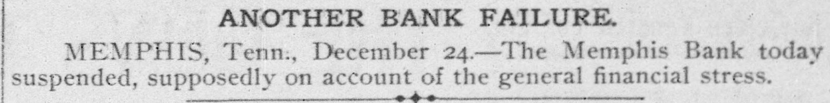 ANOTHER BANK FAILURE. MEMPHIS, Tenn:, December 24.-The Memphis Bank today suspended, supposedly on account of the general financial stress.