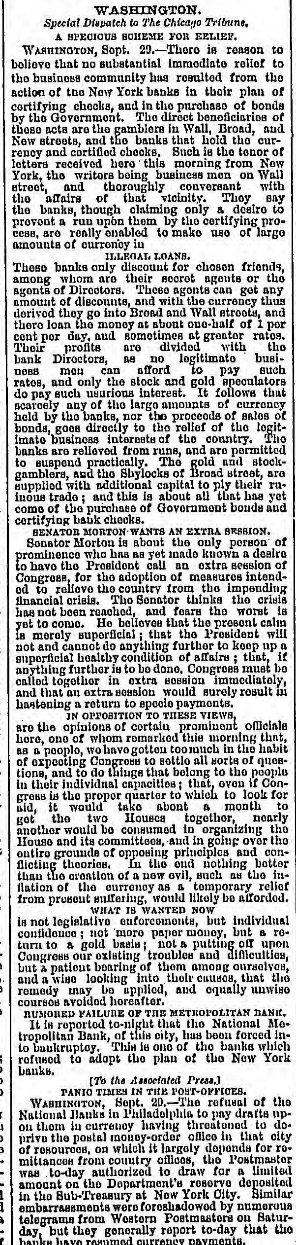 WASHINGTON. Special Dispatch to The Chicago Tribune, A SPECIOUS SCHEME FOR EELIEF. WASHINGTON, Sopt. 20. There is reason to believe that no substantial immediate relief to the business community has resulted from the action of the New York banks in their plan of cortifying checks, and in the purchase of bonds by the Government. The direct beneficiarios of these acts are the gamblers in Wall, Broad, and New streets, and the banks that hold the currency and cortified checks, Such is the tenor of letters received here this morning from Now York, the writers being business men on Wall street, and thoroughly conversant with the affairs of that vicinity. They say the banks, though claiming only a desiro to prevent a run upon them by the certifying process, are really enabled to make use of large amounts of currency in ILLEGAL LOANS. These banks only discount for chosen friends, among whom are their secret agents or the agents of Directors. These agonts can get any amount of discounts, and with the currency thus derived they go into Broad and Wall stroots, and there loan the money at about one-half of 1 per cent per day, and sometimes at grentor rates. Their profits are divided with the bank Directors, as no legitimato business men can afford to pay such rates, and only the stock and gold speculators do pay such usurious interest. It follows that scarcely any of the large amounts of currency held by the banks, nor the proceeds of sales of bonds, goes directly to the relief of the logit-imato business interests of the country. The banks are relieved from runs, and are permitted to suspend practically. The gold and stock-gamblers, and the Shylocks of Broad street, aro supplied with additional capital to ply their ruinous trade; and this is about all that has yet come of the purchase of Government bonds and certifying bank checks. SENATOR MORTON WANTS AN EXTRA BESSION. Sonator Morton is about the only person of prominence who has as yet made known a desiro to have the President call an extra session of Congress, for the adoption of measures intended to relieve the country from the impending financial crisis. The Senator thinks the crisis has not been reached, and fears the worst is yet to come. He believes that the present calm is merely superficial; that the President will not and cannot do anything further to keep up a superficial healthy condition of affairs; that, if anything further is to bo done, Congress must be called together in extra sossion immediately, and that an oxtra session would surely result in hastening a return to specie payments. IN OPPOSITION TO THESE VIEWS, are the opinions of certain prominent officials hore, one of whom romarked this morning that, as a peoplo, wo have gotten toomuch in the habit of expecting Congress to settle all sorts of ques-tione, and to do things that belong to the people in their individual capacities; that, oven if Con-gress is the proper quarter to which to look for aid, it would take abont a month to get the two Houses together, nearly another would be consumed in organizing the House and its committees, and in going over the entire grounds of opposing principles and con-flicting theories. In the end nothing better than the creation of a now evil, such as the in-flation of the currency as a temporary relief from present suffering, would likely be afforded. WHAT IS WANTED NOW is not legislativo enforcements, but individual confidence; not moro paper money, but a re-turn to a gold basis; not a putting off upon Congress our existing troubles and dificulties, but a patient bearing of them among ourselves, and a wiso looking into their causes, that the remedy inny be applied, and equally unwise courses avoided horeafter. RUMORED FAILURE OF THE METROPOLITAN BANK. It is reported to-night that the National Me-tropolitan Bank, of this city, has been forced into baukruptcy. This is one of the banks which refused to adopt the plan of the New York banks. [To the Associated Press.] ΓΑΝΙΟ ΤΙΜES IN THE POST-OFFICES. WASHINGTON, Sept. 20. The refusal of the National Bauks in Philadelphia to pay drafts upon thom in currency having threatened to de-prive the postal money-order office in that city of resources, on which it largely deponds for ro-mittances from country offices, the Postmaster was to-day authorized to draw for a limited amount on the Department's roserve deposited in the Sub-Treasury at New York City. Similar embarrassments were foreshadowed by numerous telegrams from Western Postmasters on Satur-day, but they generally report to-day that the hanka hayo rosumod currency payments.