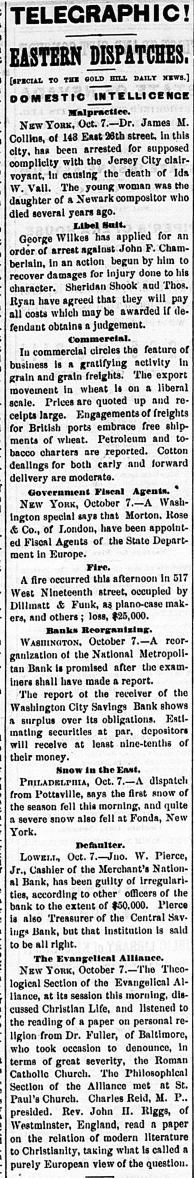 TELEGRAPHIC! EASTERN DISPATCHES. [SPECIAL TO THE GOLD HILL DAILY NEWS.] DOMESTIC INTELLICENCE Malpractice. NEW YORK, Oct. 7.-Dr. James M. Collins, of 143 East 26th street. in this city, has been arrested for supposed complicity with the Jersey City clairvoyant, in causing the death of Ida W. Vall. The young woman was the daughter of a Newark compositor who died several years ago. Libel Suit. George Wilkes has applied for an order of arrest against John F. Chamberlain, in an action begun by him to recover damages for Injury done to his character. Sheridan Shook and Thos. Ryan have agreed that they will pay all costs which may be awarded If defendant obtains a judgement. Commercial. In commercial circles the feature of business is a gratifying activity In grain and grain freights. The export movement in wheat is on a liberal scale. Prices are quoted up and recelpts large. Engagements of freights for British ports embrace free shipments of wheat. Petroleum and tobacco charters are reported. Cotton dealings for both carly and forward delivery are moderate. Government Fiscal Agents. NEW YORK, October 7.-A Washington special says that Morton. Rose & Co., of London, have been appointed Fiscal Agents of the State Department in Europe. Fire. A fire occurred this afternoon in 517 West Nineteenth street, occupied by Dillmatt & Funk, as plano-case makers, and others; loss, $25,000. Banks Reorganizing. WASHINGTON. October 7.-A reorganization of the National Metropolitan Bank is promised after the examiners shall have made a report. The report ot the receiver of the Washington City Savings Bank shows a surplus over its obligations. Estimating securities at par, depositors will receive at least nine-tenths of their money. Snow in the East. PAILADELPHIA, Oct. 7.-A dispatch from Pottaville, says the first snow of the season fell this morning, and quite a severe snow also fell at Fonda, New York. Defaulter. LOWELL, Oct. 7.-Juo. W. Pierce, Jr., Cashier of the Merchant's National Bank, has been guilty of irregularities, according to other officers of the bank to the extent of $50,000. Pierce is also Treasurer of the Central Savings Bank, but that institution is said to be all right. The Evangelical Alliance. NEW YORK, October 7.-The Theological Section of the Evangelical Alliance, at its session this morning, discussed Christian Life, and listened to the reading of a paper on personal religion from Dr. Fuller, of Baltimore, who took occasion to denounce, in terms of great severity, the Roman Catholic Church. The Philosophical Section of the Alliance met at St. Paul's Church. Charles Reid, M. P.. presided. Rev. John H. Riggs, of Westminster, England, read a paper on the relation of modern literature to Christianity, taking what is called a purely European view of the question.
