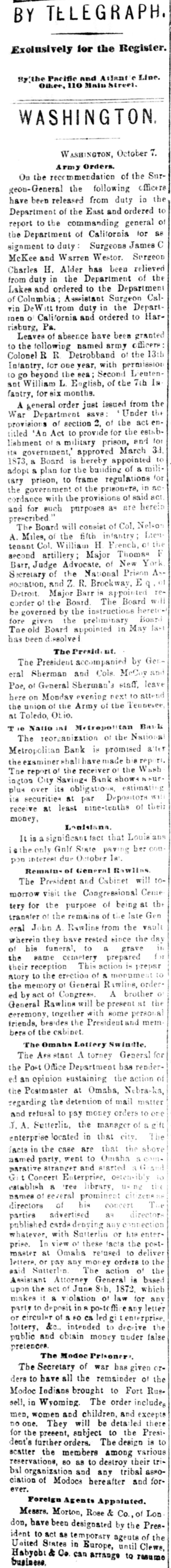 BY TELEGRAPH. Exclusively for the Register. Hy the Pacific and Adjunt Line. Other, 110 Main street. WASHINGTON W ASHINGTON, October 7. Army Orders. On the recommendation of the Surgeon-General the following officere have been released from duty in the Department of the East and ordered to report to the commanding general of the Department of California for as signment to duty Surgeons James C McKee and Warren Westor. Surgeon Charles H. Alder has been relieved from duty in the Department of the Lakes and ordered to the Department of Columbia Assestant Surgeon Cal. vin DeWitt from duty in the Departmen California and ordered to Harrisburg, Pa Leaves of absence have been granted to the following named army officers Colonel R R Detrobband of the 13th Infantry. for one year, with permission go beyond the sea; Second Leutenant William L. English, of the 7th IN fantry. for six months. A general order just issued from the War Department save Under the provisions of section 2. of the act entitled 'An Act to provide for the establiabment of military prison, and for its government," approved March 3d. 1873, a Board is hereby appointed adopt a plan for the building of mili(ary prison, to frame regulations for the government of the prisonere, in &C cordance with the provisions of said act and for such purposes as are herein prescribed The Board will consist of Col. Nelso A. Miles, of the fifth infantry Lieu tenant Col. William H French, of the F second artillery Major Thomas Barr, Judge Advocate. of New York Secretary of the National Prison Ass sociation, and Z. R. Brockway, Detroit Major Barr is appointed corder of the Board The Board will be governed by the instructions heretefore given the preliminary Board Toe old Board appointed in May last has been dissolved The Presid. ut. The President accompanied by Get eral Sherman and Cols. McCov and Poe, of General Sherman's staff, leave here on Monday evening next to attend the union the Army of the Tennesee at Toledo, Otio. The Natio al Metrepoltan Basil The reorganization of the National Metropolitan Bank is promised siles the examiner shall have made bisrep The report of the receiver o the Wash ington City Savings Bank show -unplus over its obligations, estimating its securities at par Depositors receive at least nine-tenths of their money, Louisiana It is a significant fact that Louis athe only Gnlf State paving ber con pon interest due October la Remain- of General Rawlins The President and Cabinet will tomorrow visit the Congressional Cente tery for the purpose of being at the transfer of the remains of the late Gen eral John A Rawline from the vault wherein they have rested since the day of his funeral to a grave the same cemetery prepared their reception This action is prepar atory to the erection of & monument the memory of General R twling, ordered by act of Congress A brother General Rawlina will be present at the ceremony, together with some personal friends, besides the President and mem bere of the cabinet The Omaba Lottery Swindle The Ass stant A torney General for the Post Office Department has rendered an opinion sustaining the action the Postmaster at Omaha, Nebra-ka, regarding the detention of mail matter and retural to pay money orders to A. Sutterlin, the manager of & enterprise located in that city. facts in the case are that the above asmed party, went to Omaha parative stranger and started Git Concert Enterprise. oetentibly establish 8 'ree library. us ng names of several prominest citizens directors of his concert parties advertised 84 directors published cards densing any connection whatever. with Satterlin or his enterprise. In view of these facts the postmaster at Omaha refused to deliver lettere or pay any money orders to the paid Satterlin The action of the Assistant Attorney General is based upon the act of June 8th, 1872 which makes it 8 iolation of law for any part to deposit in poste fliceary letter or circular of 80 caled enterprise lottery, &c., intended to deceive the public and obtain money under false pretences. The Modee Prisoner The Secretary of war has given dera to have all the remsinder of the Modoc Indians brought to Fort Rue. sell, in Wyoming. The order include men, women and children, and excepts Do one. They will be detailed there for the present, subject to the President's further orders. The design is to scatter the members among various reservations, 80 as to destroy their tribal organization and any tribal association of Modocs hereafter and forever. Foreign Agents Appaluted. Messre. Morton, Rose & Co., of Lon don, have been designated by the President to act as temporary ageuts of the United States in Europe, until Clews, Habyob: & Co. can arrange to resume business