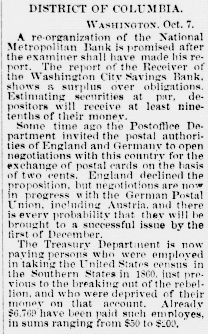 DISTRICT OF COLUMBIA. WASHINGTON. Oct. 7. A re-organization of the National Metropolitan Bank is promised after the examiner shall have made his report. The report of the Receiver of the Washington City Savings Bank. shows a surplus over obligations. Estimating securities at par, depositors will receive at least ninetenths of their monev. Some time ago the Postoffice Department invited the postal authorities of England and Germany to open negotiations with this country for the exchange of postal cards on the basis of two cents. England declined the proposition, but negotiotions are now in progress with the German Postal Union, including Austria. and there is every probability that they will be brought to a successful issue by the first of December. The Treasury Department is now paying persons who were employed in taking the United States census in the Southern States in 1860. just previous to the breaking out of the rebellion, and who were deprived of their money on that account. Already $6,769 have been paid such employes, in sums ranging from $50 to $200.