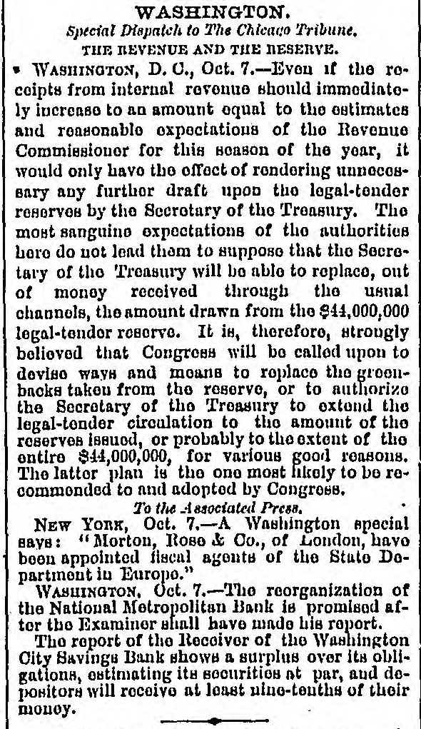 WASHINGTON. Special Dispatch to The Chicago Tribune. THE REVENUE AND THE RESERVE. WASHINGTON, D. C., Oct. 7.-Even if the recoipts from internal revenue should immodiatoly increase to an amount equal to the estimates and reasonable expectations of the Revenue Commissioner for this season of the year, it would only have the effect of rendering unnecessary any further draft upon the legal-tender reserves by the Secretary of the Treasury. The most sanguino expectations of the authorities here do not lead them to suppose that the Secretary of the Treasury will be ablo to replace, out of money received through the usual channels, the amount drawn from the $44,000,000 legal-tender reserve. It is, therefore, strougly believed that Congress will be called upon to deviso ways and moans to replace the greenbacks taken from the reserve, or to authorize the Secretary of the Treasury to extend the legal-tender circulation to the amount of the reserves issued, or probably to the extent of the entire $44,000,000, for various good reasons. The latter plan is the one most likely to be recommonded to and adopted by Congress. To the Associated Press. NEW YORK, Oct. 7.-A Washington special says: "Morton, Rose & Co., of London, have been appointed fiscal agents of the State Dopartment in Europo." WASHINGTON, Oct. 7.-The reorganization of the National Metropolitan Bank is promised after the Examiner shall have made his report. The report of the Receiver of the Washington City Savings Bank shows a surplus over its obligations, estimating its securities at par, and depositors will receive at least nine-tenths of their monoy.