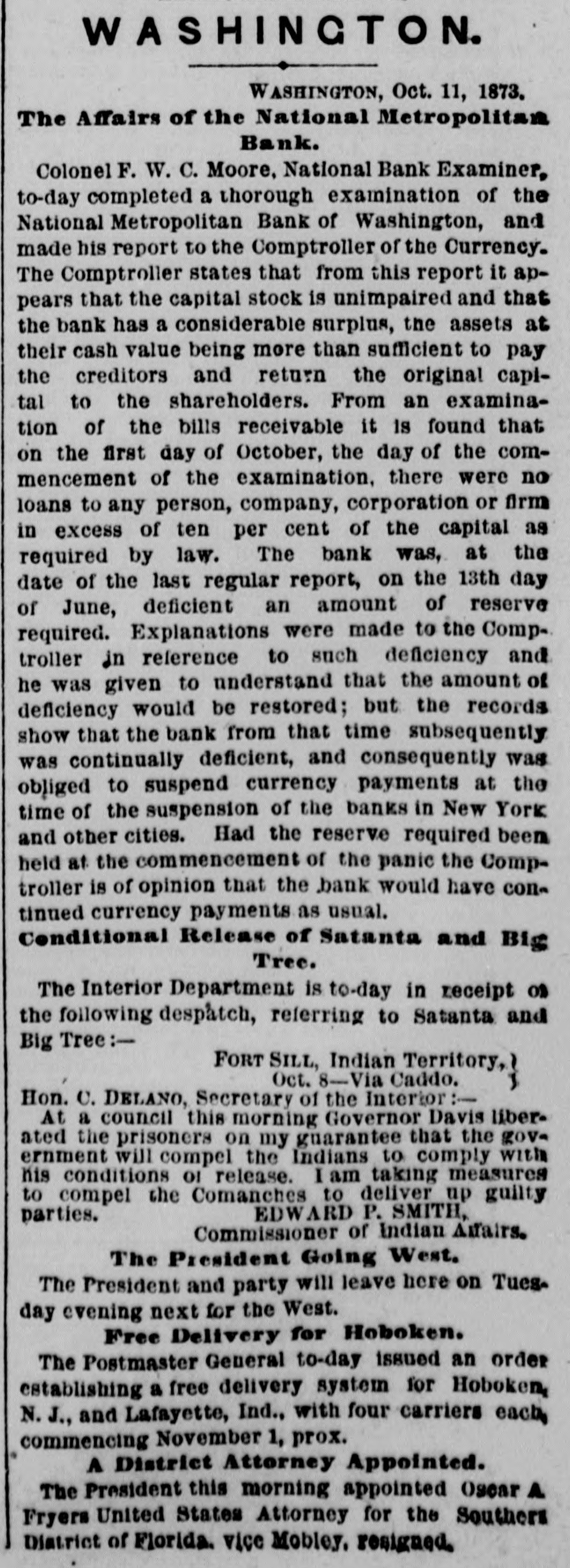 WASHINGTON. WASHINGTON, Oct. 11, 1873. The Affairs of the National Metropolitan Bank. Colonel F. W. C. Moore, National Bank Examiner, to-day completed a thorough examination of the National Metropolitan Bank of Washington, and made his report to the Comptroller of the Currency. The Comptroller states that from this report it appears that the capital stock is unimpaired and that the bank has a considerable surplus, the assets at their cash value being more than sufficient to pay the creditors and return the original capital to the shareholders. From an examination of the bills receivable it is found that on the first day of October, the day of the commencement of the examination, there were no loans to any person, company, corporation or firm in excess of ten per cent of the capital as required by law. The bank was, at the date of the last regular report, on the 13th day of June, deficient an amount of reserve required. Explanations were made to the Comptroller in reference to such deficiency and he was given to understand that the amount of deficiency would be restored; but the records show that the bank from that time subsequently was continually deficient, and consequently was obliged to suspend currency payments at the time of the suspension of the banks in New York and other cities. Had the reserve required been held at the commencement of the panic the Comptroller is of opinion that the bank would have continued currency payments as usual. Conditional Release of Satanta and Big Tree. The Interior Department is to-day in receipt or the following despatch, referring to Satanta and Big Tree:FORT SILL, Indian Territory, Oct. 8-Via Caddo. Hon. C. DELANO, Secretary of the Interior:At a council this morning Governor Davis liberated the prisoners on my guarantee that the government will compel the Indians to comply with his conditions OI release. I am taking measures to compel the Comanches to deliver up guilty EDWARD P. SMITH, parties. Commissioner of Indian Affairs. The President Going West. The President and party will leave here on Tues. day evening next for the West. Free Delivery for Hoboken. The Postmaster General to-day issued an order establishing a free delivery system for Hoboken, N. J., and Lafayette, Ind., with four carriers each, commencing November 1, prox. A District Attorney Appointed. The President this morning appointed Oscar A Fryers United States Attorney for the Southers Diatrict of Florida. vice Mobley. resigned.