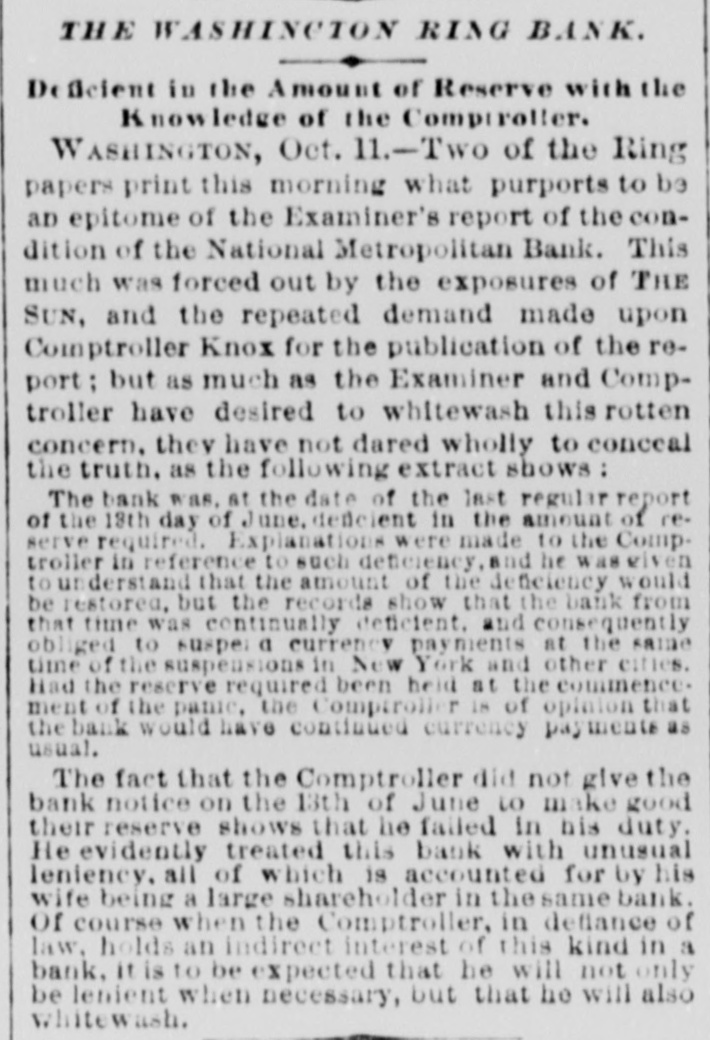 THE WASHINCTON RING BANK. Scient in the Amount of Reserve with the Know ledge of the Compreller. WASHINGTON, Oct. 11.-Two of the Ring papers print this morning what purports to be an epitome of the Examiner's report of the condition of the National Metropolitan Bank. This much was forced out by the exposures of THE SUN, and the repeated demand made upon Comptroller Knox for the publication of the report; but as much as the Examiner and Comptroller have desired to whitewash this rotten concern. they have not dared wholly to conceal the truth. as the following extract shows: The bank was. at the date of the last regular report of the 18th day of June, deficient in the amount of reserve required. Explanations were made to the Comptroller in reference to such deficiency. and he waselven to understand that the amount of the deficiency would be restored. but the records show that the bank from that time was continually deficient. and consequently obliged to suspe a currency payments at the same time of the suspensions in New York and other cities. Had the reserve required been held at the commence. ment of the panic. the Comptroller 18 of opinion that the bank would have continued currency payments as usual. The fact that the Comptroller did not give the bank notice on the 13th of June to make good their reserve shows that he failed in his duty. He evidently treated this bank with unusual leniency, all of which is accounted for by his wife being a large shareholder in the same bank. Of course when the Comptroller, in deflance of law. holds an indirect interest of this kind in a bank. it is to be expected that he will not only be lenient when necessary, but that he will also whitewash.