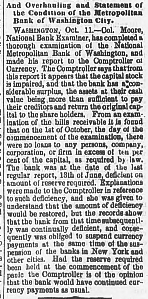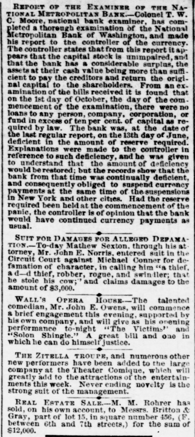 # REPORT OF THE EXAMINER OF THE NATIONAL METROPOLITAN BANK Colonel T. W. C. Moore, national bank examiner, has completed a thorough examination of the National Metropolitan Bank of Washington, and made his report to the controller of the currency. The controller states that from this report it appears that the capital stock is unimpaired, and that the bank has a considerable surplus, the assets at their cash value being more than sufficient to pay the creditors and return the original capital to the shareholders. From an examination of the bills received it is found that on the 1st day of October, the day of the commencement of the examination, there were no loans to any person, company, corporation, or fund in excess of ten per cent. of capital as required by law. The bank was, at the date of the last regular report, on the 13th day of June, deficient in the amount of reserve required. Explanations were made to the controller in reference to such deficiency, and he was given to understand that the amount of deficiency would be restored; but the records show that the bank from that time was continually deficient, and consequently obliged to suspend currency payments at the same time of the suspensions in New York and other cities. Had the reserve required been held at the commencement of the panic, the controller is of opinion that the bank would have continued currency payments as usual. # SUIT FOR DAMAGES FOR ALLEGED DEPAMATION To-day Mathew Sexton, through his attorney, Mr. John E. Norris, entered suit in the Circuit Court against Michael Conner for defamation of character, in calling him "a thief, a d-d thief, robber, rogue, and swindler; that he stole his cow;" and claims damages to the amount of $3,000. # WALL'S OPERA HOUSE The talented comedian, Mr. John E. Owens, will commence a brief engagement this evening, supported by his own company, and will give as his opening performance to-night "The Victims" and "Solon Shingle." A great bill and one in which he can do himself justice. # THE ZITELLA TROUPE THE ZITELLA TROUPE, and numerous other new performers have been added to the large company at the Theater Comique, which will greatly add to the attractions of the entertainments this week. Never ending novelty is the strong suit of the management. # REAL ESTATE SALE M. M. Rohrer has sold, on his own account, to Messrs. Britton & Gray, part of lot 15, in square number 456, (F. between 6th and 7th streets,) for the sum of $12,000.