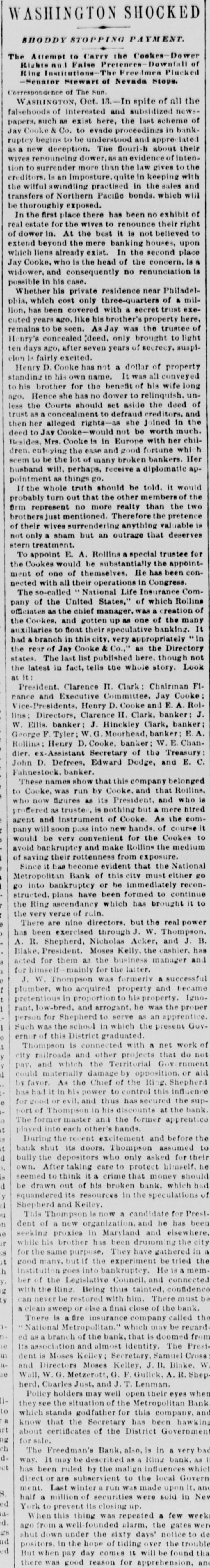 # WASHINGTON SHOCKED SHODDY STOPPING PAYMENT. The Attempt to Carry the Cookes-Dower Rights nul False Pretences-Downfall of Ring Institutions-The Freedmen Plucked -Senator Stewart of Nevada Stops. Correspondence of The Sun. WASHINGTON, Oct. 13. In spite of all the falsehoods of interested and subsidized news- papers, such as exist here, the last scheme of Jay Cooke & Co. to evade proceedings in bank- ruptcy begins to be understood and appreciated as a new deception. The flourish about their wives renouncing dower, as an evidence of inten- tion to surrender more than the law gives to the creditors, is an imposture, quite in keeping with the wilful swindling practised in the sales and transfers of Northern Pacific bonds, which wiil be thoroughly exposed. In the first place there has been no exhibit of real estate for the wives to renounce their right of dower in. At the best it is not believed to extend beyond the mere banking houses, upon which liens already exist. In the second place Jay Cooke, who is the head of the concern, is a widower, and consequently no renunciation is possible in his case. Whether his private residence near Philadel- phia, which cost only three-quarters of a mil- lion, has been covered with a secret trust exe- cuted years ago, like his brother's property here, remains to be seen. As Jay was the trustee of Henry's concealed deed, only brought to light ten days ago, after seven years of secrecy, suspi- cion is fairly excited. Henry D. Cooke has not a dollar of property standing in his own name. It was all conveyed to his brother for the benefit of his wife long ago. Hence she has no dower to relinquish, un- less the Courts should set aside the deed of trust as a concealment to defraud creditors, and then her alleged rights as she joined in the deed to Jay Cooke-would not be worth much. Besides, Mrs. Cooke is in Europe with her chil- dren, enjoying the ease and good fortune which seem to be the lot of many broken bankers. Her husband will, perhaps, receive a diplomatic ap- pointment as things go. If the whole truth should be told, it would probably turn out that the other members of the form represent no more realty than the two brothers just mentioned. Therefore the pretence of their wives surrendering anything valuable is not only a sham but an outrage that deserves stern treatment. To appoint E. A. Rollins a special trustee for the Cookes would be substantially the appoint- ment of one of themselves. He has been con- nected with all their operations in Congress. The so-called "National Life Insurance Com- pany of the United States," of which Rollins officiates as the chief manager, was a creation of the Cookes, and gotten up as one of the many auxillaries to float their speculative banking. It had a branch in this city, very appropriately "In the rear of Jay Cooke & Co.," as the Directory states. The last list published here, though not the latest in fact, tells the whole story. Look at it: President. Clarence II. Clark: Chairman Fi- rance and Executive Committee, Jay Cooke; Vice-Presidents, Henry D. Cooke and E. A. Rol- lins; Directors, Clarence H. Clark, banker: J. W. Ellis. banker: J. Hinckley Clark, banker; George F. Tyler; W. G. Moorhead, banker; E. A. Rollins; Henry D. Cooke, banker; W. E. Chan- dier, ex-Assistant Secretary of the Treasury: John D. Defrees, Edward Dodge, and E. C. Fahnestock, banker. These names show that this company belonged to Cooke, was run by Cooke, and that Rollins, who now figures as its President, and who is proffered as trusted, is nothing but a mere hired agent and instrument of Cooke. As the com- pany will soon pass into new hands, of course it would be very convenient for the Cookes to avoid bankruptcy and make Rollins the medium of saving their rottenness from exposure. Since it has become evident that the National ■Metropolitan Bank of this city must either go go into bankruptcy or be immediately recon- structed, plans have been formed to continue the Ring ascendancy which has brought it to the very verge of ruin. There are nine directors, but the real power has been exercised through J. W. Thompson. A. R. Shepherd, Nicholas Acker, and J. B. Blake, President. Moses Kelly, the cashier, has acted for them as the business manager and for himself-mainly for the latter. J. W. Thompson was formerly a successful plumber, who acquired property and became pretentious in proportion to his property. Igno- rant, low-bred, and arrogant, he was the proper person for Shepherd to serve as an apprentice. Such was the school in which the present Gov- ernor of this District graduated. Thompson is connected with a net work of city railroads and other projects that do not pay, and which the Territorial Government could materially damage by opposition, or aid by favor. As the Chief of the Ring, Shepherd has had it in his power to control this influence for good or evil, and thus has secured the sup- port of Thompson in his discounts at the bank. The former master and the former apprentice played into each other's hands. During the recent excitement and before the bank shut its doors, Thompson assumed to bully the depositors who only asked for their own. After taking care to protect himself, he seemed to think it a crime that money should be drawn out of bis broken bank, which had squandered its resources in the speculations of Shepherd and Kelley. This Thompson is now a candidate for Prest- dent of a new organization, and he has been seeking proxies in Maryland and elsewhere, while his brother has been drumming the city for the same purpose. They have gathered in a good many, but if the experiment be tried the institution goes into bankruptcy. He is a mem- ber of the Legislative Council, and connected with the Ring. Being thus tainted, confidenco can never be restored with him. There must be a clean sweep or else a final close of the bank. There is a fire insurance company called the "National Metropolitan," which may be regard- ed as a branch of t