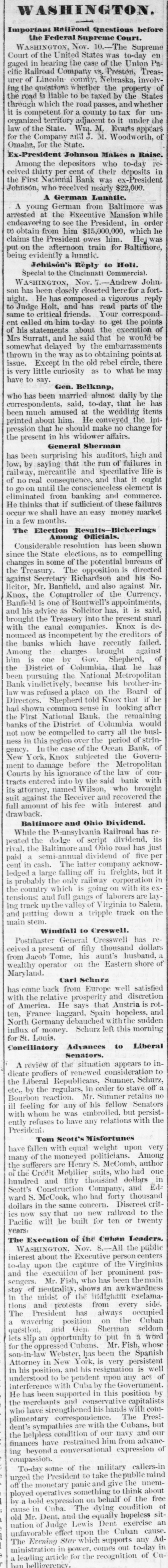 WASHIN GTON. Important Reilroad Questions before the Federal Supreme Court. WASHINGTON, Nov. 10 The Supreme Court of the United States was to-day gaged in hearing the case of the Union Pacitic Railroad Company vs. Preston Treascounty urer involvof Lincoln Nebraska, ing the questions whether the property of the road is liable to be taxed by the States through which the road passes. and hether it competent for county to tax for unorganized territory adiacent to under the law of the State. Wm. M. Evarts appear$ for the Company and J. M. Woodworth, of Omaha, For the State Ex-President Johnson Makes Raise. Among the depositors who to-day ceived thirty per cent of their deposits the First National Bank was ex -President Johnson, who received nearly $22,000. A German Lunatic. A young German from Baltimore was arrested at the Executive Mansion while endeavor ng to see the President, in order to obtain from him $15,000,000, which he claims the President owes him. Heiwas put.on the afternoon train for Baltimore being evidently lunati Jehison's Reply to Holt. Special to the Cincinnati Commercial WASHINGTON, Nov. Andrew Johnson has been closely closeted here for fortnight. He has composed vigorous reply to Judge Holt, and has read parts of the Your friends. correspondsame critical ent called on him to-day to get the points of his statements about the execution of Mrs Surratt, and he said that he would be somewhat delaved by the embarrassments thrown in the way as obtaining points a issue. Except in the old rebel circle, there s very little curiosity as to what he may have to : say Gen. Belknap, who has been married almost daily by the correspondents, said. to-dav. that he has been much amused at the wedding items printed about him He conveyed the in pression that he should make no change for the present in his widow affairs General Sherman and has been surprising his auditors. high low. by saying that the run of failures in railway, mercanti ilé and speculative life is of no real consequence and that it ought is until the less element eliminated from banking and He thinks that if sufficient of these failures occur shall have an easy money market few months The Election Results- Bickerings Among Officials. Conside rable resolution has been shown since the State elections as to compelling changes in some of the potential bureaus of is directed The opposition Treasury the against Secretary Ri chardson and his So licitor. Mr. Banfield, and also against Mr. Knox, the Comptroller of the Currency Banfield one of Bout and advice as Solicitor has, said. suarl brought the Treasury into the present with the canal companie Knox nounced as incompetent by the the banks which have recently failed the brought charges Among Gov one Shepherd, by the District of Columbia, that he been pursuing the National Metropolitan because his Bank vindictively. was refused place on the Board Directors. Shepherd told Knox that he after in common looking had shown the First National Bank, the remaining would banks of the District of Columbia not be compelled to carry the busiof period strinthe region Bank of Ocean the case New ork Knox subjected the Government damage before the Metropolitan Courts by his ignorance of the law of tracts into by the said bank with attorney named Wilson, who brought Re and the the against amount of his fee with interest and drawback. altimore and Ohio Dividend. While the ennsy Ivania Railroad has divid of script dodge peated Ohio road has Baltimore the of five paid ackno latter cash. but falling freights, ledged large the probably which the full Salem track ing track on tripple down the main Windfall to Creswell Cresswell has Postmaster fifty dollars thousand of a present from Jacob Tome his aunt's husband shore the Eastern on wealthy operator Mary sland. Carl Schurz has come back from Europe well satisfied with the relative prosperity and discretion of America He says that Austria ten. France haggard. Spain hopeles North Germany debauched with the sudden Schurz left this morning influx of money for St. Louis. Conciliatory Advances to Liberal Senators. A review of the situation appears inrenewed consideration dicate proffers the Liberal Republicans, Summer. Schurz etc.. by the regulars, in order to stave off Mr retains reaction. Bourbon ill feeling for any of his fellow Senato persist but biled. was whom with he ently refuses to have any relatio with the Tom Scott Misfortunes have fallen with equal weight upon very Among many of the moneved politicians. the Henry McComb. author the Credit Mobilier suits, who had hundred and fifty thousand dollars and Ed Company Construction Scott's ward McCook. who had forty thousand crit dollars in the same concern. Discreet to the new railroad that Pacific will be built for ten or twenty years The Execution of the Leaders públic WASHINGTON, Nov. All the interest about the Execut ive perso to-day upon the capture of the Virginius and the of her promit nent pasMr. Fish, who has been the stay of neutrality show an law wardness in midst the eselama tions and protests from every side The President has always occupied Cuban the wavering seldom Sherman question and word opportunity to put in Mr Fish. for the been the law Spanish Webster has New York, in Attorney his and act pendent any position in this has He capitalists merchants conhands his The plimentary but the Cubans, navy our and helpless him from finances ional expression beyond compassion callersmilitary the To-day mind public the take and panic about think to thing ployed of the free on behalf of The dving old Mr. Dent. the equally hopeless sitexercise an Dent Judge effect upon the Cuban The Evening Star which supports any Adin out power ministration Culeading article for the recognition of