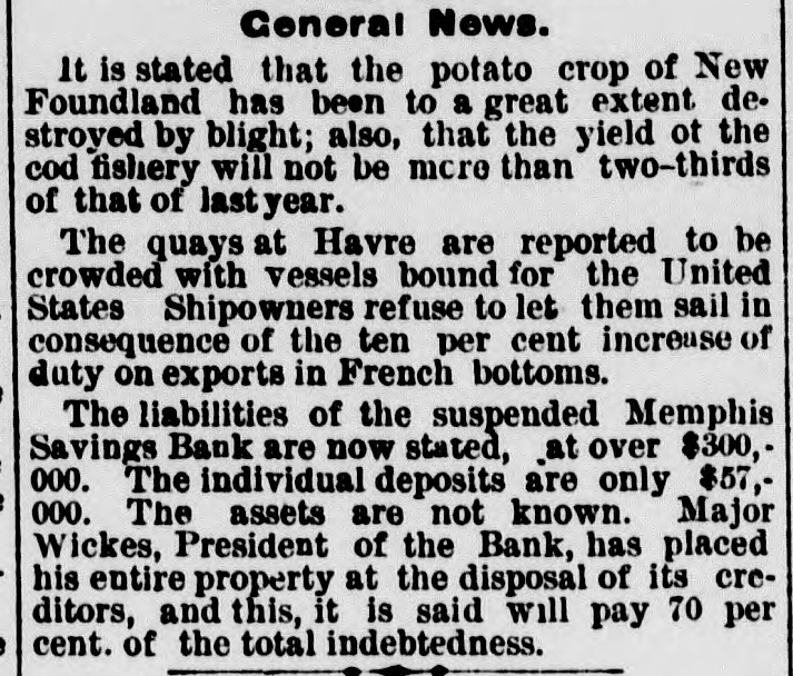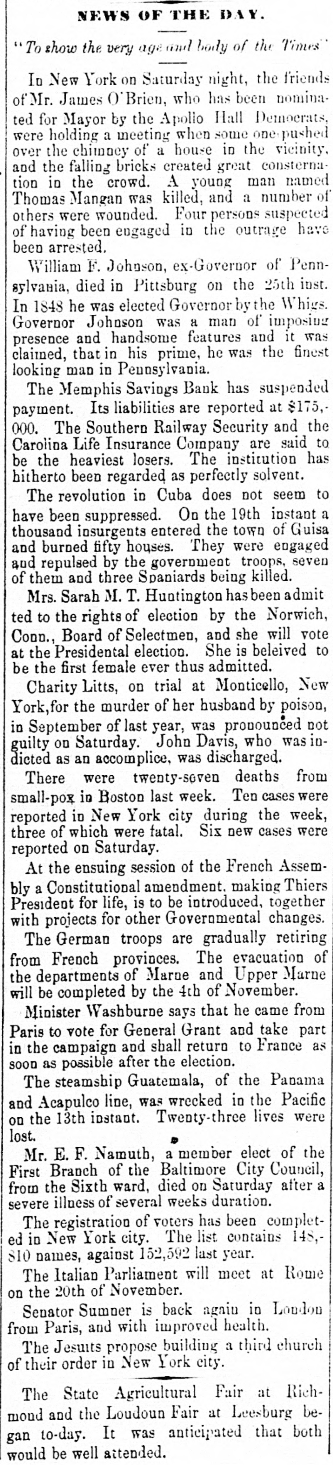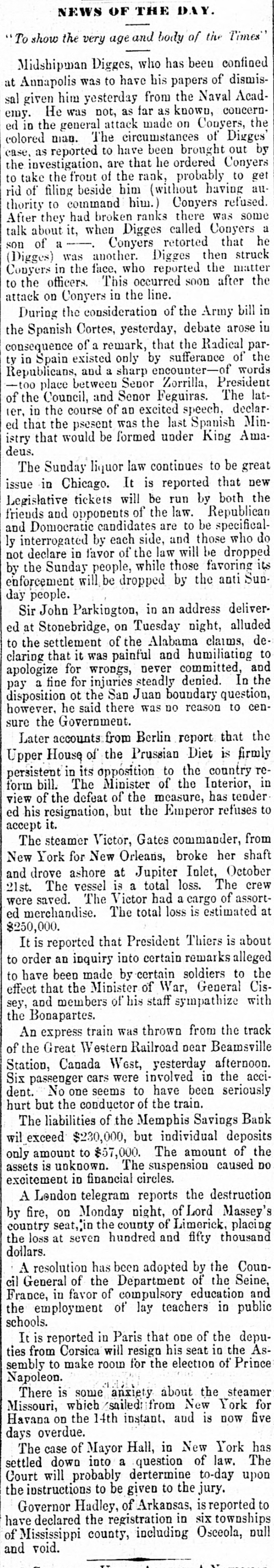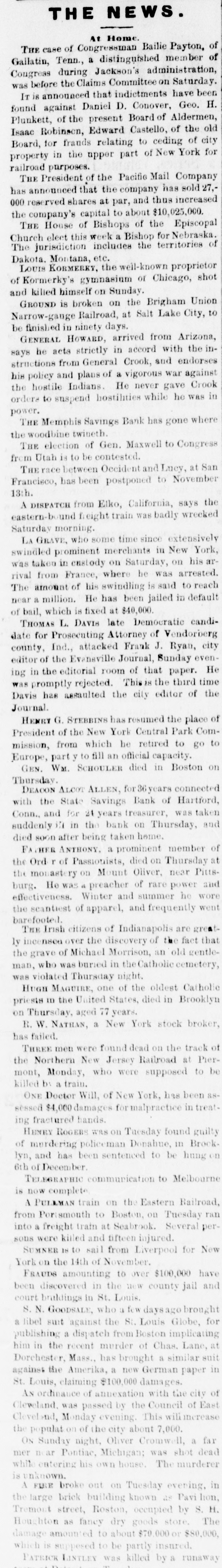 against Daniel C Plunkett, D. Conover, Geo. H. Isaac of the present Board of Aldermen, Robinson, Edward Castello, of the Board, for frauds relating to ceding of city old property in the upper part of New York for railroad purposes. has THE President of the Pacific Mail Company 000 announced that the company has the reserved shares at par, and thus sold 27.capital to about of Bishops of the Church THE company's House $10,025,000. Episcopal increased The elect this week a Bishop for jurisdiction includes the territories Nebraska. of Dakota. Montana, etc. LOUIS KORMERRY, the well-known proprietor and of Kormerky's gymnasium of Chicago, shot killed himself on Sunday. GROUND is broken on the Brigham Union Narrow-gange be Railroad, at Salt Lake City, finished in ninety HOWARD. arrived from says GENERAL he days. Arizona, to acts strictly in accord with the structions from General Crook, and endorses inhis the policy and plans of a vigorous war against ordera hostile Indians. He never gave Crook power. to suspend hostilities while he was in THE Memphis Savings Bank has gone where the woodbine twineth. THE election of Gen. Maxwell to Congress from Utah is to be contested. THE between Occident and Lucy, at 13th. Francisco, has been postponed to November San A DISPATCH from Elko, California, says eastern-bound feeight train was badly wrecked the Saturday morning. LA GRAVE, who some time since prominent merchants in in enstody on Saturday, France, where he was arThe rival was swindled taken from extensively New on arrested. his York, amount of his swindling is said to reach near a million. He has been jailed in is fixed at L. DAVIS late Attorney of attacked Frank J. date of THOMAS bail, for of which Prosecuting Ind., $40,000. Democratic Vendorberg Ryan, default candi- city the Evansville Journal, county, ing editor in the Sunday eveneditorial room of that paper. He was promptly rejected. This is the third time Journal Davis has assaulted the city editor of the HENRY G. STEBBINS has resumed the place of President of the New York Central Park Commission, from which be retired to go to Europe, party to fill an official capacity. Thursday GEN. War. SCHOULER died in Boston on DEACON ALCOT ALLEN, for 36 years connected with the State Savings Bank of Hartford, Conn., and for 21 years treasurer, was taken suddenly in in the bank on Thursday, and died soon after being taken home. FATHER ANTHONY, a prominent member of the Ord r of Passionists, died on Thursday at the monastery on Mount Oliver, near Pittsburg. He was a preacher of rare power and effectiveness. Winter and summer he wore barefooted. the scantiest of apparel, and frequently went THE Irish citizens of Indianapolis are greatly incensed over the discovery of the fact that the grave of Michael Morrison, an old gentleman, who buried in heCatholic cemetery, was violated Thursday night. HUGH MAGUIRE, one of the oldest Catholic priests in the United States, died in Brooklyn on Thursday, aged 77 years. R. W. NATHAN, a New York stock broker, has failed. THREE men were found dead on the track of the Northern New Jersey Railroad at Piermont, Monday, who were supposed to be killed by a train. ONE Doctor Will, of New York, has been 88sessed $4,000 damages for malpractice in treat. ing factured hands. HENRY ROGERS was on Tuesday found guilty of murdering policeman Donahue, in Brook. lyn, and has been sentenced to be hung on 6th of December TELEGRAPHIC commurication to Melbourne is now complete train on the Eastern from to Boston, on ran A PULLMAN Portsmouth Tuesday Railroad, into a freight train at Seabrook. Several persons were killed and tifteen injured. SUMNER 18 to sail from Liverpool for New York on the 14th of November. FRAUDS amounting to over $100,000 have been discovered in the new county jail and court buildings in St. Louis. 8. N. GOODSALE, who few Bago brought a libel suit against the St. Louis Globe, for publishing a dispatch em Boston implicating him in the recent murder of Chas. at Dorchester, Lane, Mass., has brought a similar suit against the Amerika, a new German paper in St. Louis, claiming $100,000 damages. AN ordinance of annexation with the city of Cleveland, was passed by the Council of East Cleveland, Monday evening. This will increase the populat on of the city about 7,000. ON Sunday night, Oliver Cromwell, a far mer near Pontiac, Michigan: was shot dead while entering his n house The murderer unknown. A FIRE broke out on Tuesday evening, in the large brick building known as Pavi lion, Tremost street, Roston, occupied by 8. H. Houghton as fancy dry goods store. The to about $70,000 or $80,000. damage which amounted is supposed to be partly insured. PATRICK LINTLEY was killed by a runsway