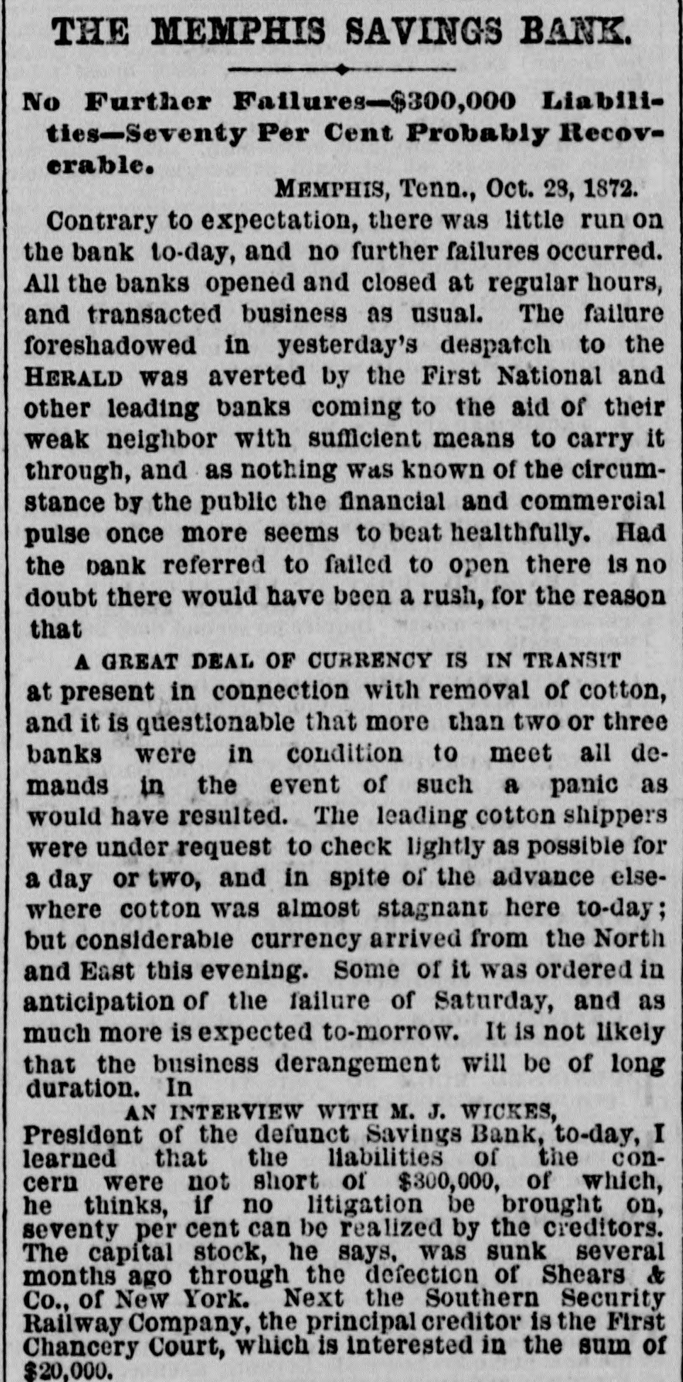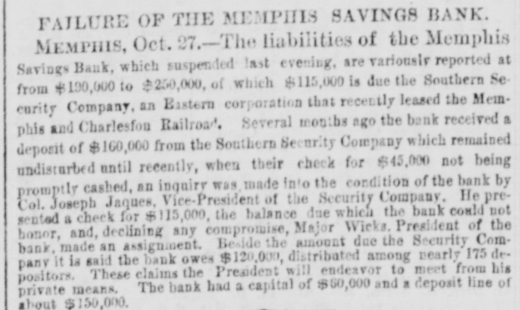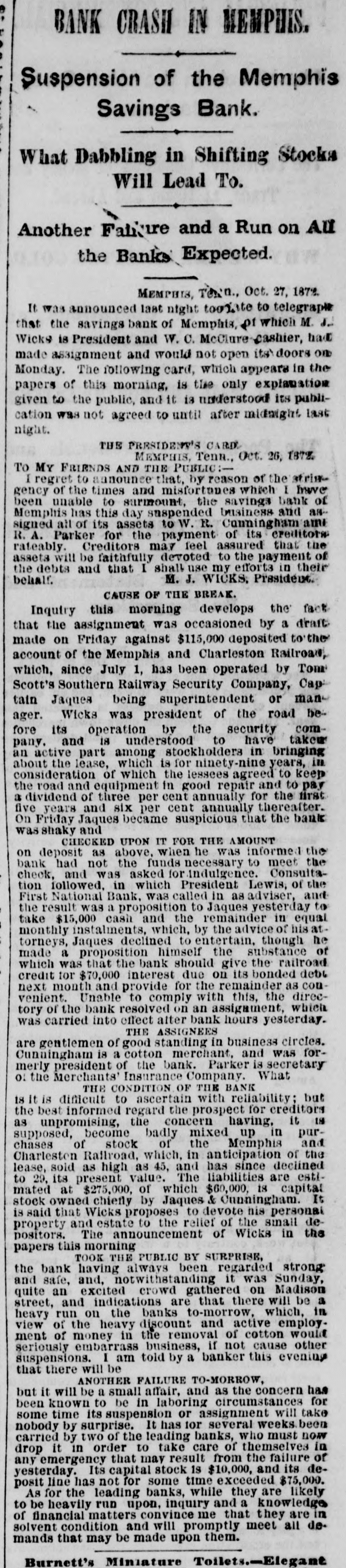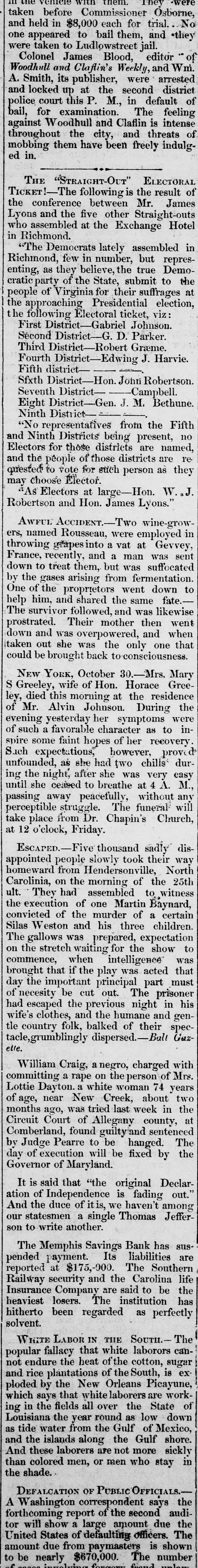 against Daniel C Plunkett, D. Conover, Geo. H. Isaac of the present Board of Aldermen, Robinson, Edward Castello, of the Board, for frauds relating to ceding of city old property in the upper part of New York for railroad purposes. has THE President of the Pacific Mail Company 000 announced that the company has the reserved shares at par, and thus sold 27.capital to about of Bishops of the Church THE company's House $10,025,000. Episcopal increased The elect this week a Bishop for jurisdiction includes the territories Nebraska. of Dakota. Montana, etc. LOUIS KORMERRY, the well-known proprietor and of Kormerky's gymnasium of Chicago, shot killed himself on Sunday. GROUND is broken on the Brigham Union Narrow-gange be Railroad, at Salt Lake City, finished in ninety HOWARD. arrived from says GENERAL he days. Arizona, to acts strictly in accord with the structions from General Crook, and endorses inhis the policy and plans of a vigorous war against ordera hostile Indians. He never gave Crook power. to suspend hostilities while he was in THE Memphis Savings Bank has gone where the woodbine twineth. THE election of Gen. Maxwell to Congress from Utah is to be contested. THE between Occident and Lucy, at 13th. Francisco, has been postponed to November San A DISPATCH from Elko, California, says eastern-bound feeight train was badly wrecked the Saturday morning. LA GRAVE, who some time since prominent merchants in in enstody on Saturday, France, where he was arThe rival was swindled taken from extensively New on arrested. his York, amount of his swindling is said to reach near a million. He has been jailed in is fixed at L. DAVIS late Attorney of attacked Frank J. date of THOMAS bail, for of which Prosecuting Ind., $40,000. Democratic Vendorberg Ryan, default candi- city the Evansville Journal, county, ing editor in the Sunday eveneditorial room of that paper. He was promptly rejected. This is the third time Journal Davis has assaulted the city editor of the HENRY G. STEBBINS has resumed the place of President of the New York Central Park Commission, from which be retired to go to Europe, party to fill an official capacity. Thursday GEN. War. SCHOULER died in Boston on DEACON ALCOT ALLEN, for 36 years connected with the State Savings Bank of Hartford, Conn., and for 21 years treasurer, was taken suddenly in in the bank on Thursday, and died soon after being taken home. FATHER ANTHONY, a prominent member of the Ord r of Passionists, died on Thursday at the monastery on Mount Oliver, near Pittsburg. He was a preacher of rare power and effectiveness. Winter and summer he wore barefooted. the scantiest of apparel, and frequently went THE Irish citizens of Indianapolis are greatly incensed over the discovery of the fact that the grave of Michael Morrison, an old gentleman, who buried in heCatholic cemetery, was violated Thursday night. HUGH MAGUIRE, one of the oldest Catholic priests in the United States, died in Brooklyn on Thursday, aged 77 years. R. W. NATHAN, a New York stock broker, has failed. THREE men were found dead on the track of the Northern New Jersey Railroad at Piermont, Monday, who were supposed to be killed by a train. ONE Doctor Will, of New York, has been 88sessed $4,000 damages for malpractice in treat. ing factured hands. HENRY ROGERS was on Tuesday found guilty of murdering policeman Donahue, in Brook. lyn, and has been sentenced to be hung on 6th of December TELEGRAPHIC commurication to Melbourne is now complete train on the Eastern from to Boston, on ran A PULLMAN Portsmouth Tuesday Railroad, into a freight train at Seabrook. Several persons were killed and tifteen injured. SUMNER 18 to sail from Liverpool for New York on the 14th of November. FRAUDS amounting to over $100,000 have been discovered in the new county jail and court buildings in St. Louis. 8. N. GOODSALE, who few Bago brought a libel suit against the St. Louis Globe, for publishing a dispatch em Boston implicating him in the recent murder of Chas. at Dorchester, Lane, Mass., has brought a similar suit against the Amerika, a new German paper in St. Louis, claiming $100,000 damages. AN ordinance of annexation with the city of Cleveland, was passed by the Council of East Cleveland, Monday evening. This will increase the populat on of the city about 7,000. ON Sunday night, Oliver Cromwell, a far mer near Pontiac, Michigan: was shot dead while entering his n house The murderer unknown. A FIRE broke out on Tuesday evening, in the large brick building known as Pavi lion, Tremost street, Roston, occupied by 8. H. Houghton as fancy dry goods store. The to about $70,000 or $80,000. damage which amounted is supposed to be partly insured. PATRICK LINTLEY was killed by a runsway