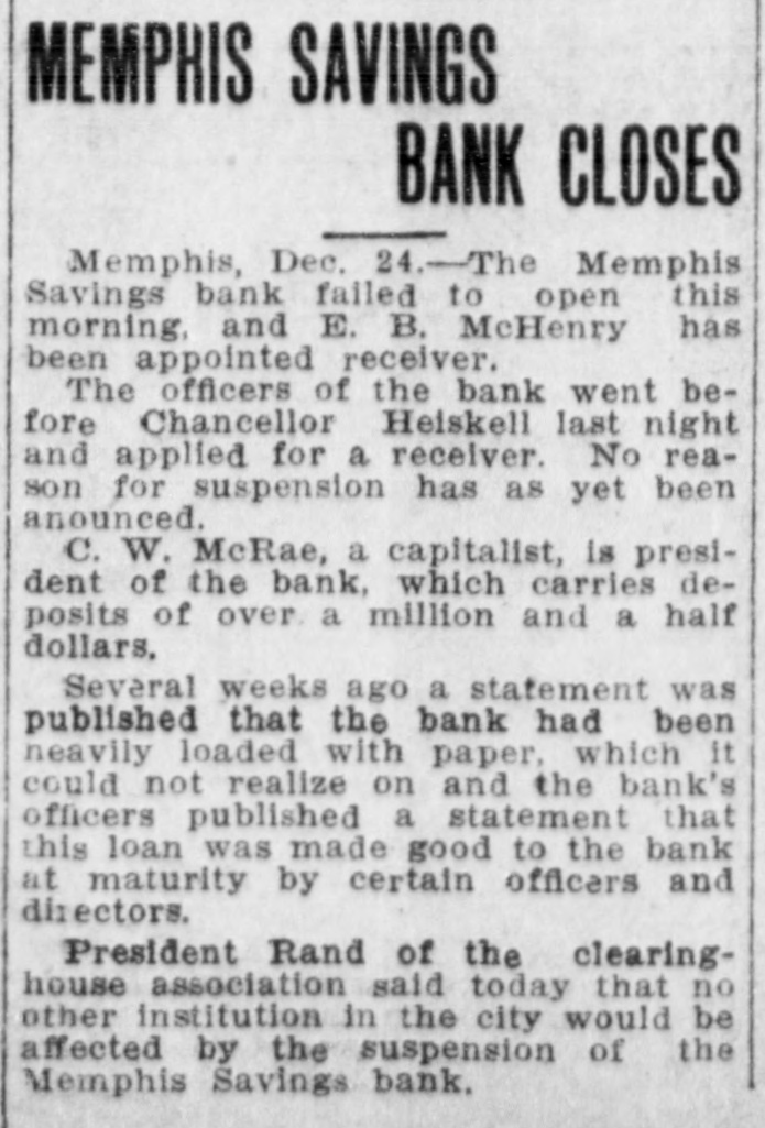 MEMPHIS SAVINGS BANK CLOSES Memphis, Dec. 24. The Memphis Savings bank failed to open this morning, and E. B. McHenry has been appointed receiver. The officers of the bank went before Chancellor Heiskell last night and applied for a receiver. No reason for suspension has as yet been anounced. C. W. McRae, a capitalist, is president of the bank, which carries deposits of over a million and a half dollars. Several weeks ago a statement was published that the bank had been neavily loaded with paper, which it could not realize on and the bank's officers published a statement that this loan was made good to the bank at maturity by certain officers and directors. President Rand of the clearinghouse association said today that no other institution in the city would be affected by the suspension of the Memphis Savings bank.