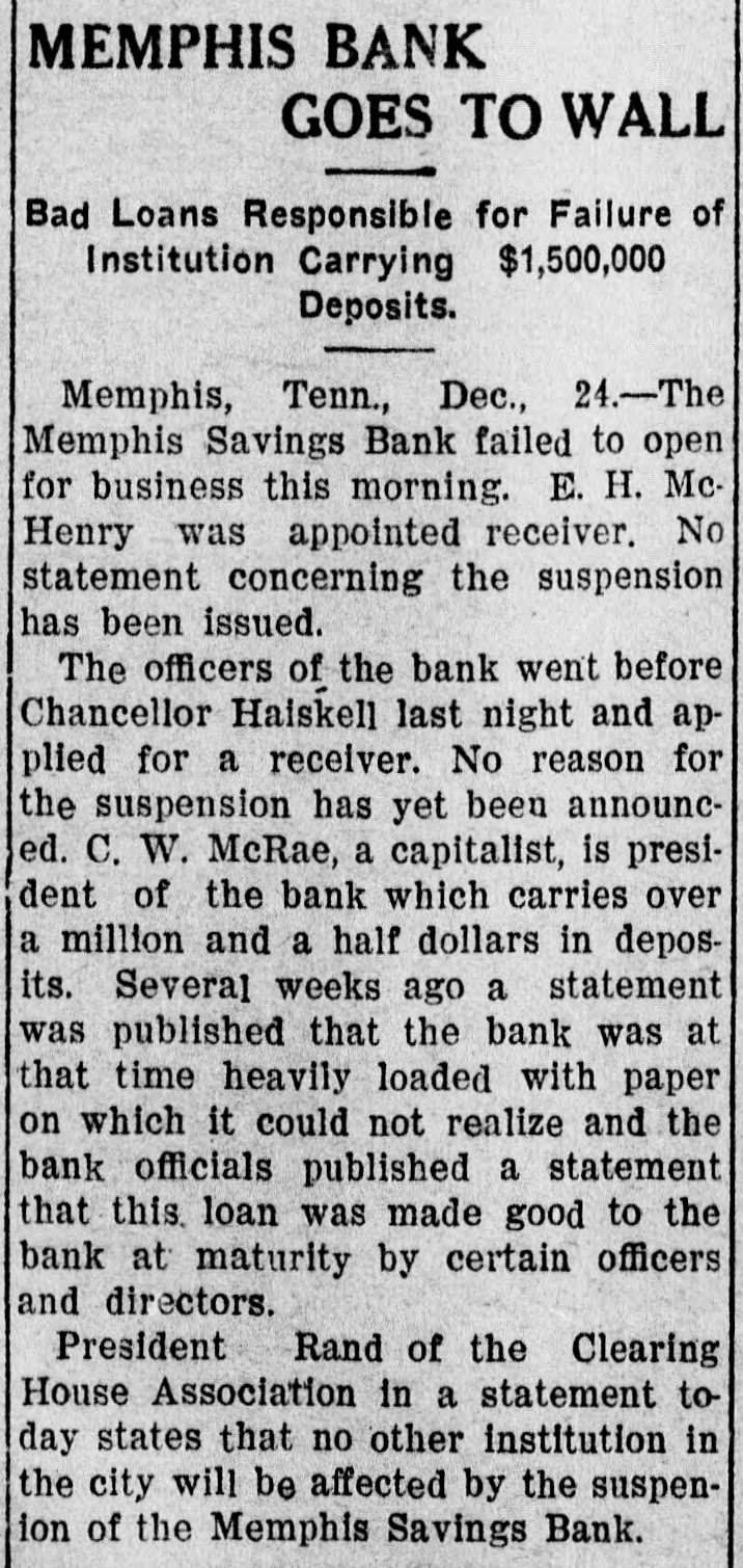 MEMPHIS BANK GOES TO WALL Bad Loans Responsible for Failure of Institution Carrying $1,500,000 Deposits. Memphis, Tenn., Dec., 24.-The Memphis Savings Bank failed to open for business this morning. E. H. McHenry was appointed receiver. No statement concerning the suspension has been issued. The officers of the bank went before Chancellor Haiskell last night and applied for a receiver. No reason for the suspension has yet been announced. C. W. McRae, a capitalist, is president of the bank which carries over a million and a half dollars in deposits. Several weeks ago a statement was published that the bank was at that time heavily loaded with paper on which it could not realize and the bank officials published a statement that this loan was made good to the bank at maturity by certain officers and directors. President Rand of the Clearing House Association in a statement to day states that no other institution in the city will be affected by the suspenion of the Memphis Savings Bank.