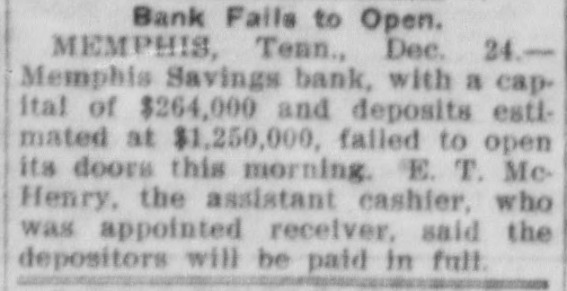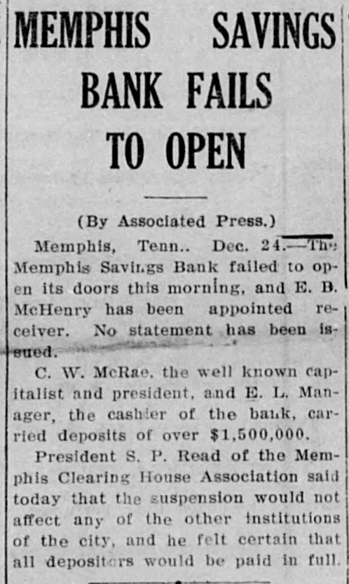 HAS $1,500,000 DEPOSITS Memphis Savings Bank Fails to Open Its Doors. Memphis, Dec. 25.-"This bank is closed by order of the chancery court. E. L. McHenry has been appointed receiver." The above notice was posted on the doors of the Memphis Savings bank, one of the oldest institutions in the city, at opening time. G. W. MacRae, a well known local capitalist, is president and E. L. Menager cashier. The bank carries deposits of over $1,500,000. Several weeks ago a statement was published that the bank had been heavily loaded with paper of a certain concern, upon which it could not realize. This set many rumors afloat and the bank inserted the following explanation in the daily papers: "A misapprehension seems to exist in regard to a supposed loss made by this bank. The facts are that an unpaid maturity was immediately made good to the bank by certain of its officers and directors and the bank sustained no loss whatever. The claim was bought at its face value by said officers and directors and is their property. Whatever is realized from it will belong to them." President S. P. Read of the Memphis Clearing House association said that the suspension of the Memphis Savings bank would not affect any other institution in the city. Mr. Read said he felt certain that all depositors in the Memphis Savings bank would be paid in full. Later a statement was issued by the directors of the Memphis Savings bank announcing that the institution was solvent and that creditors would not lose a cent. The statement adds that because of the financial stringency it was deemed wise to close the bank, ask for a receiver and liquidate its affairs.