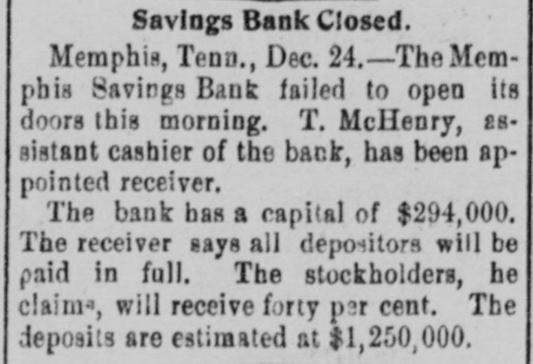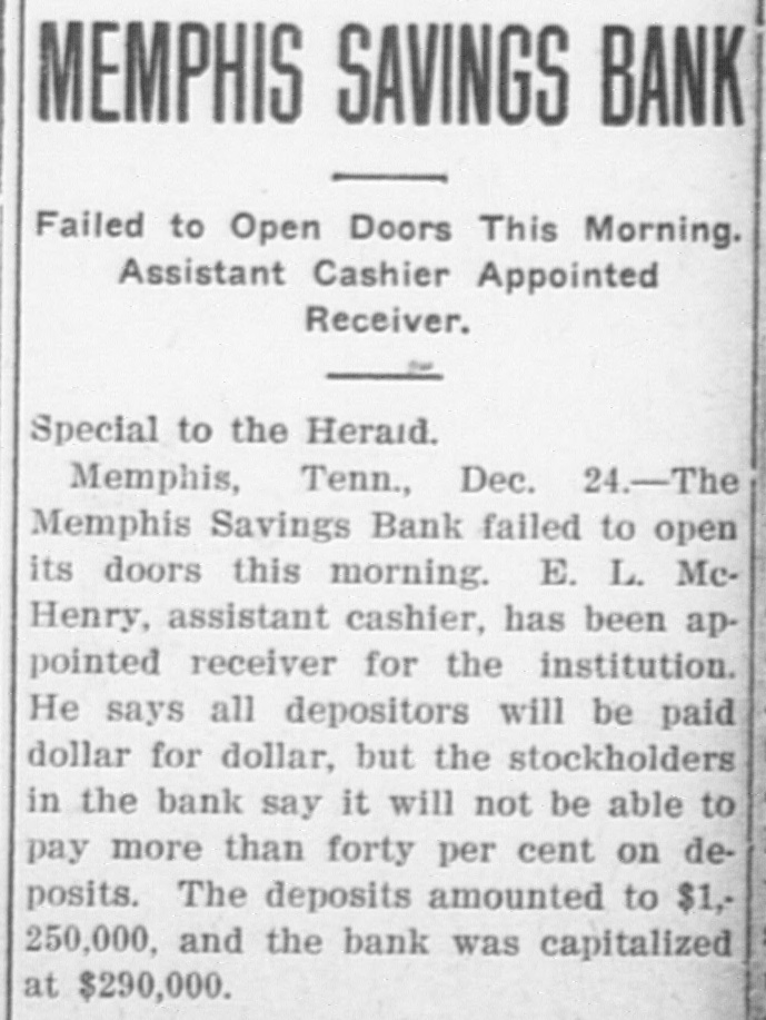 MEMPHIS SAVINGS BANK Failed to Open Doors This Morning. Assistant Cashier Appointed Receiver. Special to the Heraid. Memphis, Tenn., Dec. 24.-The Memphis Savings Bank failed to open its doors this morning. E. L. McHenry, assistant cashier, has been appointed receiver for the institution. He says all depositors will be paid dollar for dollar, but the stockholders in the bank say it will not be able to pay more than forty per cent on deposits. The deposits amounted to $1,250,000, and the bank was capitalized at $290,000.
