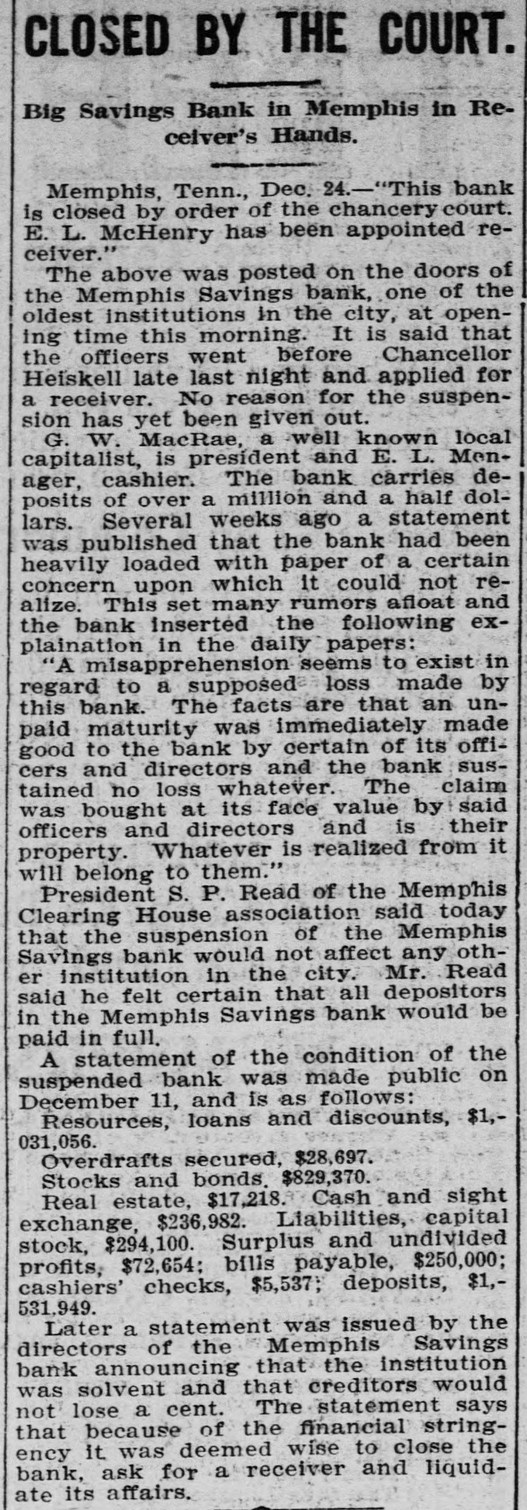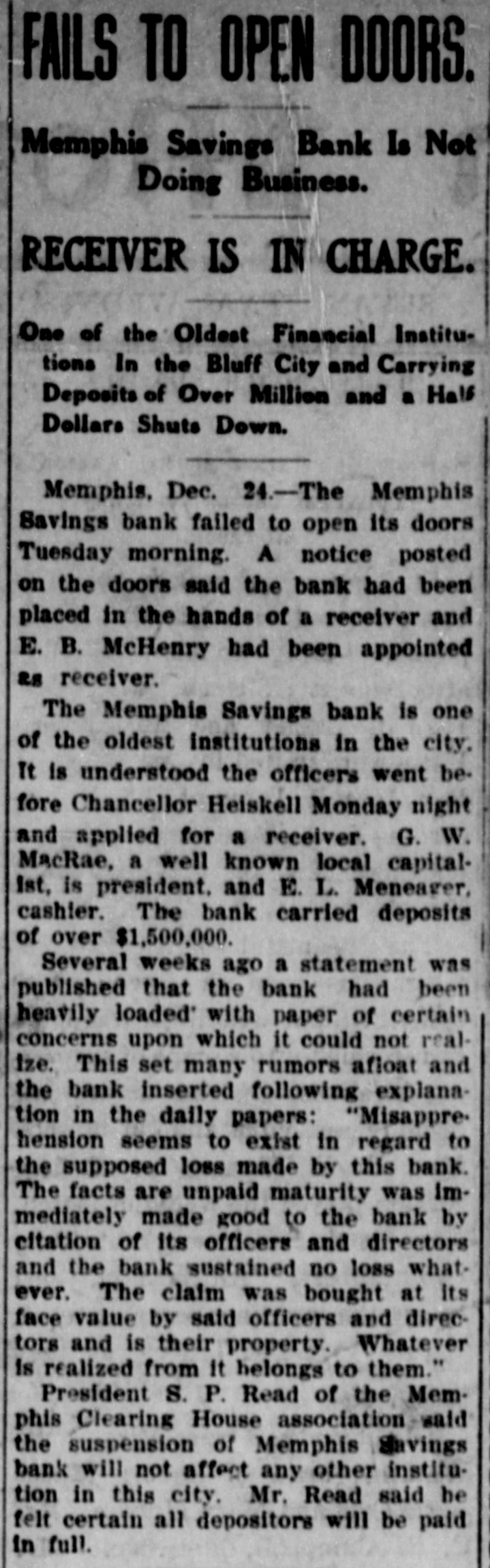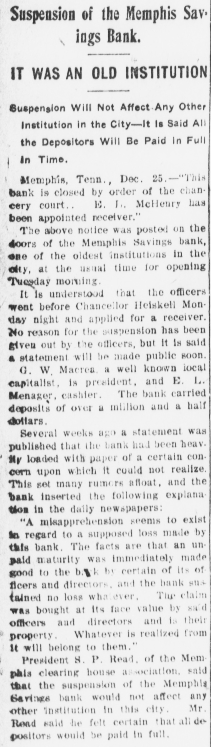 MEMPHIS BANK CLOSES ITS DOOR ONE OF THE OLDEST FINANCIAL INSTITUTIONS IN HANDS OF RECEIVER. MEMPHIS, Tenn., Dec. 25.-"This bank is clsed by order of the Chancery Court. E. L. McHnery has been appointed receiver." The above notice was posted on the doors of the Memphis Savings Bank, one of the oldest institutions in the city, at the usual time for opening this morning. It is understood that the officers went before Chancellor Heiskell last night and applied for a receiver. G. W. Macrae, a well-known local capitalist, is President, and E. L Menager Cashier. The bank carried deposits of over a million and a half dollars. Several weeks ago a statement was published that the bank had been heavily loaded with paper of a certain concern upon which it could not realize. This set many rumors afloat, and the bank inserted the following explanation in the daily papers: "A misapprehension seems to exist in regard to a supposed loss made by this bank. The facts are that an unpaid maturity was immediately made good to the bank by certain 01 its officers and directors. The claim was bought at its face value by said a officers and Directors and is their property. Whatever is realized from it will belong to them." President S. P. Read of the Memphis Clearing House Association, said today that the suspension of the Memphis Savings Bank would not affect any other institution in this city. Mr. Read said he felt certain that all of the depositors would be paid in full.