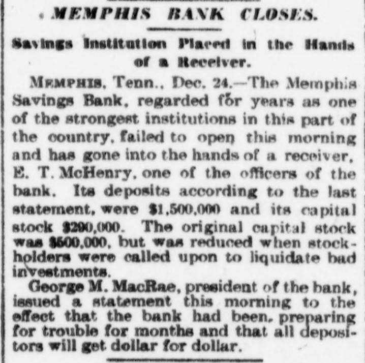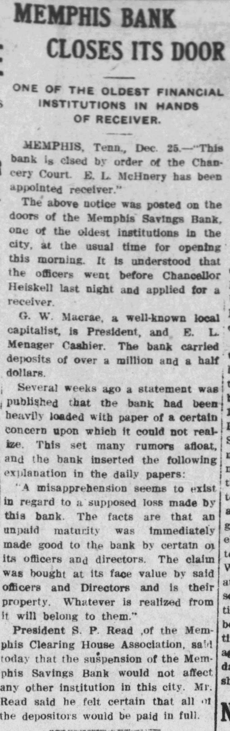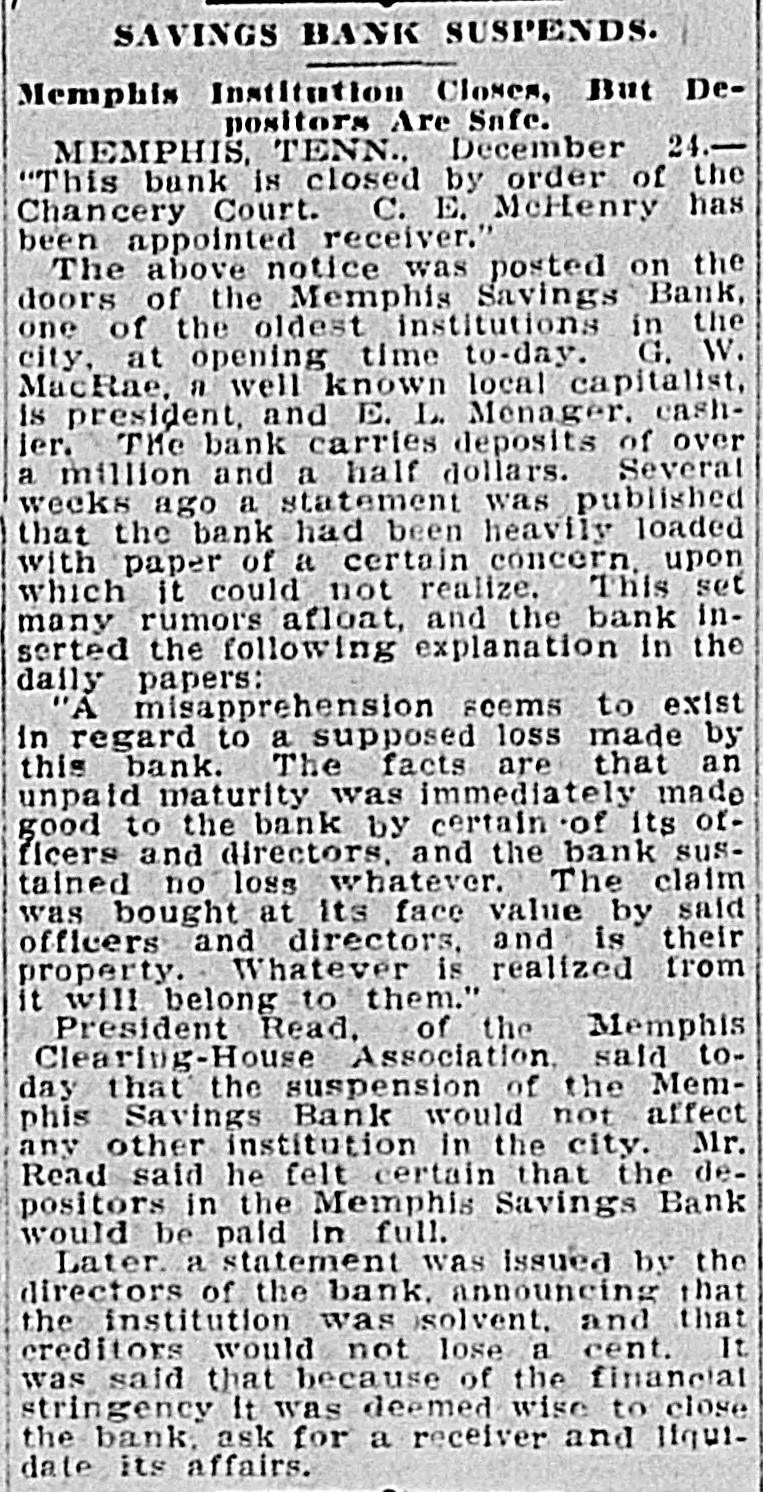 MEMPHIS BANK CLOSES ITS DOOR ONE OF THE OLDEST FINANCIAL INSTITUTIONS IN HANDS OF RECEIVER. MEMPHIS, Tenn., Dec. 25.-"This bank is clsed by order of the Chancery Court. E. L. McHnery has been appointed receiver." The above notice was posted on the doors of the Memphis Savings Bank, one of the oldest institutions in the city, at the usual time for opening this morning. It is understood that the officers went before Chancellor Heiskell last night and applied for a receiver. G. W. Macrae, a well-known local capitalist, is President, and E. L Menager Cashier. The bank carried deposits of over a million and a half dollars. Several weeks ago a statement was published that the bank had been heavily loaded with paper of a certain concern upon which it could not realize. This set many rumors afloat, and the bank inserted the following explanation in the daily papers: "A misapprehension seems to exist in regard to a supposed loss made by this bank. The facts are that an unpaid maturity was immediately made good to the bank by certain 01 its officers and directors. The claim was bought at its face value by said a officers and Directors and is their property. Whatever is realized from it will belong to them." President S. P. Read of the Memphis Clearing House Association, said today that the suspension of the Memphis Savings Bank would not affect any other institution in this city. Mr. Read said he felt certain that all of the depositors would be paid in full.