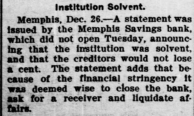 Institution Solvent. Memphis, Dec. 26.-A statement was issued by the Memphis Savings bank, which did not open Tuesday, announcing that the institution was solvent, and that the creditors would not lose a cent. The statement adds that because of the financial stringency it was deemed wise to close the bank, ask for a receiver and liquidate affairs.