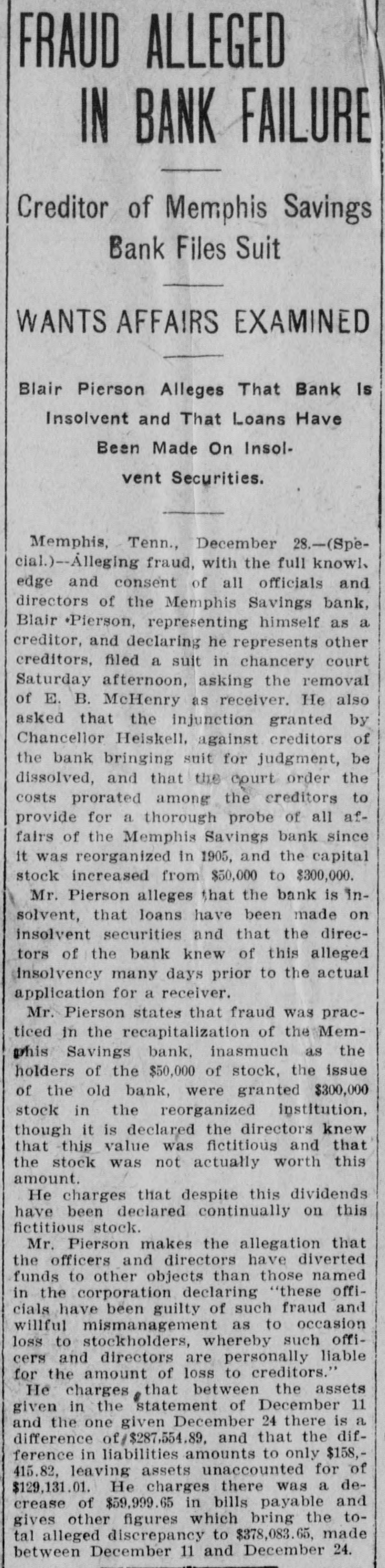 FRAUD ALLEGED IN BANK FAILURE Creditor of Memphis Savings Bank Files Suit WANTS AFFAIRS EXAMINED Blair Pierson Alleges That Bank Is Insolvent and That Loans Have Been Made On Insolvent Securities. Memphis, Tenn., December 28.-(Special.)--Alleging fraud, with the full knowl edge and consent of all officials and directors of the Memphis Savings bank, Blair Pierson, representing himself as a creditor, and declaring he represents other creditors, filed a suit in chancery court Saturday afternoon, asking the removal of E. B. McHenry as receiver. He also asked that the injunction granted by Chancellor Heiskell, against creditors of the bank bringing suit for judgment, be dissolved, and that the court order the costs prorated among the creditors to provide for a thorough probe of all affairs of the Memphis Savings bank since it was reorganized in 1905, and the capital stock increased from $50,000 to $300,000. Mr. Pierson alleges that the bank is insolvent, that loans have been made on insolvent securities and that the directors of the bank knew of this alleged insolvency many days prior to the actual application for a receiver. Mr. Pierson states that fraud was practiced in the recapitalization of the Memphis Savings bank, inasmuch as the holders of the $50,000 of stock, the issue of the old bank, were granted $300,000 stock in the reorganized institution, though it is declared the directors knew that this value was fictitious and that the stock was not actually worth this amount. He charges that despite this dividends have been declared continually on this fictitious stock. Mr. Pierson makes the allegation that the officers and directors have diverted funds to other objects than those named in the corporation declaring "these officials have been guilty of such fraud and willful mismanagement as to occasion loss to stockholders, whereby such officers and directors are personally liable for the amount of loss to creditors." He charges that between the assets given in the statement of December 11 and the one given December 24 there is a difference of/$287.554.89. and that the difference in liabilities amounts to only $158,415.82, leaving assets unaccounted for of $129,131.01. He charges there was a decrease of $59,999.65 in bills payable and gives other figures which bring the total alleged discrepancy to $378,083.65, made between December 11 and December 24.