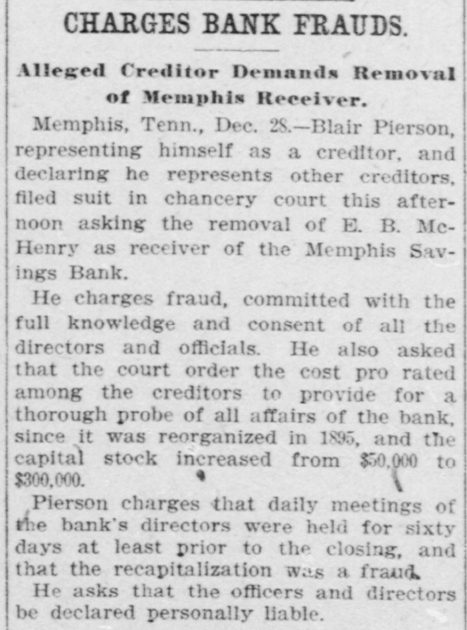 CHARGES BANK FRAUDS. Alleged Creditor Demands Removal of Memphis Receiver. Memphis, Tenn., Dec. 28.-Blair Pierson, representing himself as a creditor, and declaring he represents other creditors, filed suit in chancery court this afternoon asking the removal of E. B. McHenry as receiver of the Memphis Savings Bank. He charges fraud, committed with the full knowledge and consent of all the directors and officials. He also asked that the court order the cost pro rated among the creditors to provide for a thorough probe of all affairs of the bank, since it was reorganized in 1895, and the capital stock increased from $50,000 to $300,000. Pierson charges that daily meetings of the bank's directors were held for sixty days at least prior to the closing, and that the recapitalization was a fraud He asks that the officers and directors be declared personally liable.