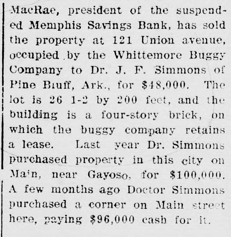 MacRae, president of the suspended Memphis Savings Bank, has sold the property at 121 Union avenue, occupied by the Whittemore Buggy Company to Dr. J. F. Simmons of Pine Bruff, Ark., for $48,000. The lot is 26 1-2 by 200 feet, and the building is a four-story brick, on which the buggy company retains a lease. Last year Dr. Simmons purchased property in this city on Main, near Gayoso, for $100,000. A few months ago Doctor Simmons purchased a corner on Main street here, paying $96,000 cash for it.