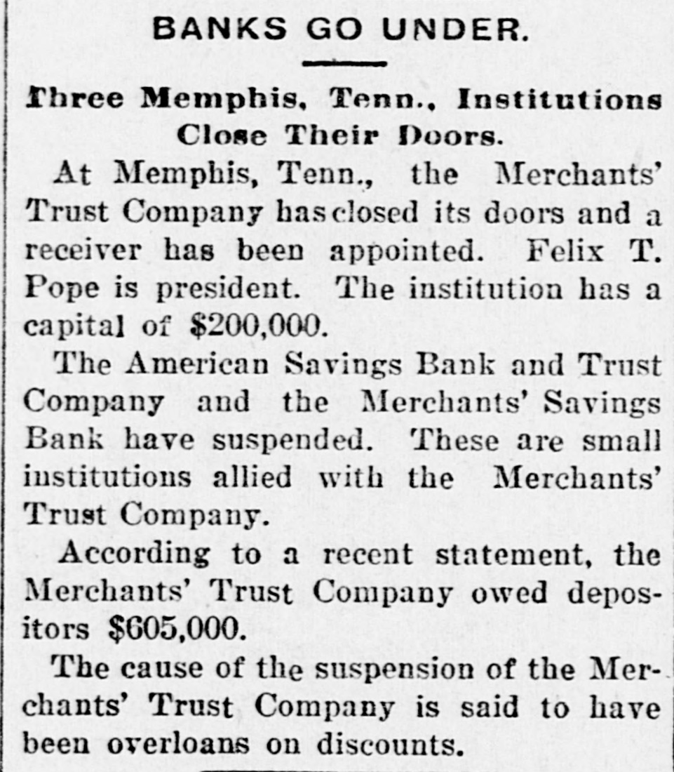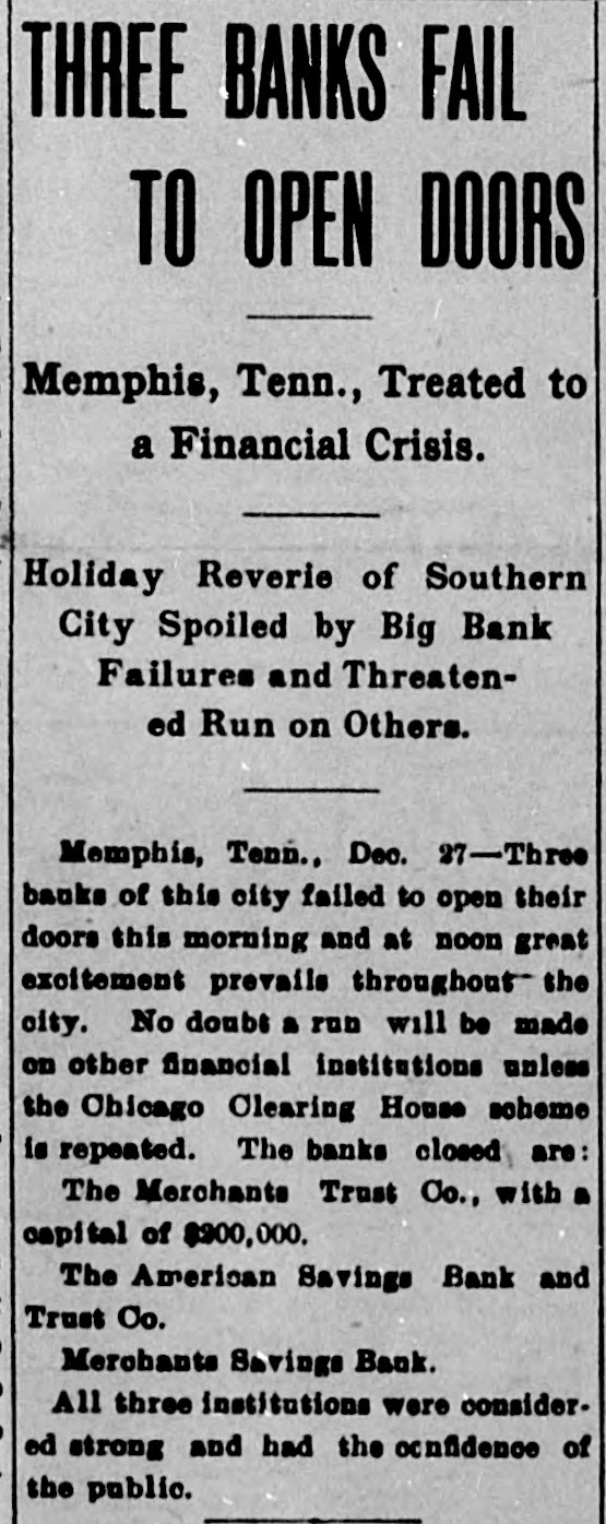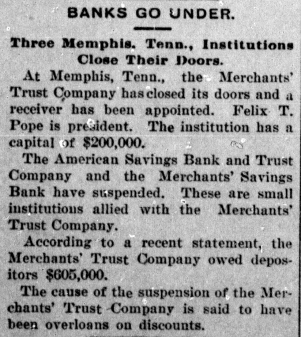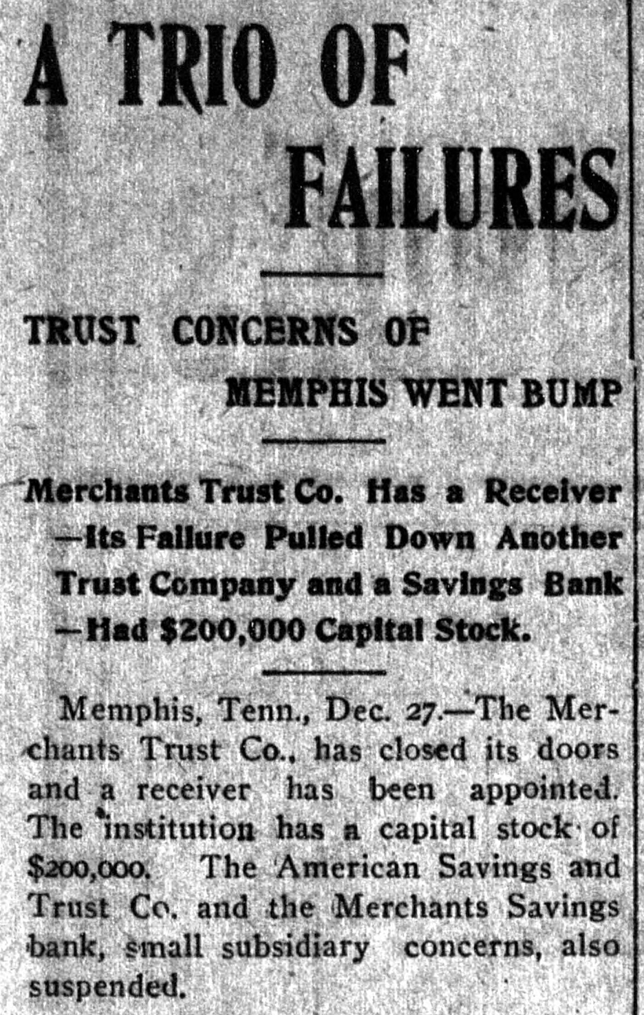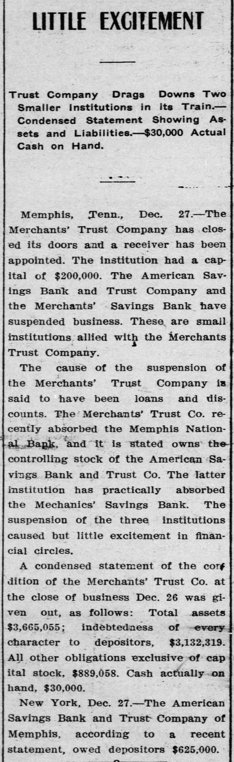 LITTLE EXCITEMENT Trust Company Drags Downs Two Smaller Institutions in its Train.Condensed Statement Showing Assets and Liabilities.-$30,000 Actual Cash on Hand. Memphis, Tenn., Dec. 27.-The Merchants' Trust Company has closed its doors and a receiver has been appointed. The institution had a capital of $200,000. The American Savings Bank and Trust Company and the Merchants' Savings Bank have suspended business. These are small institutions allied with the Merchants Trust Company. The cause of the suspension of the Merchants' Trust Company is said to have been loans and discounts. The Merchants' Trust Co. recently absorbed the Memphis National Bank, and it is stated owns the controlling stock of the American Savings Bank and Trust Co. The latter institution has practically absorbed the Mechanics' Savings Bank. The suspension of the three institutions caused but little excitement in financial circles. A condensed statement of the conf dition of the Merchants' Trust Co. at the close of business Dec. 26 was given out, as follows: Total assets $3,665,055; indebtedness of every character to depositors, $3,132,319. All other obligations exclusive of cap ital stock, $889,058. Cash actually on hand, $30,000. New York, Dec. 27.-The American Savings Bank and Trust Company of Memphis, according to a recent statement, owed depositors $625,000.