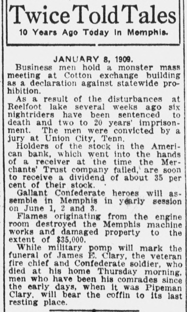 Twice ToldTales 10 Years Ago Today in Memphis. JANUARY 8, 1909. Business men hold a monster mass meeting at Cotton exchange building as a declaration against statewide prohibition. As a result of the disturbances at Reelfoot lake several weeks ago six nightriders have been sentenced to death and two to 20 years' imprisonment. The men were convicted by a jury at Union City, Tenn. Holders of the stock in the American bank, which went into the hands of a receiver at the time the Merchants' Trust company failed, are soon to receive a dividend of about 35 per cent of their stock. Gallant Confederate heroes will assemble in Memphis in yearly session on June 1, 2 and 3. Flames originating from the engine room destroyed the Memphis machine works and damaged property to the extent of $35,000. While military pomp will mark the funeral of James E. Clary, the veteran fire chief and Confederate soldier, who died at his home Thursday morning, men who have been his comrades since the early days, when It was Pipeman Clary. will bear the coffin to its last resting place.
