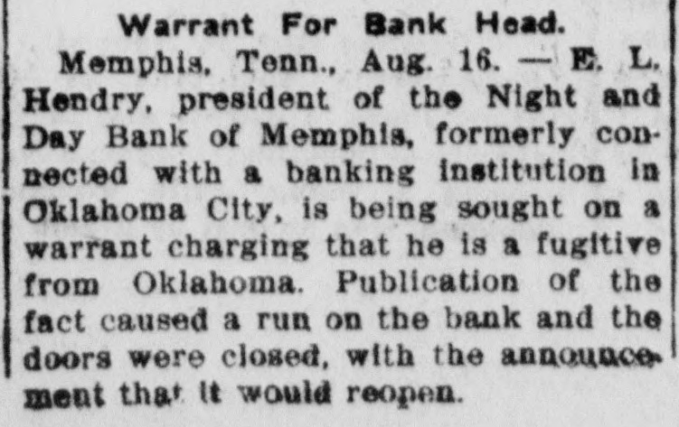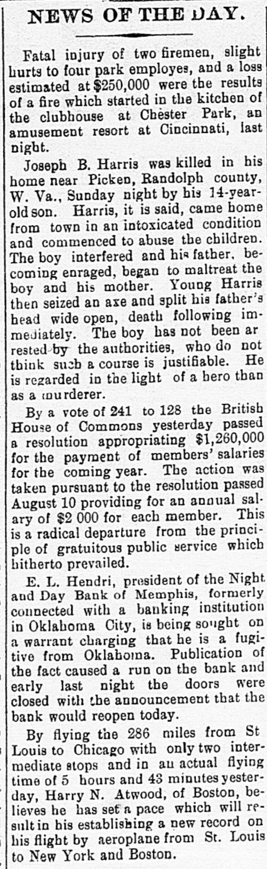 NEWS OF THE DAY. Fatal injury of two firemen, slight hurts to four park employes, and a loss estimated at $250,000 were the results of a fire which started in the kitchen of the clubhouse at Chester Park, an amusement resort at Cincinnati, last night. Joseph B. Harris was killed in his home near Picken, Randolph county, W. Va., Sunday night by his 14-yearold son. Harris, it is said, came home from town in an intoxicated condition and commenced to abuse the children. The boy interfered and his father. becoming enraged, began to maltreat the boy and his mother. Young Harris then seized an axe and split his father's head wide open, death following immediately. The boy has not been ar rested by the authorities, who do not think such a course is justifiable. He is regarded in the light of a hero than as a murderer. By a vote of 241 to 128 the British House of Commons yesterday passed a resolution appropriating $1,260,000 for the payment of members' salaries for the coming year. The action was taken pursuant to the resolution passed August 10 providing for an annual salary of $2 000 for each member. This is a radical departure from the principle of gratuitous public service which bitherto prevailed. E. L. Hendri, president of the Night and Day Bank of Memphis, formerly connected with a banking institution in Oklahoma City, is being sought on a warrant charging that he is a fugitive from Oklahoma. Publication of the fact caused a run on the bank and early last night the doors were closed with the announcement that the bank would reopen today. By flying the 286 miles from St Louis to Chicago with only two intermediate stops and in an actual flying time of 5 hours and 43 minutes yesterday, Harry N. Atwood, of Boston, believes he has set a pace which will result in his establishing a new record on his flight by aeroplane from St. Louis to New York and Boston.