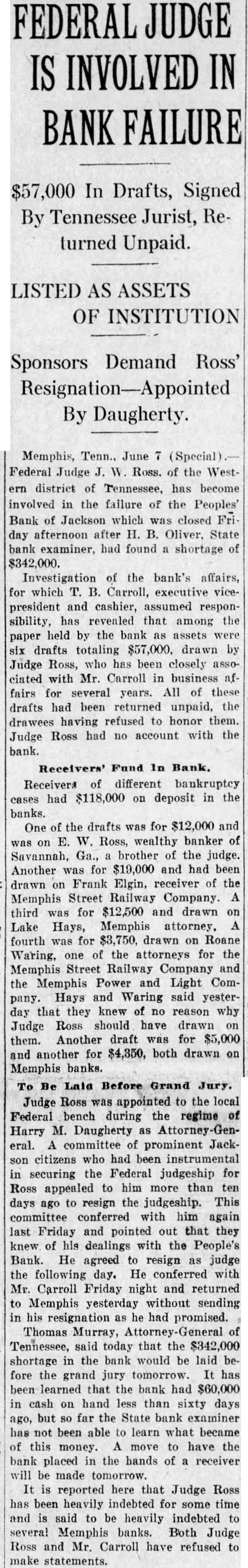 INVOLVED In Drafts, Signed By Tennessee Jurist, Returned Unpaid. LISTED AS ASSETS OF INSTITUTION Sponsors Demand Ross' Resignation-Appointed By Daugherty. Memphis, Tenn., June (Special) Federal Judge Ross. of the Westdistrict Tennessee, has become involved in the failure of the Peoples' Bank of which closed afternoon Oliver, State examiner, had found shortage $342,000. Investigation the bank's affairs, for which Carroll, executive vicepresident and cashier, assumed responsibility, has revealed that among the paper held by the bank assets drafts totaling $57,000. drawn Judge Ross, who has been closely ciated Mr. Carroll in business fairs for several years. All drafts had been unpaid, the refused honor them. Judge Ross had account with the bank. Fund In Bank. different bankruptcy had $118,000 on deposit the cases banks. One the drafts for and Ross, wealthy banker on Savannah, brother the judge. Another for $19,000 and had been drawn Frank Elgin. the Memphis Street Railway Company. third for $12,500 drawn Lake Hays, Memphis attorney. fourth was for $3,750. drawn on Roane Waring, the attorneys for the Memphis Street Railway Company and the Memphis Power and Light ComHays and Waring said pany. day that they knew of no reason why Judge Ross should drawn them. Another draft for and another for $4,350, both drawn Memphis To Be Before Grand Jury. Judge Ross appointed to the local Federal bench during regime Harry M. Daugherty eral. committee prominent Jackcitizens had instrumental securing the Federal judgeship Ross appealed him more than ten days resign the judgeship. This committee with him again Friday pointed out that they knew his dealings with the People's Bank. He agreed resign judge the following day. He conferred with Carroll Friday night and returned Memphis yesterday without sending his resignation he had promised. Thomas Murray, Tennessee, today that the shortage in the bank would be laid fore the jury has learned that the bank had $60,000 cash on hand than sixty days but far the State bank has been able learn what became this money. have the bank placed the hands of receiver tomorrow. reported here Judge Ross has been heavily indebted for some time and be heavily indebted several Memphis Both Judge Ross Mr. Carroll have refused make statements.