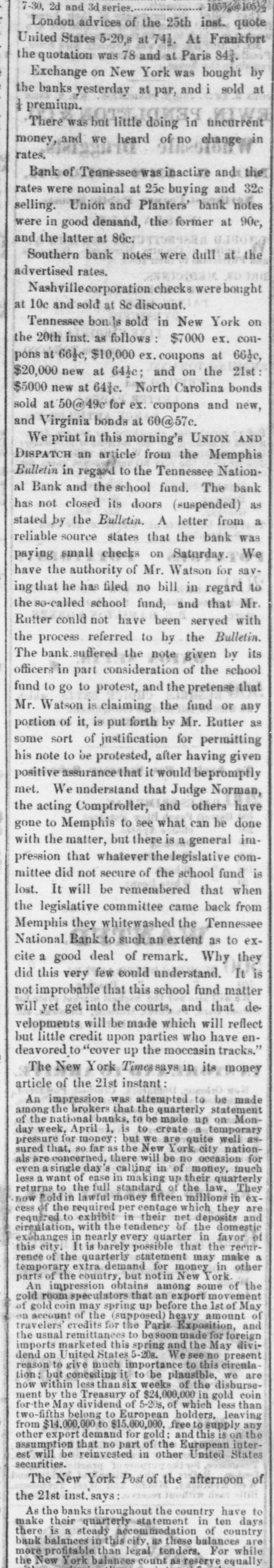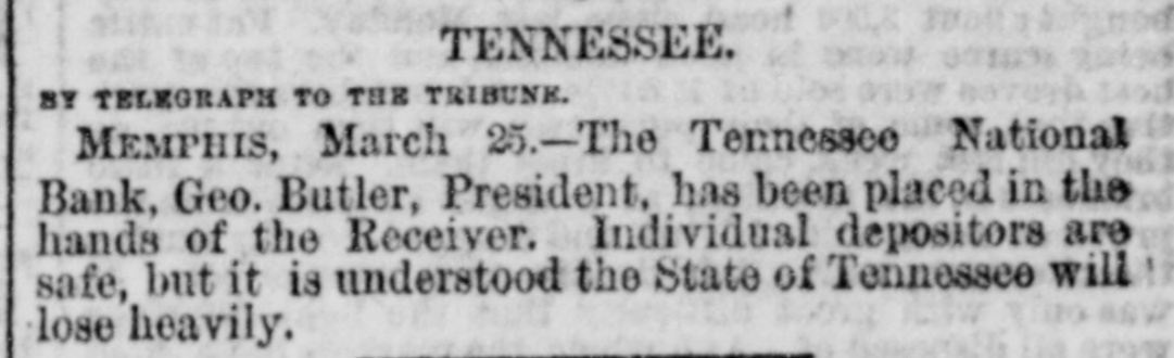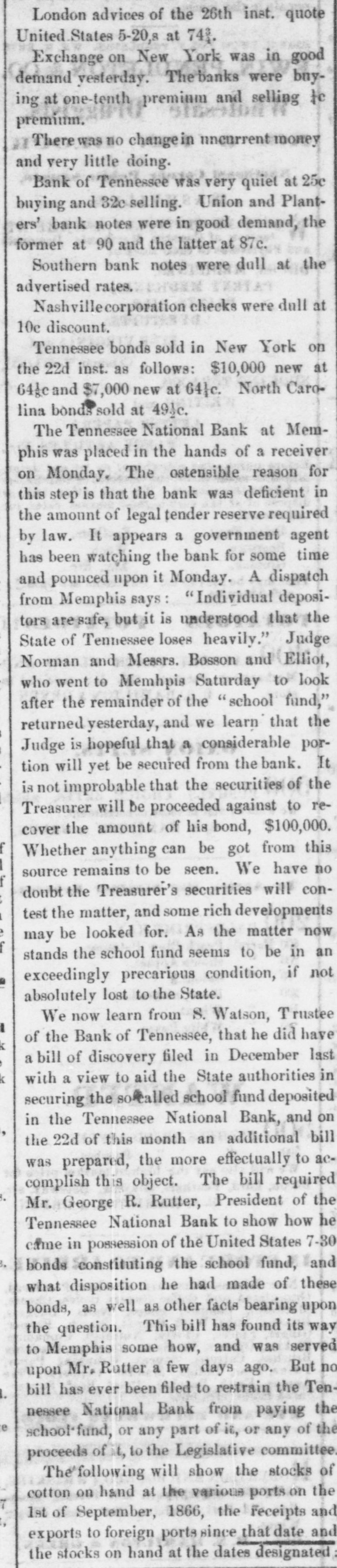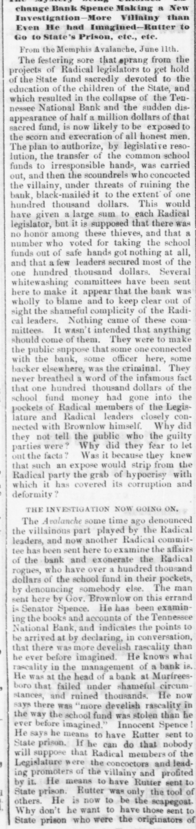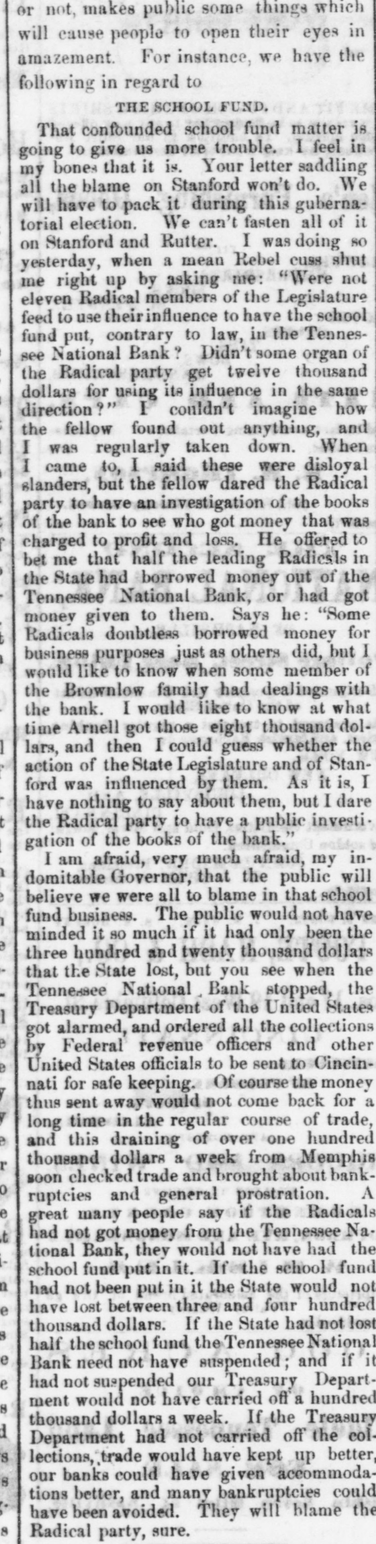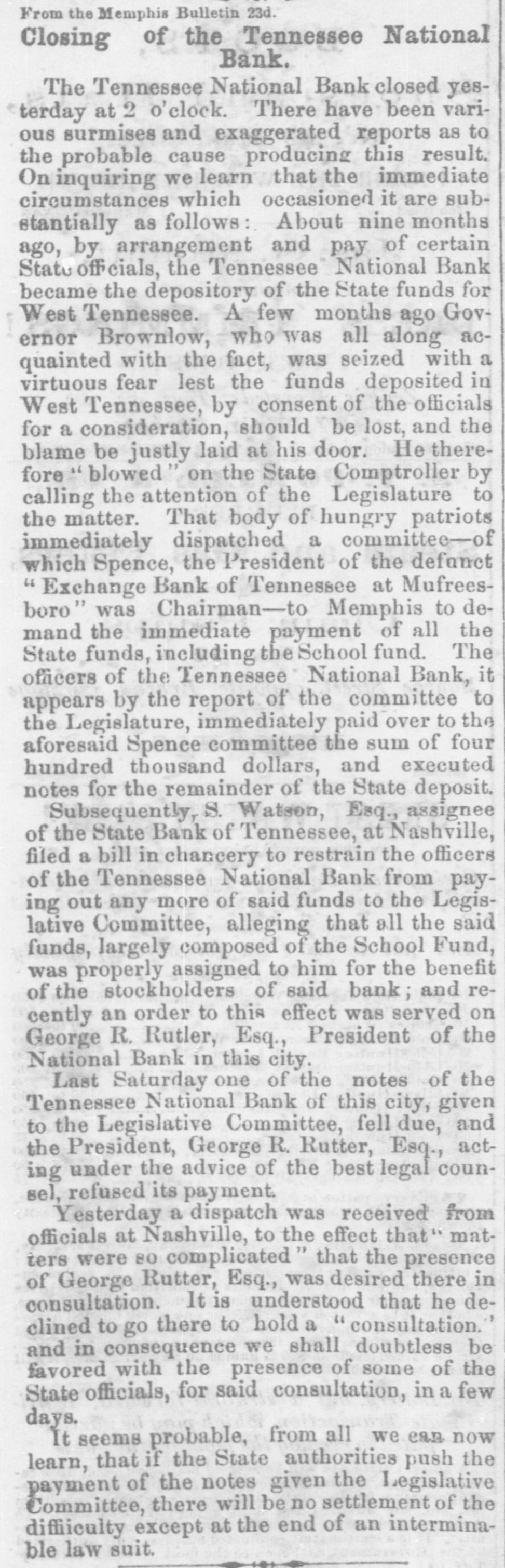 THE "SACRED" SCHOOL FUND. The Tennessee National Bond of Menaphis Refuses Payment-Rufter Declines to Come to a Consultation on the Subject-State Officials B neti claries-The Sacred Fund in Bad Way. From the Memphis Bulletin, Marell 21. The Tennessee National Bank closed yesterday at 2 o'clock. There have been various surmises and exaggerated reports as to the probable cause producing is sesulf. On inquiring we learn that theam mediate circumstances which oceanic are substantially as follows Abou filne months ago, be arrangement and pay of certain State officials, the Tennessee National Bank became the depository of the State funds for West Tennessee. A plic months ago Governer Brownlow, who as as all along acquainted with the fact, seized with a virtuous fear lest the fu is deposited in West Tennessee, by consen the officials for a consideration, should its lost, and the blame be justle laid alapria door. He therefore blowed aprillin State Treasurer, by calling the attention of the Legislature to the matter. That body of hungry patriots immediately dispatched a committee-ofwhich Spence, the President of the defunct Exchange Bank of Tennessee at Murtreesboro' was Chairman -to Memphis to demand the immediate payment of all the State funds, including the School fund. The officers of the Tennessee National Bank, it appears by the report of the committee to the Legislature, immediately paid over to the aforesaid Spence committee the sum of four hundred thousand dollars, and executed notes for the remainder of the State deposit. Subgenuently, S. Watson, Esq., assignee of the State Bank of Tennessee, at Nash ville, filed a bill in chancery to restrain the officers of the Tennessee National Bank from paying out any more of said funds to the Legislative committee, alleging that al of was to him School the said fund, funds, largely properly composed assigned the for the benefit of the stockholders of said bank; and recently an order to this effect was served on George R. Rutter, Esq. President of the National Bank in this city. Last Saturday one of the notes of the Tennessee National Bank of this city, given to the Legislative committee, fell due, and the President, George R. Rutter, Esq., act ing under the advice of the best legal counsel, refused its payment. Yesterday a dispatch was received from officials at Nashville to the effect that "matters were so complicated" that the presence of George Rutter, Esq, was desired there in consultation. It is understood that he declined to go there to hold a "consultation," and in consequence we stall doubtless be favored with the presence of some of the State officials, for said consultation, in a few days. It is due to the officers of the bank to say that all the ordinary demands have been met, and that it is scarcely likely that a single depositor will lose a cent by the closing of the bank. It seems probable, from all we can now learn, that if the State authorities push the payment of the notes given the Legislative committee, there will be no settlement of the difficulty except at the end of an interminable law suit.