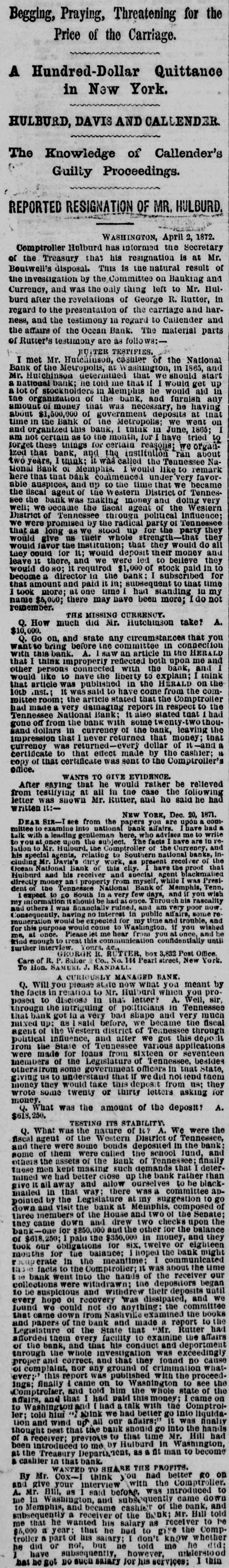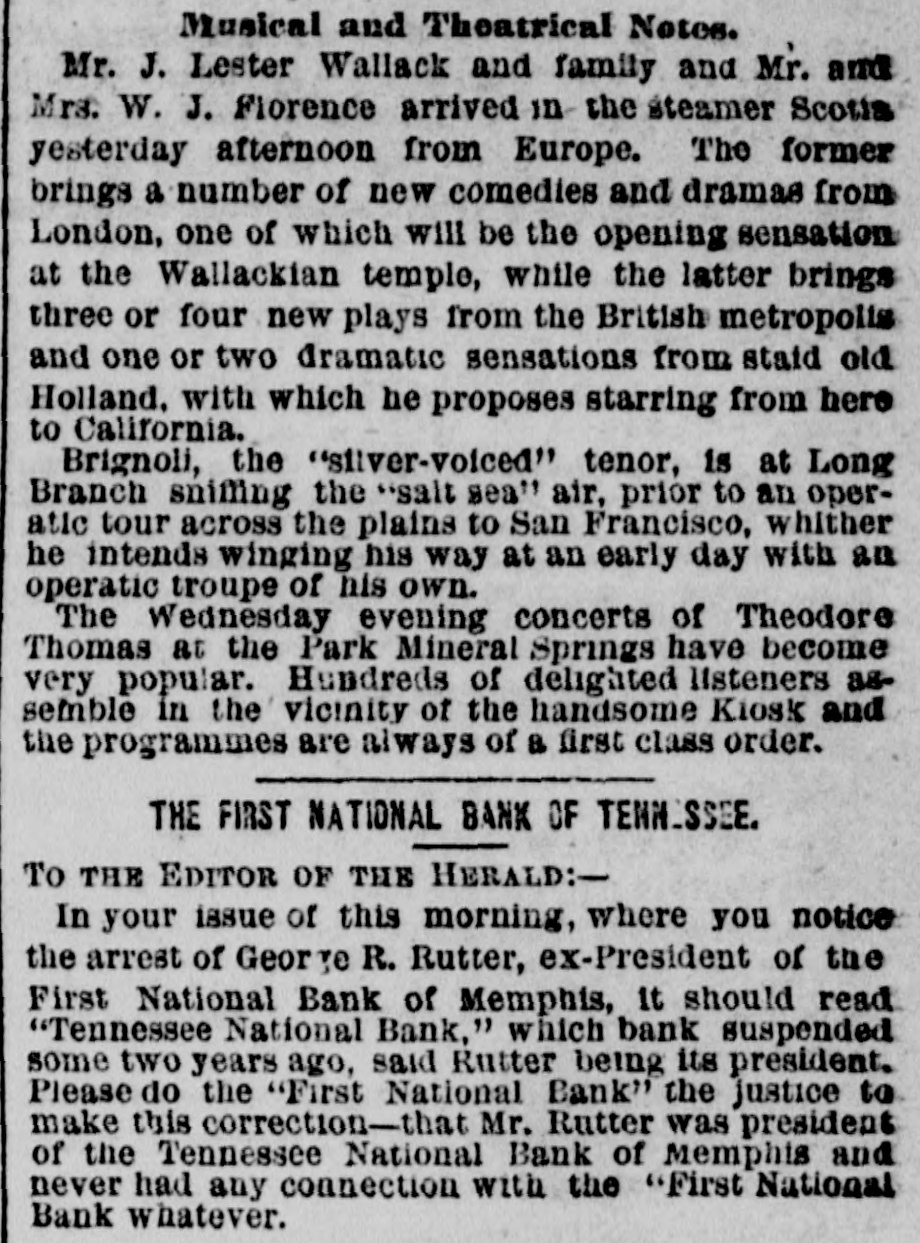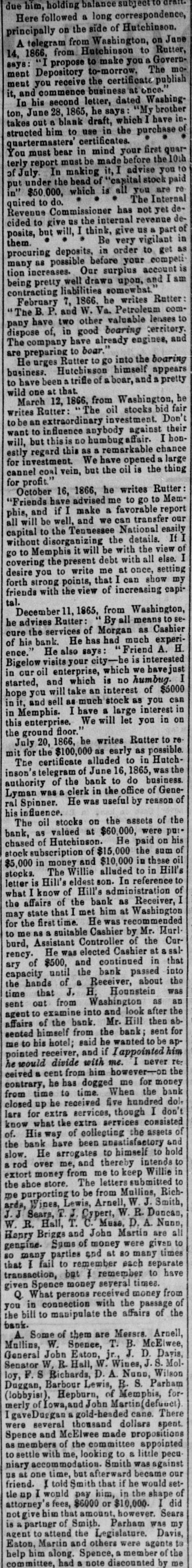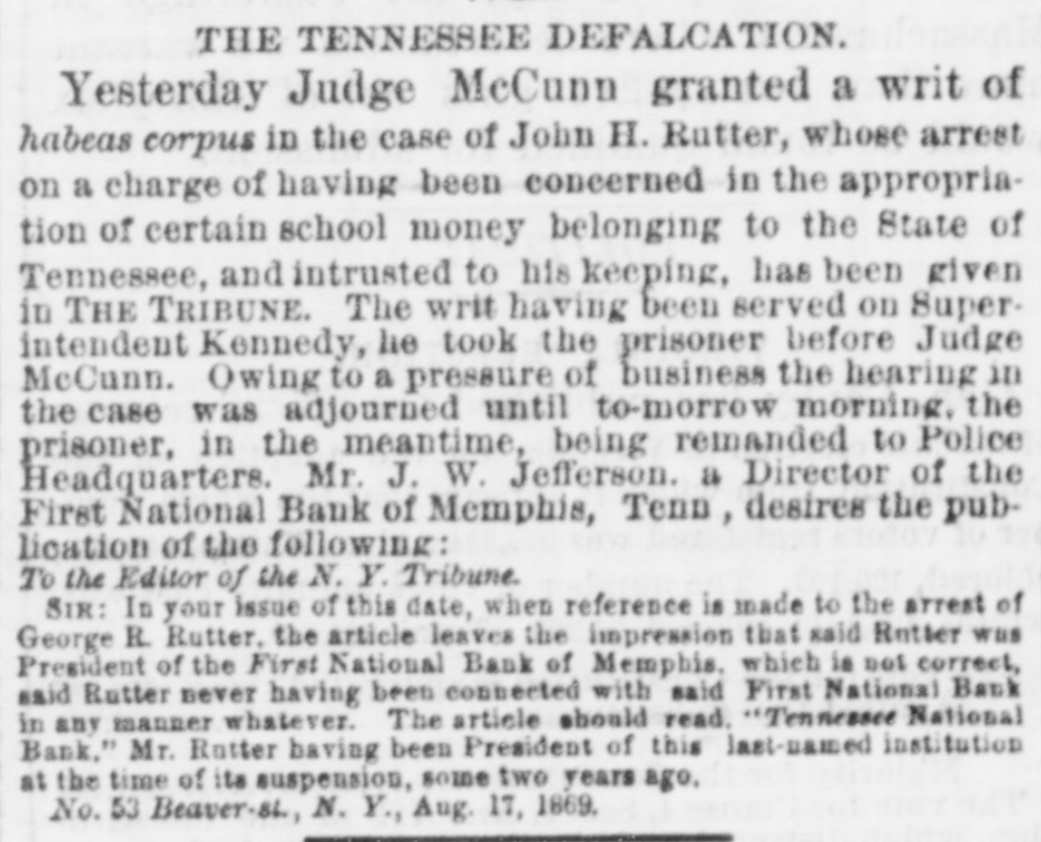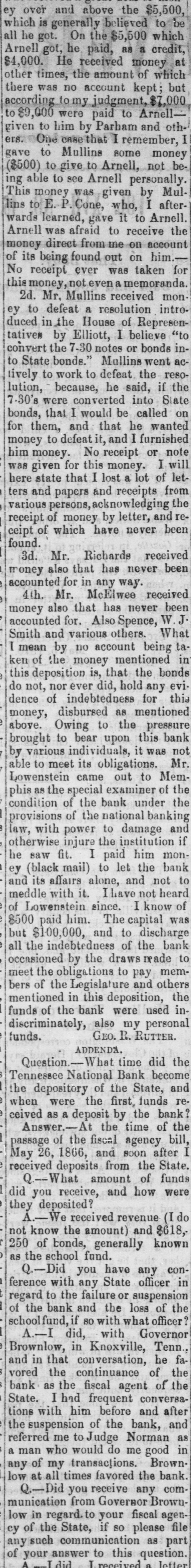 THE "SACRED" SCHOOL FUND. The Tennessee National Bond of Menaphis Refuses Payment-Rufter Declines to Come to a Consultation on the Subject-State Officials B neti claries-The Sacred Fund in Bad Way. From the Memphis Bulletin, Marell 21. The Tennessee National Bank closed yesterday at 2 o'clock. There have been various surmises and exaggerated reports as to the probable cause producing is sesulf. On inquiring we learn that theam mediate circumstances which oceanic are substantially as follows Abou filne months ago, be arrangement and pay of certain State officials, the Tennessee National Bank became the depository of the State funds for West Tennessee. A plic months ago Governer Brownlow, who as as all along acquainted with the fact, seized with a virtuous fear lest the fu is deposited in West Tennessee, by consen the officials for a consideration, should its lost, and the blame be justle laid alapria door. He therefore blowed aprillin State Treasurer, by calling the attention of the Legislature to the matter. That body of hungry patriots immediately dispatched a committee-ofwhich Spence, the President of the defunct Exchange Bank of Tennessee at Murtreesboro' was Chairman -to Memphis to demand the immediate payment of all the State funds, including the School fund. The officers of the Tennessee National Bank, it appears by the report of the committee to the Legislature, immediately paid over to the aforesaid Spence committee the sum of four hundred thousand dollars, and executed notes for the remainder of the State deposit. Subgenuently, S. Watson, Esq., assignee of the State Bank of Tennessee, at Nash ville, filed a bill in chancery to restrain the officers of the Tennessee National Bank from paying out any more of said funds to the Legislative committee, alleging that al of was to him School the said fund, funds, largely properly composed assigned the for the benefit of the stockholders of said bank; and recently an order to this effect was served on George R. Rutter, Esq. President of the National Bank in this city. Last Saturday one of the notes of the Tennessee National Bank of this city, given to the Legislative committee, fell due, and the President, George R. Rutter, Esq., act ing under the advice of the best legal counsel, refused its payment. Yesterday a dispatch was received from officials at Nashville to the effect that "matters were so complicated" that the presence of George Rutter, Esq, was desired there in consultation. It is understood that he declined to go there to hold a "consultation," and in consequence we stall doubtless be favored with the presence of some of the State officials, for said consultation, in a few days. It is due to the officers of the bank to say that all the ordinary demands have been met, and that it is scarcely likely that a single depositor will lose a cent by the closing of the bank. It seems probable, from all we can now learn, that if the State authorities push the payment of the notes given the Legislative committee, there will be no settlement of the difficulty except at the end of an interminable law suit.