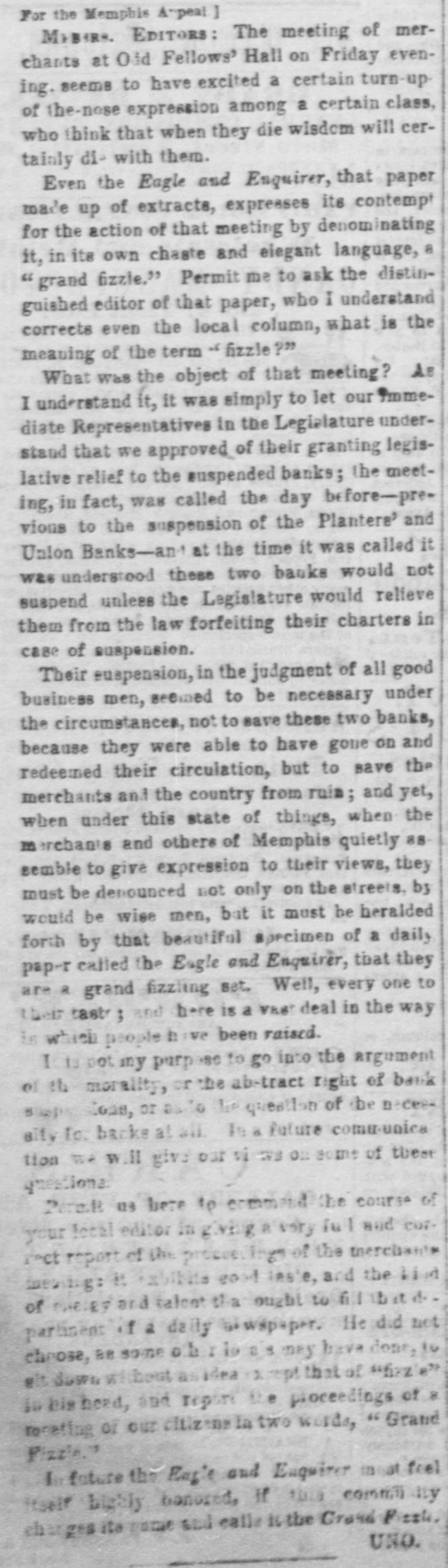 For the Memphis Appeal] Missus. EDITORS: The meeting of merchants at Old Fellows' Hall on Friday evening. seems to have excited a certain turn-upof the-nose expression among a certain class, who think that when they die wisdom will certainly di- with them. Even the Eagle and Enquirer, that paper made up of extracts, expresses its contempt for the action of that meeting by denominating it, in its own chaste and elegant language, 8 " grand fizzle." Permit me to ask the distinguished editor of that paper, who I understand corrects even the local column, what is the meauing of the term fizzle?" What Was the object of that meeting? As I understand it, it was simply to let our Immediate Representatives In the Legislature understand that we approved of their granting legislative relief to the suspended banks; the meeting, in fact, was called the day before-previons to the suspension of the Planters' and Union Banks-ant at the time it was called it was understood these two banks would not suspend unless the Legislature would relieve them from the law forfeiting their charters in case of suspension. Their euspension, in the judgment of all good business men, seemed to be necessary under the circumstances, not to save these two banks, because they were able to have gone on and redeemed their circulation, but to save the merchants and the country from ruin; and yet, when under this state of things, when the merchants and others of Memphis quietly 88semble to give expression to their views, they must be denounced not only on the streets, by would be wise men, but it must be heralded forth by that beautiful specimen of a daily paper called the Eugle and Enquirer, that they are R grand fizzling set. Well, every one to their tastr and here is a VAST deal in the way is which people b we been raised. I is not my purpose to go into the argument of th morality, or the ab-tract right of bank Code, or asio to question of (be nacesalty to: backs at all. Is is future communica tion we will give our vi we on some of these questions. Permit 03 bere to commend the course of your local editor in giving R very lu I and corret report of the prosse legs of the merchands meaning: it Ambilité good Ins'e, and the Had of rheirg and talent the ought to 61 that d. partinent if a daily alwspaper. He did not choose, BB some other is 08 may have done, to git down hout as rept that of "fizz'e" to heed, and report the proceedings of 8 metting of our citizensi two words, " Grand Pizzin." la future the Ragle and Enquirer mut feel itself bigsly banosed, If this commit my charges its just and calls the Crand UNO. Fizzle,