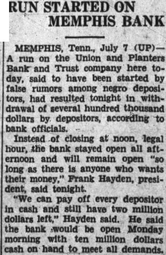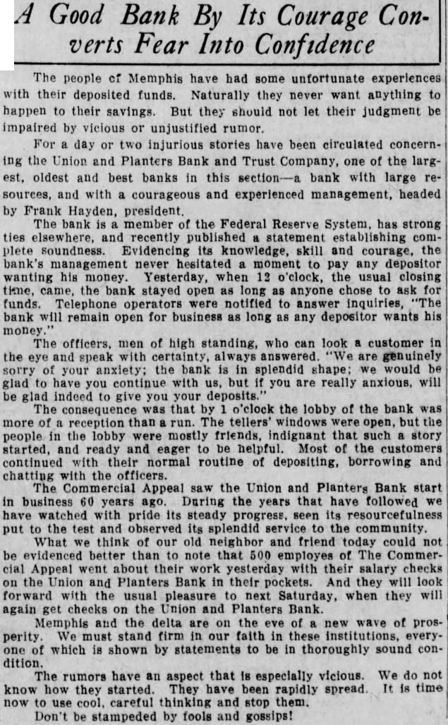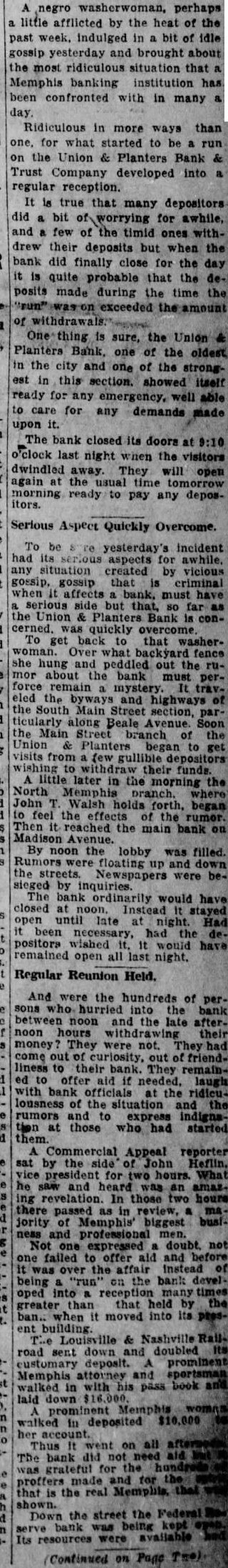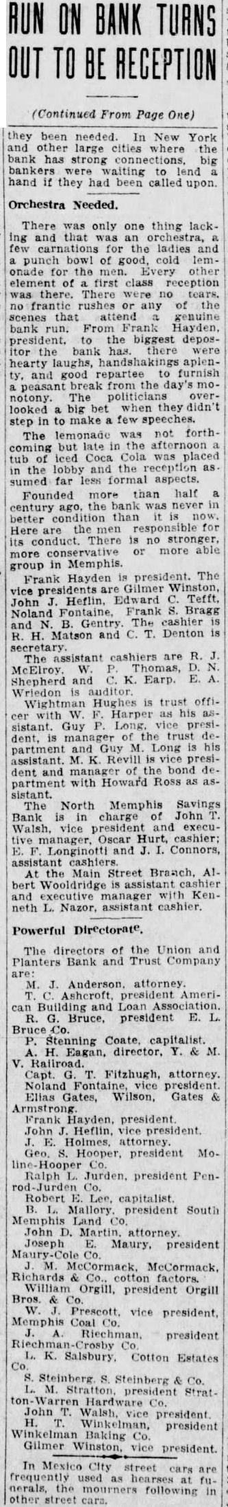 There was only one thing lacking and that an orchestra, few carnations for the ladies and punch bowl of good, cold onade for the men. Every other element of first class reception was there. There were no tears. no frantic rushes or any of the scenes that genuine bank From Frank Hayden. president. the biggest deposthe bank has. there were hearty laughs, handshakings aplenty, and good repartee to furnish peasant break from the notony. The politicians overlooked big bet when they didn't step to make few speeches. The lemonade was not forthcoming but late in the afternoon tub of iced Coca Cola was placed in the lobby and the reception as sumed far less formal aspects. Founded more than half century ago, the bank was never in better condition than is now. Here the men for its conduct. There is no stronger, or more able more in Memphis. group Frank Hayden is president. The vice are Gilmer Winston, Edward C. Tefft. John Noland Fontaine, Frank Bragg and B. Gentry The cashier R. H. Matson and C. T. Denton is secretary The assistant cashiers are R. Thomas, Shepherd and K. Earp. E. Wriedon is auditor. Wightman Hughes is trust offi. cer with W. F. Harper as his sistant. Guy P. Long. vice president, is manager the trust partment and Guy M. Long his assistant. vice president and the bond partment with Howard Ross as assistant. The North Memphis Savings Bank is charge John Walsh, vice president and executive Oscar Hurt, cashier: Longinotti and Connors, assistant cashiers At the Main Street Branch, A1bert Wooldridge cashier and executive manager with Kenneth L. Nazor, assistant cashier.