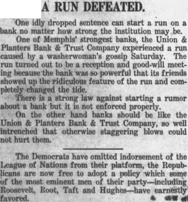 (Continued From Page One) they been needed. In New York and other large where the bank has strong connections, big bankers were waiting to lend hand if they had been called upon.