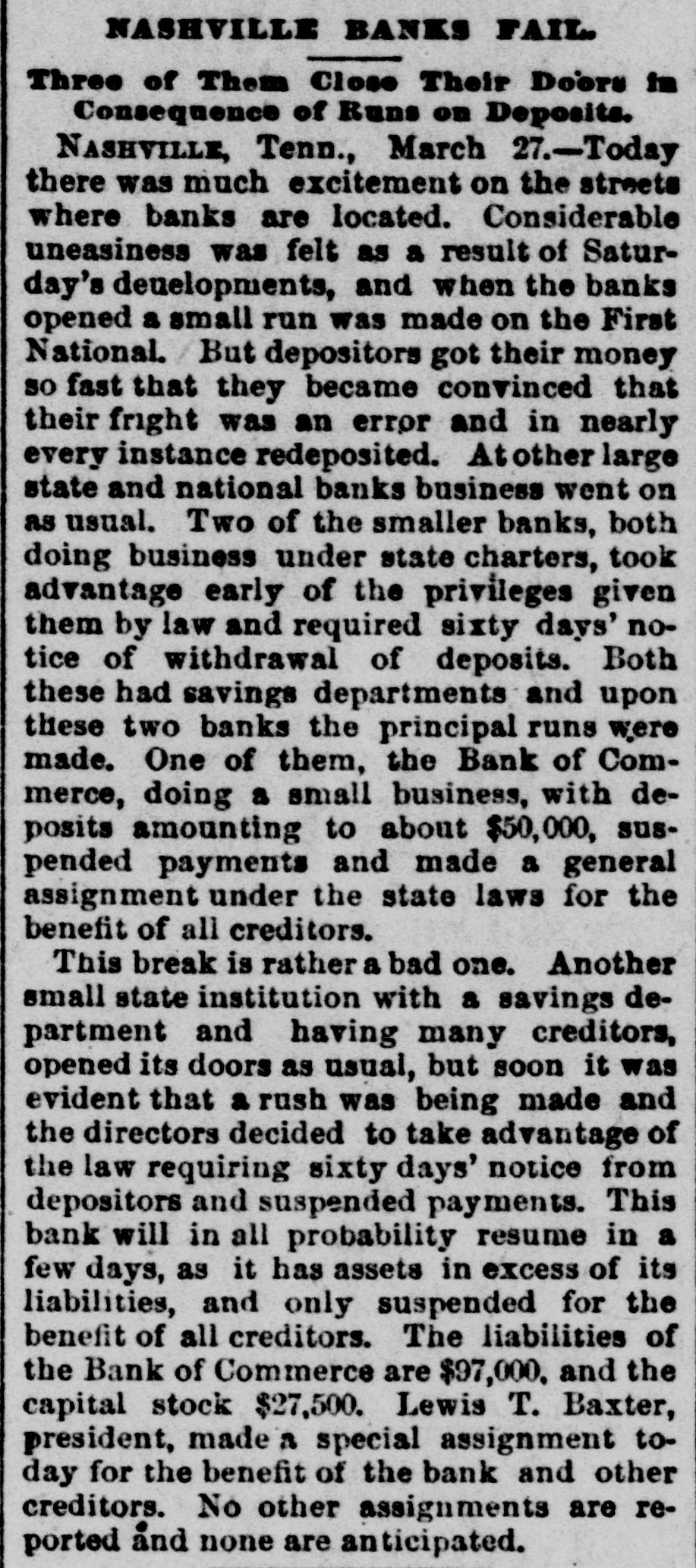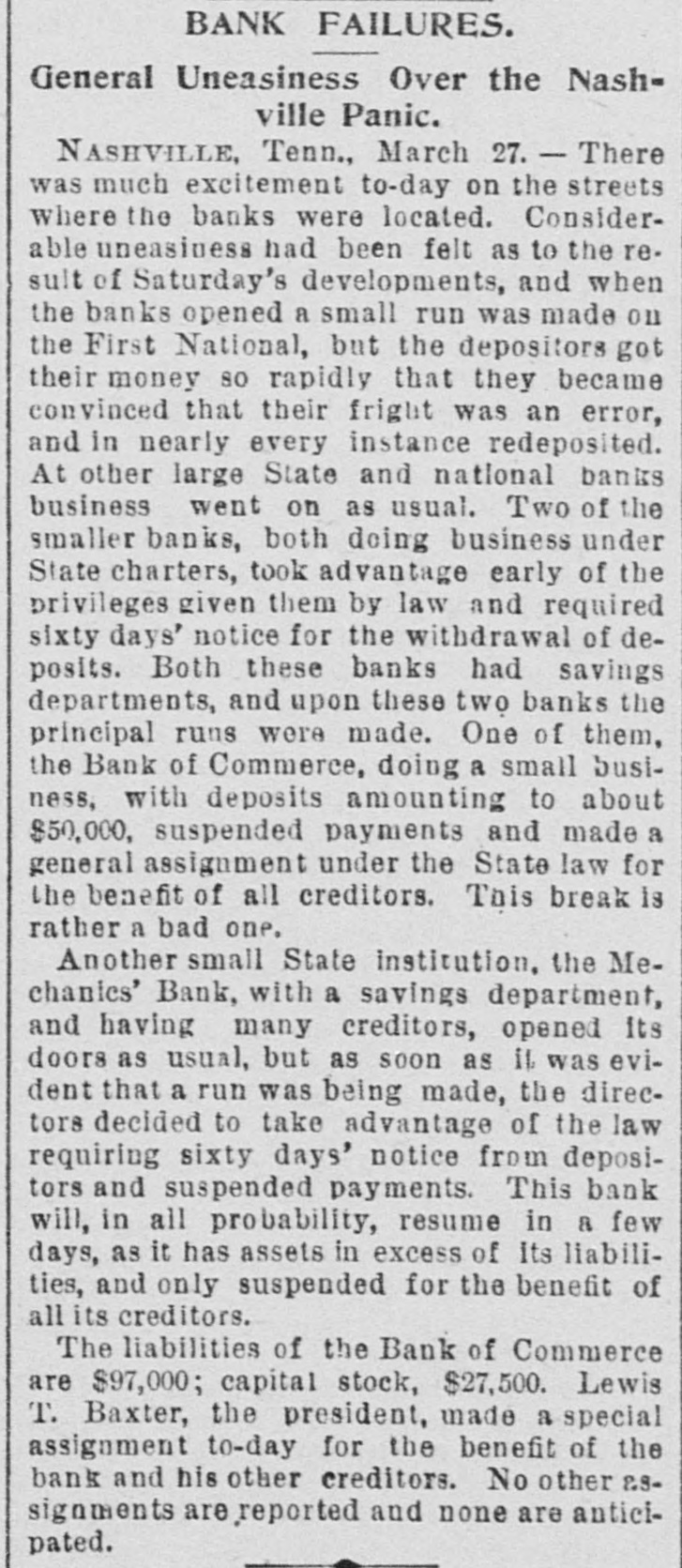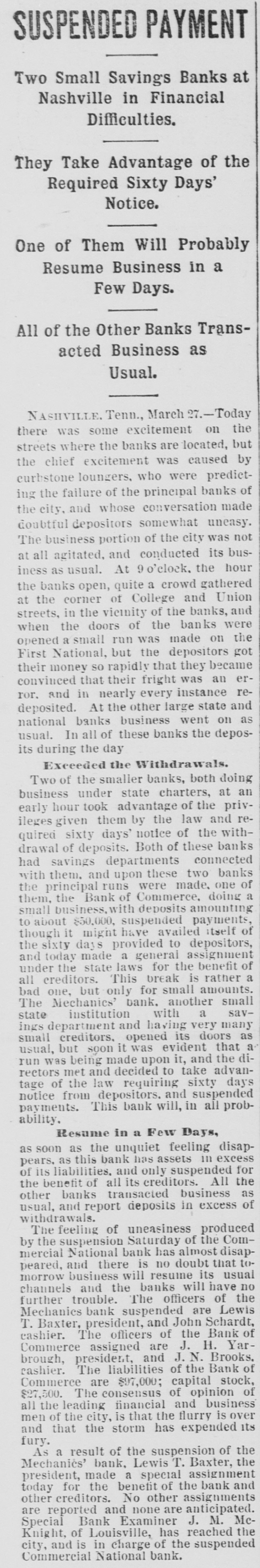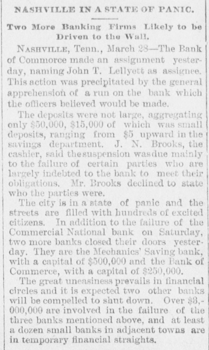 A PANIC IN NASHVILLE. TWO MORE BANKS FAIL AND TWO MORE EXPECTED TO SHUT DOWN. Besides the Commercial, the Mechanics' Savings Bank and the Bank of Cominerce Suspend-The Cause Assigned. NASHVILLE, TENN., March 27.-The Bank of Commerce failed to-day, while a other bank, the Mechanics' Savings Bank, fearing a run that it would not be able to meet, took advantage of a standing rule, and required depositors to give sixty days' notice of the withdrawal of deposits. It has been a squally day in Nashville, and, but for the fact that the banks had time between Saturday night and this morning to prepare themselves, there might have been more trouble. With the exception of the Bank of Commerce, however, all the Nashville banks are perfectly silvent, but, of course, do not keep money on hand to pay off all depositors on sudden demand. Since Saturday, however, the larger banks had secured from one hundred thousand to a half million dollars each. To-day when the doors were opened great stacks of currency were piled up on the teller'r desk and in a plain view inside the vaults. All the Nashville banks are located near College and Union streets, and this morning before 9 o'clock the pavements were crowded mostly, however, by idlers. There were many people itching to see a general run, but they were disappointed. All the banks opened for business, except the Bank of Commerce, which at 10 o'clock posted a notice of assignment. This bank had about decided to make an assignment last week. Its statement is $19,000; profit and loss. $22,000; total, $97,000. as follows:Assets-Notes discounted,$76,000 Liabilities: Capital stock paid in, $27,500; deposits, savings acount, $14,000; deposits, special account, $15,000; general deposits real estate and cash, $21,700; total, $97,700. The fact that it did not open its doors increased the nervous feeling to some extent, and the Mechanics' Saving's Bank directors decided that the best plan for them would be to require depositors to give sixty days' notice of withdrawal as provided in their rules. They therefore announced this would be enforced. It is thought the Mechanics' Bank will resume business as usual in a day or two, as soon as the nervous feeling has been entirely abated. With very few exceptions the people who drew their money from the other were small depositors. Those having large accounts were satisfied of their safety, and interviews to-night with all the leading bankers show their friends have come to the rescue, and that today's deposits are in excess of what was drawn out. At the American National Bank a notice was displayed in the window that a dozen of the wealthiest men in Nashville, whose names were signed thereto, pledged their personal estates to secure all depositors. One of the signers to this was General W. H. Jackson, owner of Belle Mead. The statement of the Commercial Bank, which failed Saturday, is as follows: Assets-Loans and discounts, $1,600,000. Cash and cash items, $144,000. Due from reserve agents, $2,000,000. Due from other banks, $225,000. Stocks, bonds and other securities, $125,000. Total, $2,294,000. Liabilities, individual deposits, $685,000. Certificates of deposits, $93,000. Bank deposits, $550,000. Rediscounts, $150,000; bills payable, $2,000. Total, $1,678,000. Capital stock, $500,000; surplus, $100,000; undivided profits, $95,000; total, $695,000.