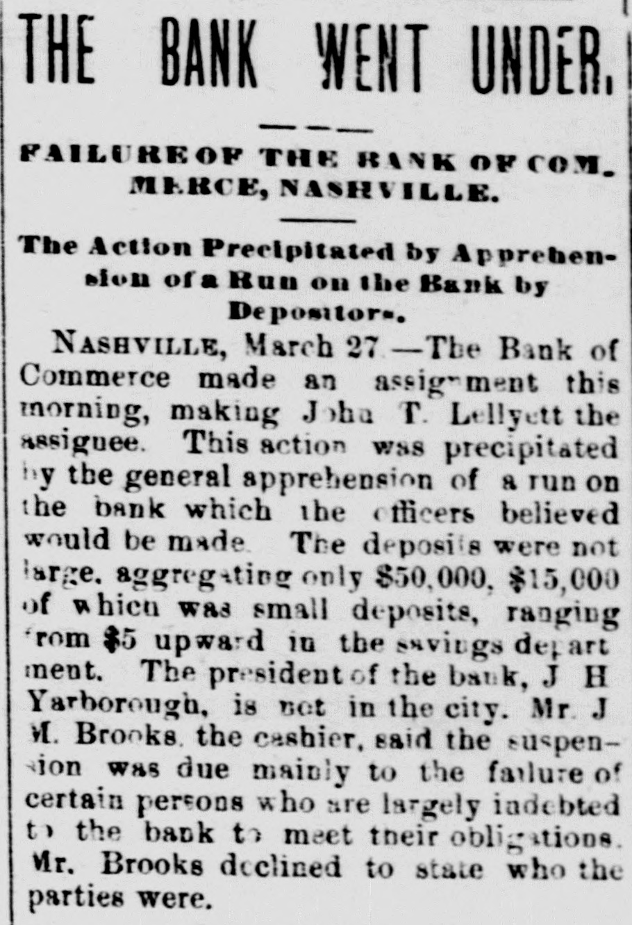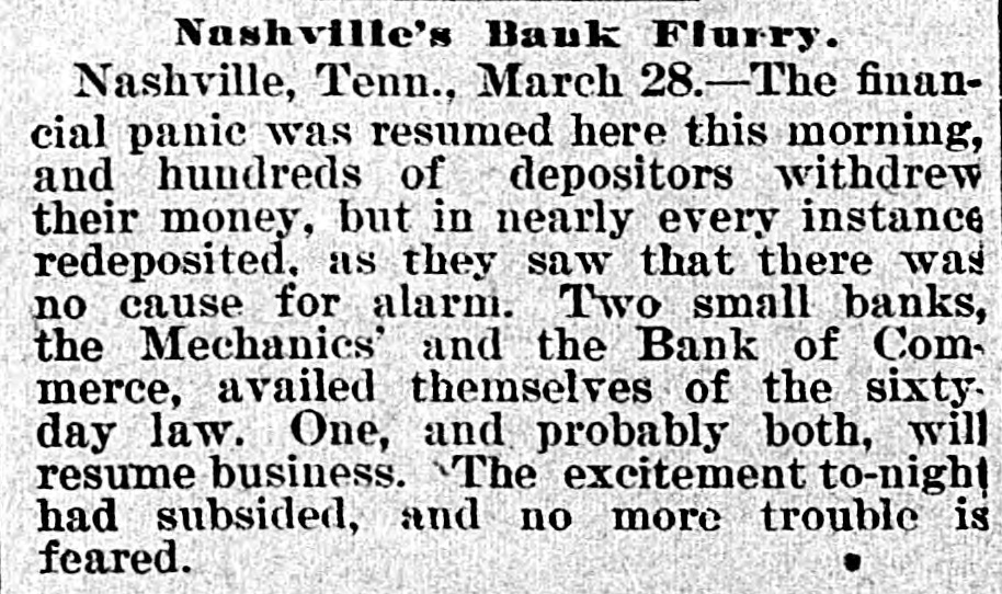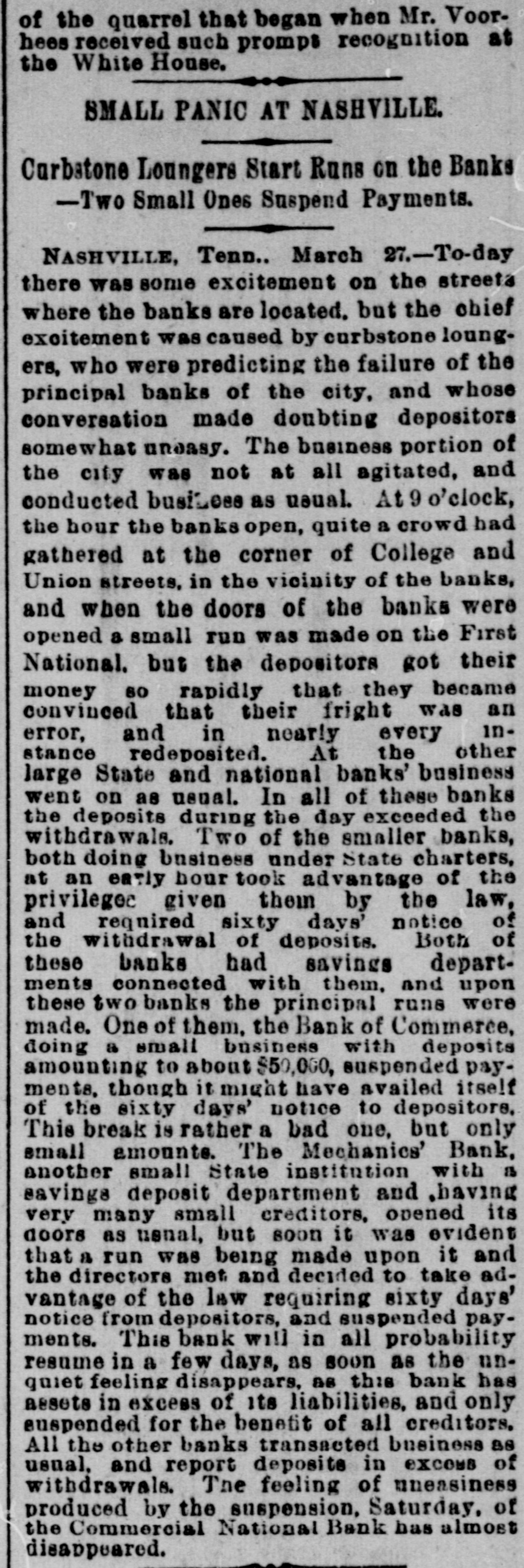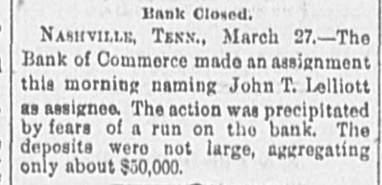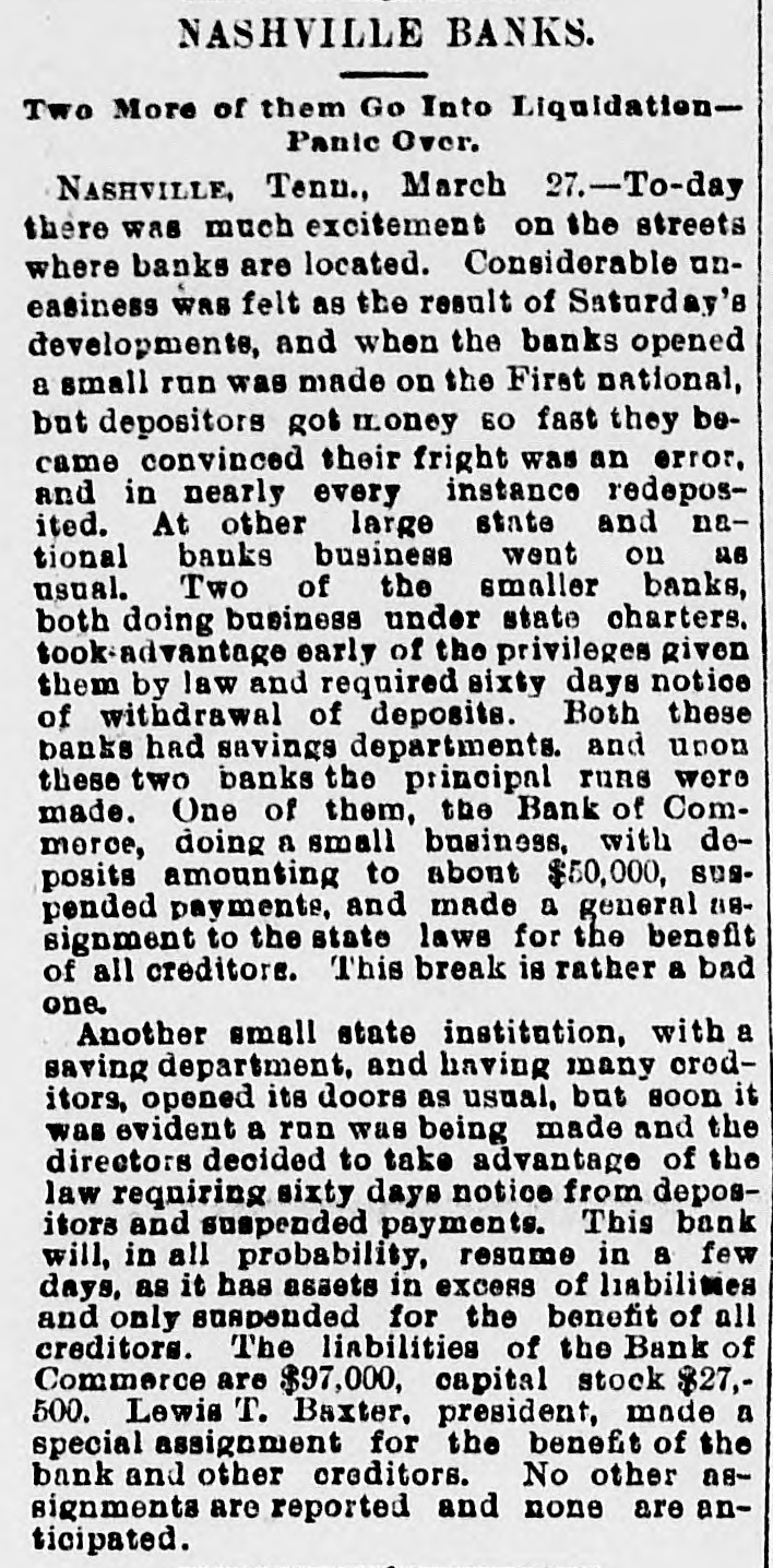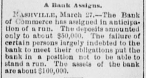 A PANIC IN NASHVILLE. TWO MORE BANKS FAIL AND TWO MORE EXPECTED TO SHUT DOWN. Besides the Commercial, the Mechanics' Savings Bank and the Bank of Cominerce Suspend-The Cause Assigned. NASHVILLE, TENN., March 27.-The Bank of Commerce failed to-day, while a other bank, the Mechanics' Savings Bank, fearing a run that it would not be able to meet, took advantage of a standing rule, and required depositors to give sixty days' notice of the withdrawal of deposits. It has been a squally day in Nashville, and, but for the fact that the banks had time between Saturday night and this morning to prepare themselves, there might have been more trouble. With the exception of the Bank of Commerce, however, all the Nashville banks are perfectly silvent, but, of course, do not keep money on hand to pay off all depositors on sudden demand. Since Saturday, however, the larger banks had secured from one hundred thousand to a half million dollars each. To-day when the doors were opened great stacks of currency were piled up on the teller'r desk and in a plain view inside the vaults. All the Nashville banks are located near College and Union streets, and this morning before 9 o'clock the pavements were crowded mostly, however, by idlers. There were many people itching to see a general run, but they were disappointed. All the banks opened for business, except the Bank of Commerce, which at 10 o'clock posted a notice of assignment. This bank had about decided to make an assignment last week. Its statement is $19,000; profit and loss. $22,000; total, $97,000. as follows:Assets-Notes discounted,$76,000 Liabilities: Capital stock paid in, $27,500; deposits, savings acount, $14,000; deposits, special account, $15,000; general deposits real estate and cash, $21,700; total, $97,700. The fact that it did not open its doors increased the nervous feeling to some extent, and the Mechanics' Saving's Bank directors decided that the best plan for them would be to require depositors to give sixty days' notice of withdrawal as provided in their rules. They therefore announced this would be enforced. It is thought the Mechanics' Bank will resume business as usual in a day or two, as soon as the nervous feeling has been entirely abated. With very few exceptions the people who drew their money from the other were small depositors. Those having large accounts were satisfied of their safety, and interviews to-night with all the leading bankers show their friends have come to the rescue, and that today's deposits are in excess of what was drawn out. At the American National Bank a notice was displayed in the window that a dozen of the wealthiest men in Nashville, whose names were signed thereto, pledged their personal estates to secure all depositors. One of the signers to this was General W. H. Jackson, owner of Belle Mead. The statement of the Commercial Bank, which failed Saturday, is as follows: Assets-Loans and discounts, $1,600,000. Cash and cash items, $144,000. Due from reserve agents, $2,000,000. Due from other banks, $225,000. Stocks, bonds and other securities, $125,000. Total, $2,294,000. Liabilities, individual deposits, $685,000. Certificates of deposits, $93,000. Bank deposits, $550,000. Rediscounts, $150,000; bills payable, $2,000. Total, $1,678,000. Capital stock, $500,000; surplus, $100,000; undivided profits, $95,000; total, $695,000.