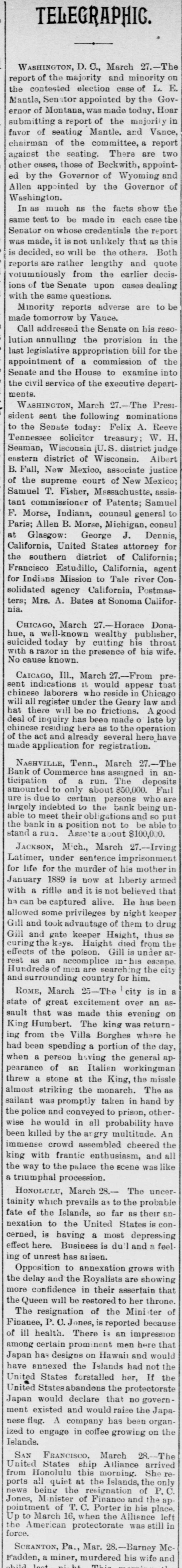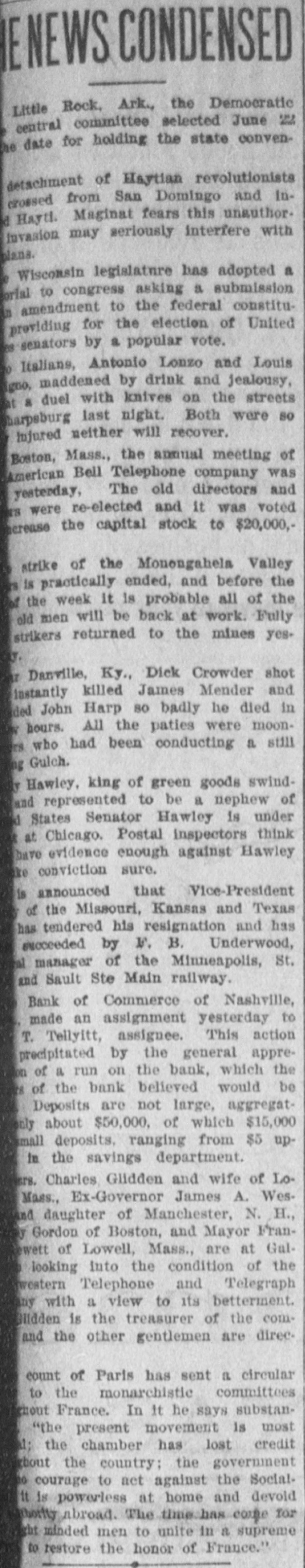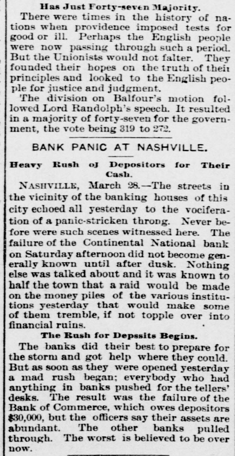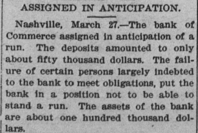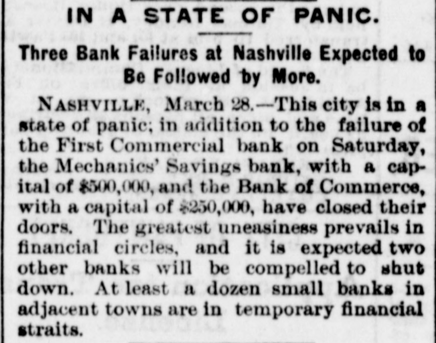 A PANIC IN NASHVILLE. TWO MORE BANKS FAIL AND TWO MORE EXPECTED TO SHUT DOWN. Besides the Commercial, the Mechanics' Savings Bank and the Bank of Cominerce Suspend-The Cause Assigned. NASHVILLE, TENN., March 27.-The Bank of Commerce failed to-day, while a other bank, the Mechanics' Savings Bank, fearing a run that it would not be able to meet, took advantage of a standing rule, and required depositors to give sixty days' notice of the withdrawal of deposits. It has been a squally day in Nashville, and, but for the fact that the banks had time between Saturday night and this morning to prepare themselves, there might have been more trouble. With the exception of the Bank of Commerce, however, all the Nashville banks are perfectly silvent, but, of course, do not keep money on hand to pay off all depositors on sudden demand. Since Saturday, however, the larger banks had secured from one hundred thousand to a half million dollars each. To-day when the doors were opened great stacks of currency were piled up on the teller'r desk and in a plain view inside the vaults. All the Nashville banks are located near College and Union streets, and this morning before 9 o'clock the pavements were crowded mostly, however, by idlers. There were many people itching to see a general run, but they were disappointed. All the banks opened for business, except the Bank of Commerce, which at 10 o'clock posted a notice of assignment. This bank had about decided to make an assignment last week. Its statement is $19,000; profit and loss. $22,000; total, $97,000. as follows:Assets-Notes discounted,$76,000 Liabilities: Capital stock paid in, $27,500; deposits, savings acount, $14,000; deposits, special account, $15,000; general deposits real estate and cash, $21,700; total, $97,700. The fact that it did not open its doors increased the nervous feeling to some extent, and the Mechanics' Saving's Bank directors decided that the best plan for them would be to require depositors to give sixty days' notice of withdrawal as provided in their rules. They therefore announced this would be enforced. It is thought the Mechanics' Bank will resume business as usual in a day or two, as soon as the nervous feeling has been entirely abated. With very few exceptions the people who drew their money from the other were small depositors. Those having large accounts were satisfied of their safety, and interviews to-night with all the leading bankers show their friends have come to the rescue, and that today's deposits are in excess of what was drawn out. At the American National Bank a notice was displayed in the window that a dozen of the wealthiest men in Nashville, whose names were signed thereto, pledged their personal estates to secure all depositors. One of the signers to this was General W. H. Jackson, owner of Belle Mead. The statement of the Commercial Bank, which failed Saturday, is as follows: Assets-Loans and discounts, $1,600,000. Cash and cash items, $144,000. Due from reserve agents, $2,000,000. Due from other banks, $225,000. Stocks, bonds and other securities, $125,000. Total, $2,294,000. Liabilities, individual deposits, $685,000. Certificates of deposits, $93,000. Bank deposits, $550,000. Rediscounts, $150,000; bills payable, $2,000. Total, $1,678,000. Capital stock, $500,000; surplus, $100,000; undivided profits, $95,000; total, $695,000.