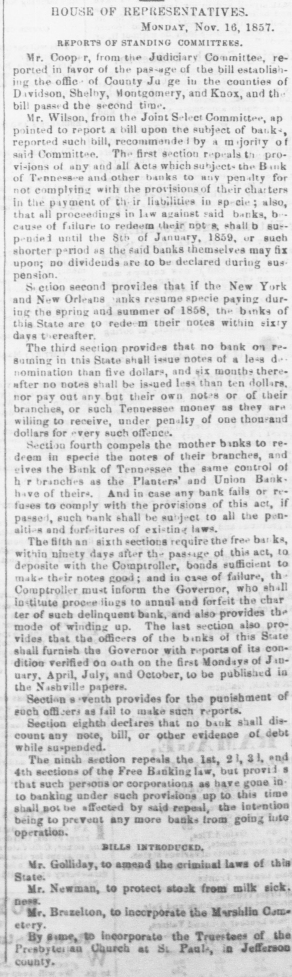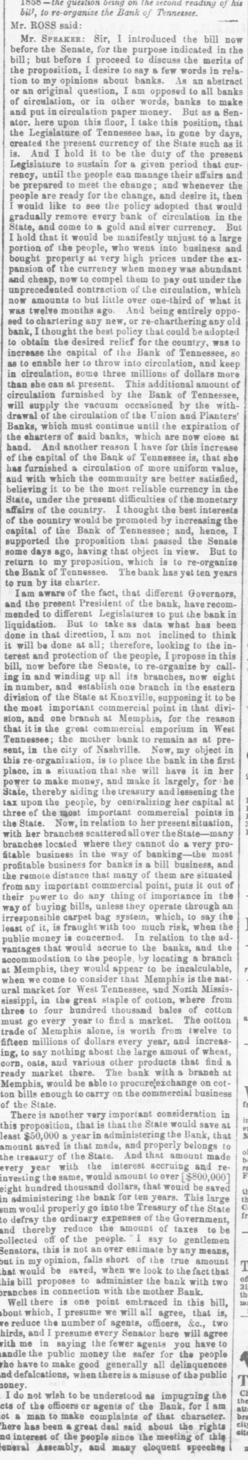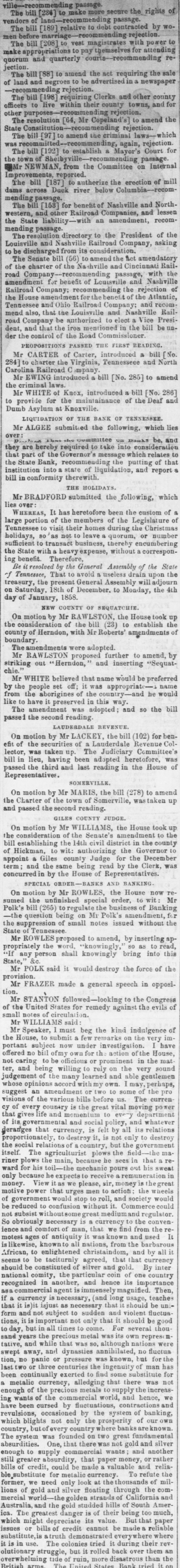 Mr Speaker, I must beg the kind indulgence of the House, to submit a few remarks on the very important subject now under investigation. I have offered no bill of my own for the action of the House, not caring to be officious or prominent in the matter, and being willing to rely on the very sound judgement of the many learned and able gentlemen whose opinions accord with my own. I may, perhaps, suggest an amendment or two to some of the provisions of the various bills before us. The currency of every country is the great vital moving power that gives life and momentum to every department of its governmental and social policy, and whatever deranges that currency, is felt by all its relations proportionately, to destroy it, is not only to destroy the social relations of a country, but the government itself. The agriculturist plows the field-the mariner plows the main, because he sees in that a reward for his toil-the mechanic pours out his sweat only because he expects to receive a remuneration in money. View it as we please, sir, money is the great motive power that urges men to action; the wheels of government would stop to roll, and society would be reduced to confusion without it. Commerce could not subsist without some great medium and regulator. So obviously necessary is a currency to the convenience and comfort of man, that we find from the remotest ages of antiquity it was known and used It is likewise, knownto ali nations, from the barbarous African, to enlightened christaindom, and by all it seems to be taciturnly agreed, that that currency should be constituted of silver and gold. By international comity, the particular coin of one country recognized in another, and hence its importance asa commercial agent is immensely magnified. Then, if a currency is necessary, (and long usage, teaches that it is)it isjust as necessary that it should be uniform and not subject to sudden and violent fluctuations, it is important not only that it should be good to day, but in all times to come. For several thousand years the precious metal was its own represon-tative, and while that was so, although nations were swept away, and dynasties annihilated, no fluctuation, no panic or pressure was known, but for the last two or three centuries the ingenuity of man has been continually exerted to find some substitute for a metalic currency, alledging that there was not enough of the precious metals to supply the increasing wants of the commercial world, and hence, we have been cursed by fluctuatious, contractions and revulsions, occasioned by the system of banking, which blights not only the prosperity of our own country, but of every country where banks are known.