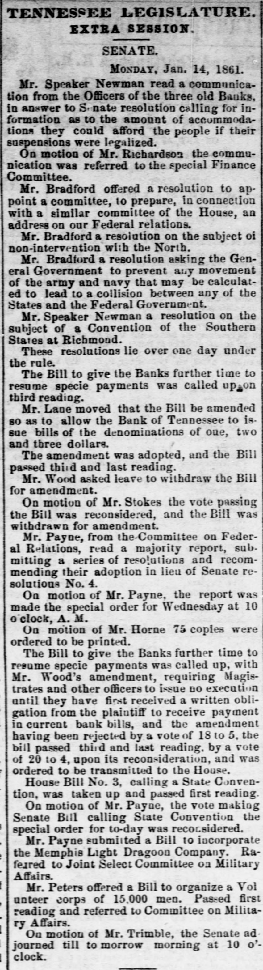 Be it resolved by the General Assembly of the State of Tennessee, That to avoid a useless drain upon the treasury, the present General Assembly will adjourn on Saturday, 18th of December, to Monday, the 4th day of January, 1858.