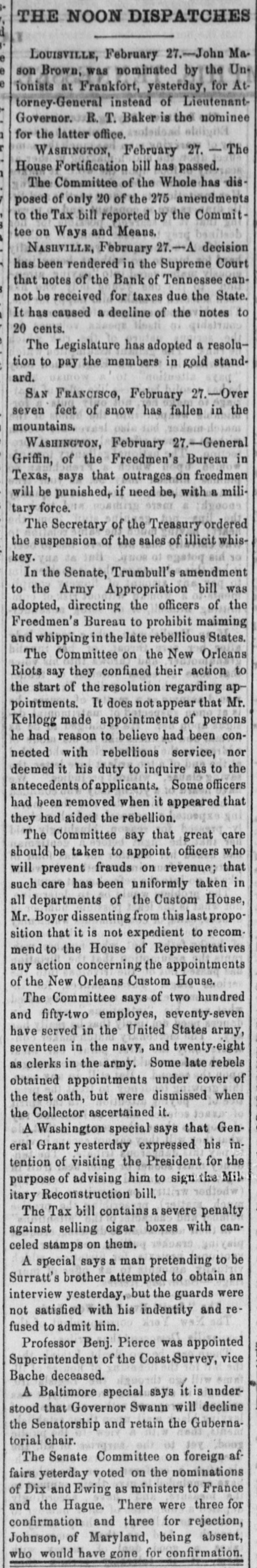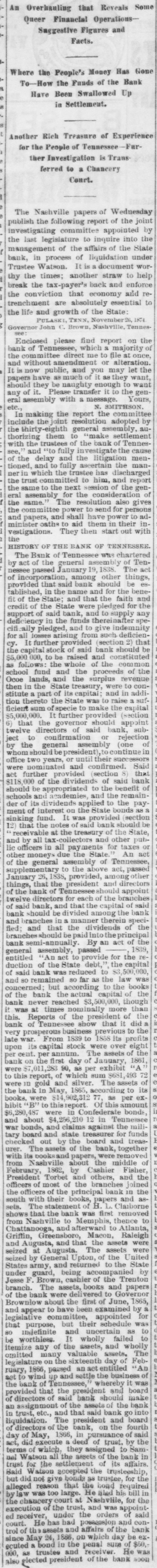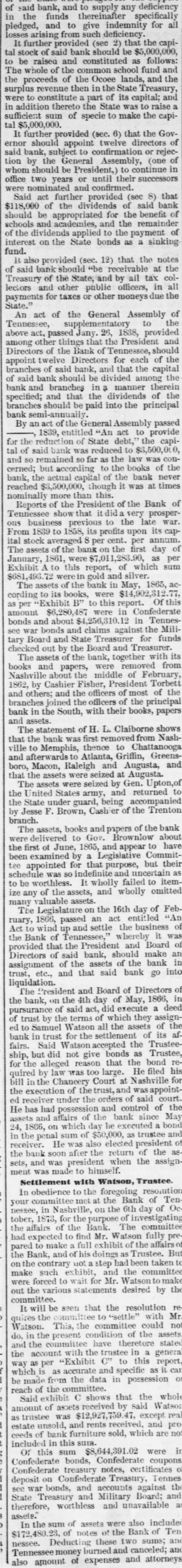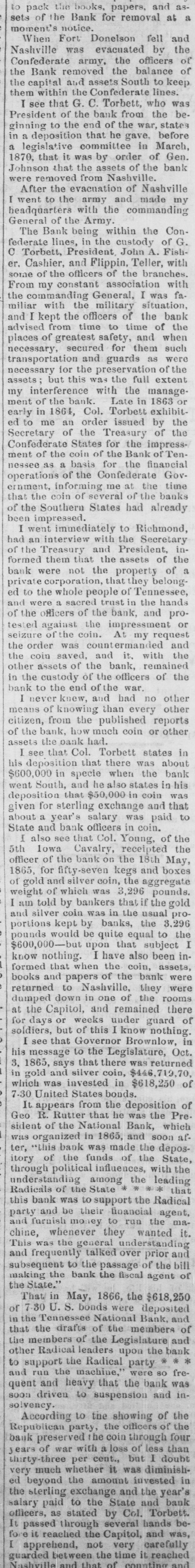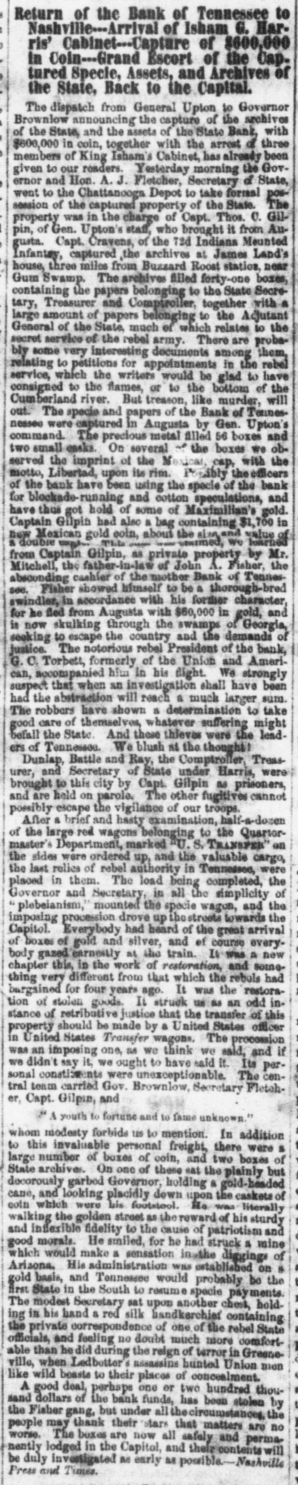 Return of the Bank of Tennessee to Nashville--Arrival of Isham G. Harris' Cabinet--Capture of $600,000 in Coin--Grand Escort of the Cap. tured Specie, Assets, and Archives of the State, Back to the Capital. The dispatch from General Upton to Governor Brownlow announcing the capture of the archives of the State, and the assets of State Bank, with $600,000 in coin, together with the arrest of three members of King Isham's Cabinet, has already been given to our readers. Yesterday morning the Governor and Hon. A. J. Fletcher, Secretary of State, went to the Chattanooga Depot to take formal possession of the captured property of the State. The property was in the charge of Capt. Thos. C. Gilpin, of Gen. Upton's staff, who brought it from Augusta. Capt. Cravens, of the 72d Indiana Meunted Infantry, captured the archives at James Land's house, three miles from Buzzard Roost station, near Gum Swamp. The archives filled forty-one boxes, containing the papers belonging to the State Secretary, Treasurer and Comptroller, together with & large amount of papers belonging to the Adjutant General of the State, much of which relates to the secret service of the rebel army. There are probably some very interesting documents among them, relating to petitions for appointments in the rebel service, which the writers would be glad to have consigned to the flames, or to the bottom of the Cumberland river. But treason, like murder, will out." The specio and papers of the Bank of Tennesnessee were exptured in Augusta by Gen. Upton's command. The precious metal filled 56 boxes and two small-easks. On several - the boxes we observed the imprint of the Mexical, cap, with the motto, Libertad, upon its rim. Posibly the efficers of the bank have been using the specie of the bank for blockade running and cotton speculations, and have thus got hold of some of Maximilian's gold. Captain Gilpin had also a bag containing $1,700 in new Mexican gold coin, about the size, value of & double english. This - - wasimed, We loarned from Captain Gilpin, as private property by Mr. Mitchell, the father-in-law of John A. Fisher, the absconding cashier of the mother Bank of Tennessee. Fisher showed hitnself to be a thorough-bred swindler, in accordance with his forther character, for he fled from Augusta with $60,000 in gold, and is now skulking through the swamps of Georgia, seeking to escape the country and the demands of justice. The notorious rebel President of the bank, G. 0, Torbett, formerly of the Union and American, accompanied him In his flight. We strongly suspect that when an investigation shall have been had the abstraction will reach a much larger sum. The robbers have shown & determination to take good care of themselves, whatever suffering might befall the State. And these thleves were the lenders of Tennessee. We blush at the thought! Dunlap, Battle and Ray, the Comptroller, Treasurer, and Secretary of State under Harris, were brought to this city by Capt. Gilpin M prisoners, and are held on parole. The other fugitives cannot possibly escape the vigilance of our troops. After a brief and hasty examination, half-a-dozen of the large red wagons belonging to the Quartormaster's Department, marked "U. S. TRANSFER" on the sides were ordered up, and the valuable cargo, the last relies of rebel authority in Tennessee, were placed in them. The load being completed, the Governor and Secretary, in all the simplicity of plebelanism," mounted the specie wagon, and the imposing procession drove up thostreets towards the Capitol. Everybody had heard of the great arrival of boxes of gold and silver, and of course everybody gazed earnestly at the train. It was a new chapter this, in the work of restoration, and soinething very different from that which the rebuls had burgained for four years ago. It was the restoration of stolen goods. It struck us as an odd instance of retributive justice that the transfer of this property should be made by a United States officer in United States Transfer wagons. The procession was an imposing one, as we think we said, and if we didn't say it, we ought to have said It. Its personal constituents were unexceptionable. The central team carried Gov. Brownlow, Secretary Fletcher, Capt. Gilpin, and , A youth to fortune and to fame unknown." whom modesty forbids us to mention. In addition to this invaluable personal freight, there were a large number of boxes of coin, and two boxes of State archives. On one of these eat the plainly but decorously garbed Governor, holding a gold-headed cane, and looking placidly down upon the caskets of coin which were his footstool. Ho was literally walking the golden street as the reward of his sturdy and inflexible fidelity to the cause of patriotism and good morals. He smiled, for he had struck a mine which would make a sensation in-the diggings of Arizona. His administration was established on # gold basis, and Tennessee would probably be the first State in the South to resume specie payments. The modest Secretary sat upon another chest, holding in his hand a red silk handkerchief containing the private correspondence of one of the rebel State officials, and feeling no doubt much more comfortable than he did during the reign of terror in Greeneville, when Ledbetter's assassins hunted Union men like wild boasts to their places of concealment. A good deal, perhaps one or two hundred thousand dollars of the bank funds, has been stolen by the Fisher gang, but under all the circumstances, the people may thank their stars that matters are no worse. The boxes are now all safuly and permanently lodged in the Capitol, and their contents will be duly investigated M early M possible.-Nashville Eness 1