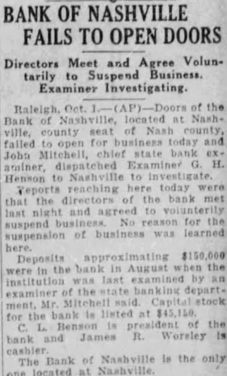 BANK OF NASHVILLE FAILS TO OPEN DOORS Directors Meet and Agree VolunExaminer Investigating. Raleigh the located county Nash falled for and John aminer, Henson Nashville reaching today bank last and agreed reason for suspend of business learned suspension Deposits August last examined the Benson the Nashville is the only The