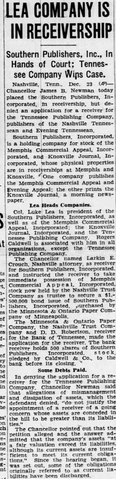 Lea Heads Companies. Col. Luke Lea president of the well the Memphis Commercial as Incorporated: the Knoxville Journal, Incorporated the Tennessee Publishing Company Rogers Caldwell associated with him all organizations, except the Tennessee Publishing Company The Chancellor named Larkin Nashville for and instructed the receiver to take immediate Memphis Commercial stock now held the Nashville Trust Company trustee to secure $1.issue Southern Pubthe Paper ComThe Ontario Paper Company, the Nashville Trust Company and Robertson, receiver for the Bank of Tennessee, made the application for the receiver. The bank shares of Southern pledged by Caldwell Co., to the bank closing.