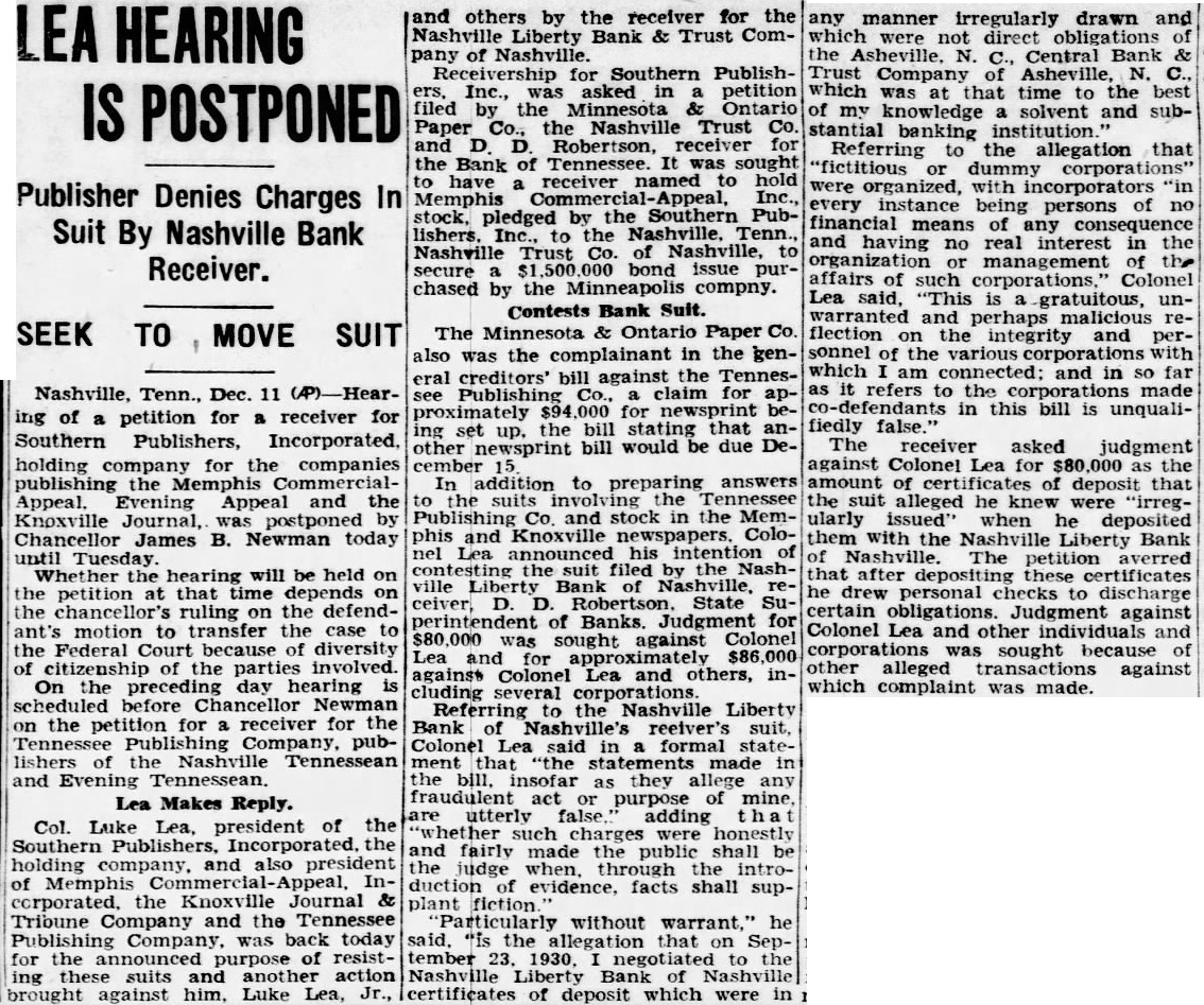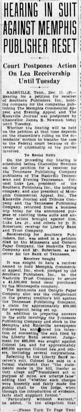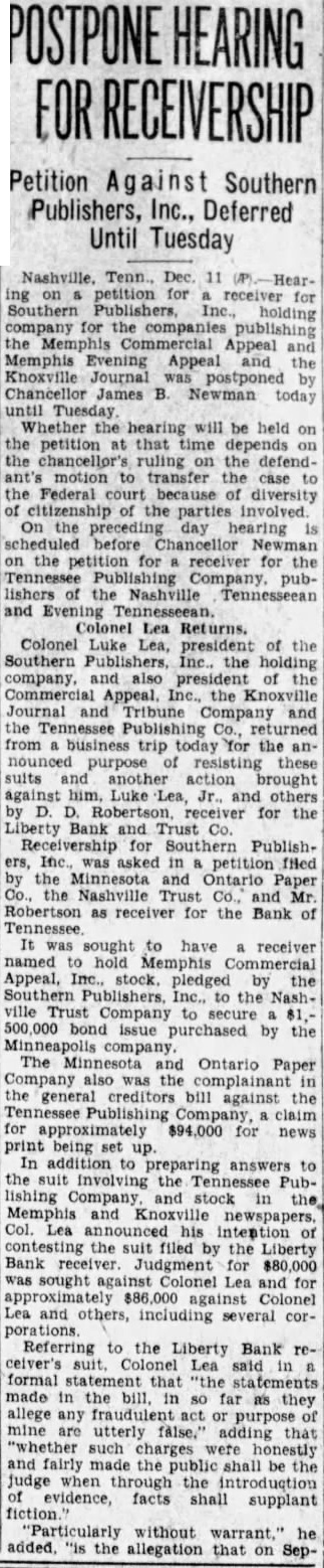 Nashville, Tenn. Dec. 11 ing on petition for receiver for Southern Publishers, Inc., holding company for the companies publishing the Memphis Commercial Appeal and Memphis Evening Appeal and the Knoxville Journal was postponed by Chancellor James B. Newman today until Tuesday Whether the hearing will be held on the petition at that time depends on the chancellor's ruling on the defendant's motion to transfer the case to the Federal court because of diversity of citizenship of the involved On the preceding day hearing is scheduled before Chancellor Newman on the petition for receiver for the Tennessee Publishing Company, publishers the Nashville Tennesseean and Evening Tennesseean. Colonel Lea Returns. Colonel Luke Lea, president of the Southern Publishers, Inc. the holding company, and also of the Commercial Appeal. Inc., the Knoxville Journal and Tribune Company and the Tennessee Publishing Co., returned from business trip today for the announced purpose of resisting these suits and another action brought against him Luke Lea, Jr., and others by D. Robertson for the Liberty Bank and Trust Co. Receivership for Southern Publishthe Minnesota and Ontario Paper Co., the Nashville Trust Co., and Mr Robertson as receiver for the Bank of Tennessee It was sought to have receiver named hold Memphis Commercial Appeal, stock pledged by the Southern Publishers, Inc. to the Nashville Trust Company to secure 500 000 bond issue purchased by the Minneapolis The Minnesota and Ontario Paper Company also was the complainant in the general creditors bill against the for approximately $94,000 for news print being set In addition to preparing answers to the suit involving the Tennessee Publishing Company and stock in the Memphis and Knoxville newspapers, Col. Lea announced his intention of contesting the suit filed by the Liberty Bank Judgment for $80,000 was sought against Colonel Lea and for $86,000 Colonel Lea and others, several corReferring to the Liberty Bank receiver's Colonel Lea said in formal statement that statements made in the bill in so far as they allege any fraudulent act or purpose of mine are utterly false.' adding that "whether such charges were honestly and fairly made the public shall be the judge when through the introduction of evidence, facts shall supplant fiction "Particularly without warrant." he added. "is the allegation that on Sep-