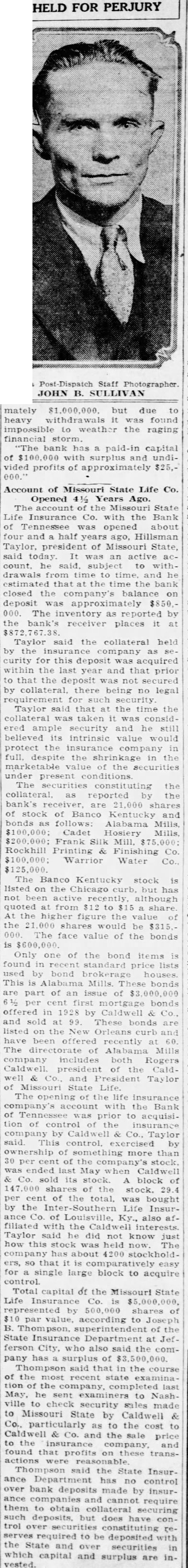 Account of Missouri State Life Co. Opened Years Ago. The account the Missouri State Life Insurance with the Bank of Tennessee opened about four and half ago, Hillsman Taylor, president of Missouri State, said today. It an active said, subject drawals from time to time, and he estimated that the time the bank closed company's balance on deposit approximately $850.000. The inventory as reported by the bank's receiver places Taylor said the collateral held by the curity for deposit acquired within the last year and that prior to that the deposit was secured by collateral, there being no legal requirement for security Taylor said that the time the collateral taken was considample security and he still believed its intrinsic value would protect the insurance company full, despite the shrinkage the the under present The the as reported by the bank's shares of stock Banco Kentucky and bonds follows: Alabama Cadet Hosiery Frank Silk Rockhill Printing Finishing $100,000; Warrior Water The Banco Kentucky stock listed on the Chicago but has not been active although quoted from to share At the higher figure the value the shares would be $315, The face value of the bonds Only one of the bond items found standard lists used by bond This Mills. bonds part of issue first mortgage bonds offered in 1928 by Caldwell and sold These bonds listed the New Orleans curb been offered recently The directorate Alabama Mills company includes both Rogers president the Caldwell and President of Missouri State Life. The opening the company's account the Bank of prior acquisition of control the company by Caldwell said. by ownership of more than 30 of the stock, ended last May when Caldwell sold its stock. block of the stock. of the total. was bought by the Life Insurance Co. of Ky., also filiated the Caldwell interests. Taylor said he did not know how this stock was held The company has about that easy for single large block to acquire Total capital of the Missouri State Life Insurance Co. represented shares of $10 par value, according to of State Insurance Department ferson City, also said the company has surplus of said that in the course of the recent state the company, completed last he sent examiners to ville to check security sales made to Missouri State by Caldwell Co., particularly to the cost Caldwell and the price to the insurance and found that these transactions reasonable. Thompson the State Insurance Department has no control bank deposits made by insurcompanies and cannot require them to obtain collateral such but does have trol to deposited with the State and over securities which capital and surplus are invested.