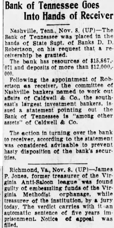 The one of Knoxville's three National Banks, closed today. Its failure to open was preceded by an nouncement issued directors that the bank had suspended operation. Heavy withdrawals during the past few days were given by directors as the reason it was necessary for the bank to close. While their statement did not say so, it is known that these were occasioned by the recent collapse of the strueture of Caldwell and Company of Nashville and the subsequent closing last Friday of the Bank of Tennessee, Caldwell's Nashville state bank which had several millions in public funds on deposit.