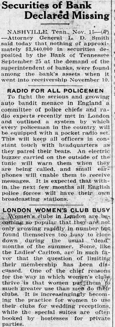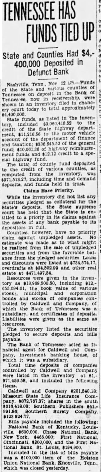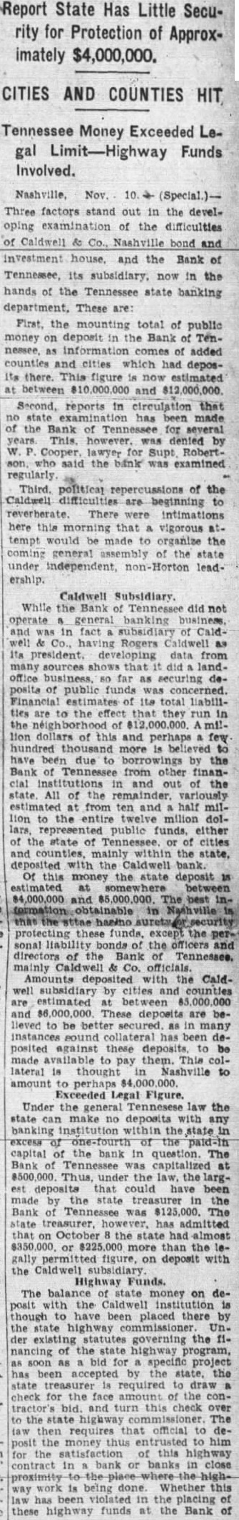 Caldwell Subsidiary. While the Bank Tennessee operate general business. fact Caldsources landbusiness. far depublic Financial estimates its total liabilities are the effect run lion dollars of this and perhaps hundred more believed have due borrowings from finanAll variously from ten and half the milion public funds, either of state cities and within the state, the Caldwell Of this money the state deposit estimated between and The the Bank mainly Caldwell Co. officials. deposited Caldwell subsidiary by cities and estimated and deposits are believed be posited against these deposits pay them. This lateral thought Nashville to amount Exceeded Legal Figure. Under the general Tennesese law the state make deposits capital the bank question. The Bank Thus, under the the could by treasurer the Bank admitted October state had almost $350,000 more than figure, on deposit with the Caldwell Highway Funds The money on dethe have placed there the Unexisting governing the nancing of the state highway bid specific project been accepted the required draw the face conthis check over The requires official demoney this highway contract in bank banks close proximity the being Whether this the placing highway funds the Bank of