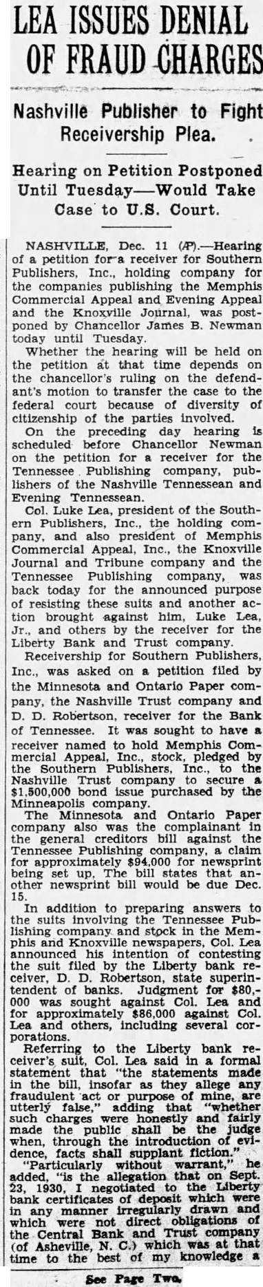 Col. Luke Lea, president of the Southern Publishers Incorporated. the holding company, and also president of Memphis Appeal, Incorporated, the Knoxville Journal & Tribune Company and the Tennessee Publishing Company, was back today for the announced purpose of resisting these suits and another action brought against him, Luke Lea, and others by the receiver for the Nashville Liberty Bank & Trust Company of Nashville. Receivership for Southern PublishInc., was asked in petition filed by the Minnesota Ontario Paper Co., the Nashville Trust Co. and D. D. Robertson, receiver for the Bank of Tennessee. It was sought chased by the Minneapolis compny. Contests Bank Sult. also was the complainant in the general creditors' bill against the Tennessee Publishing Co., claim for approximately $94,000 for newsprint being set up. the bill stating that another newsprint bill would be due December In addition to preparing answers to the suits invol ring the Tennessee Publishing Co. and stock in the phis and Knoxville newspapers. Colonel Lea announced his intention of the suit filed by the Nashville Liberty Bank Nashville, D. D. State Superintendent of Banks Judgment for $80,000 was sought against Colonel Lea and for approximately $86,000 against Colonel Lea and others, including several corporations. Referring to the Nashville Liberty Bank of Nashville's reeiver's suit, Colonel Lea said in formal statement that "the statements made in the bill. insofar as they allege any fraudulent act purpose of are utterly false adding that "whether such charges were honestly and fairly made the public shall be the judge through the introduction of evidence, facts shall supplant fiction Particularly without warrant." he said, "Is the allegation that on September negotiated to the Nashville Liberty Bank of Nashville certificates of deposit which were in any manner irregularly drawn and which were not direct obligations of the Asheville. N. C., Central Bank & Trust Company of Asheville, N. C., which was at that time to the best of my knowledge solvent and substantial banking institution Referring to the allegation that "fictitious or dummy corporations' were organized, with incorporators "in every instance being persons of no financial means of any consequence and having no real interest in the organization or management of the affairs of such corporations,' Colonel Lea said, "This gratuitous, unwarranted and perhaps malicious reflection on the integrity and personnel of the various corpora with which am connected: and in so far as it refers to the corporations made co-defendants in this bill is unqualifiedly false. The receiver asked judgment against Colonel Lea for $80,000 as the amount of certifica of deposit that the suit alleged he knew were "irregularly issued' when he deposited them with the Nashville Liberty Bank Nashville. The petition averred that after depositing these certificates he drew personal checks to discharge certain obligations. Judgment against Colonel Lea and other individuals and corporations was sought because of other alleged transactions against which complaint was made.