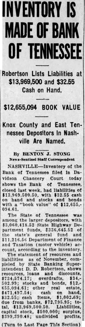 Thus, when the Bank of Tennessee closed, with liabilities its total cash on hand $32.55. The remainder of its assets consists of stocks and bonds with book value of $12,655,094.61. The liabilities and assets of the Bank at the time of closing have not yet been disclosed. The state government's deposits the and Bank Tennessee totalled 543.15, which the Nashville bank and in the bank Knoxville.
