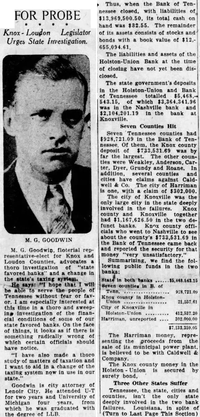 Goodwin. floterial for Knox Loudon Counties, thoro "state favored banks" change in state's taxing system. hope be people without fear especially this time and ing the financial conditions some of our state favored banks. On the face of things, looks there radically wrong which certain officials should have notice. have also made thoro matters taxation want aid change the taxing system now in use Goodwin is city attorney of Lenoir City. He attended U-T for two years and University of Michigan four years, from which he was graduated with the degree of LLB.